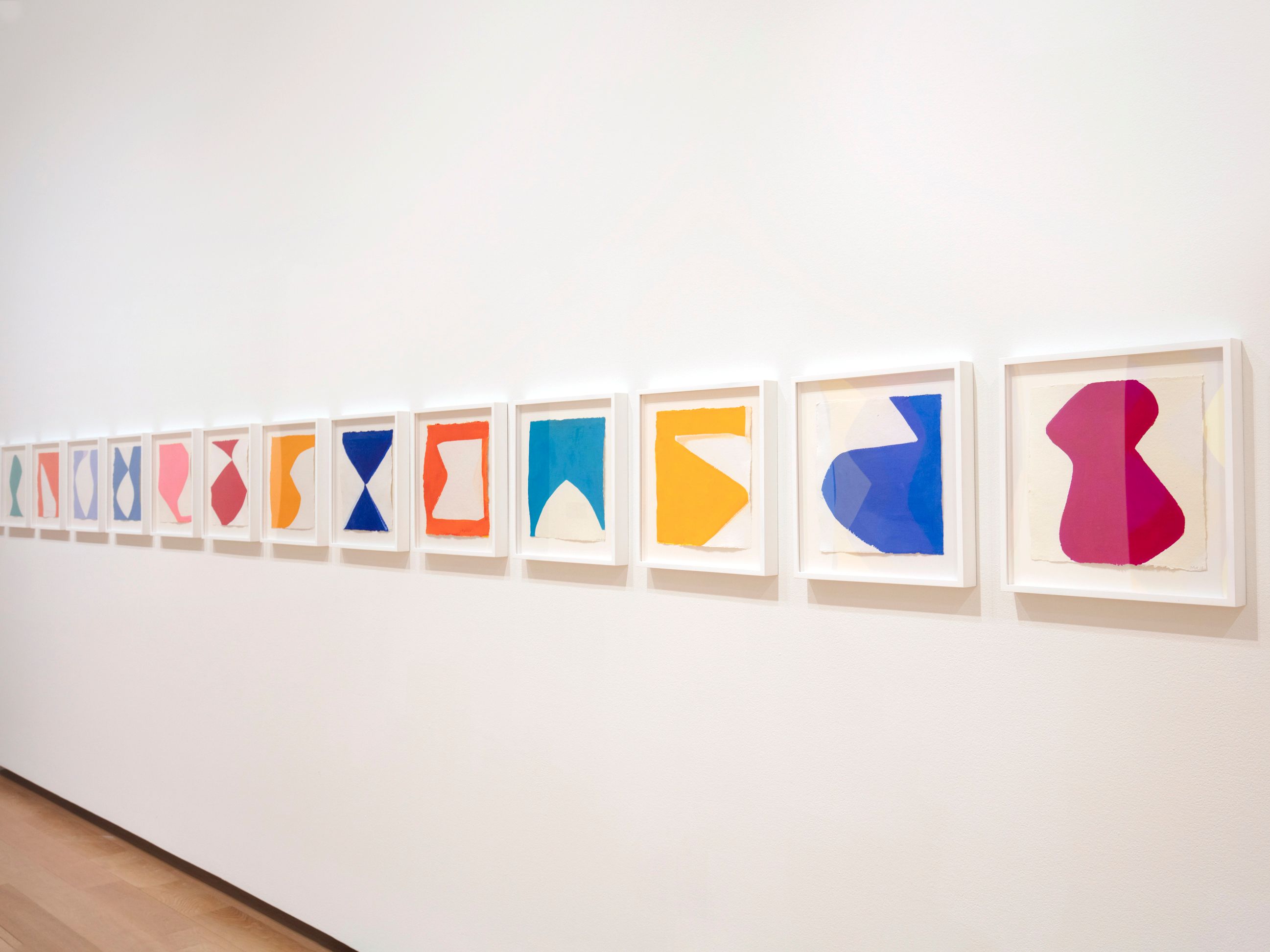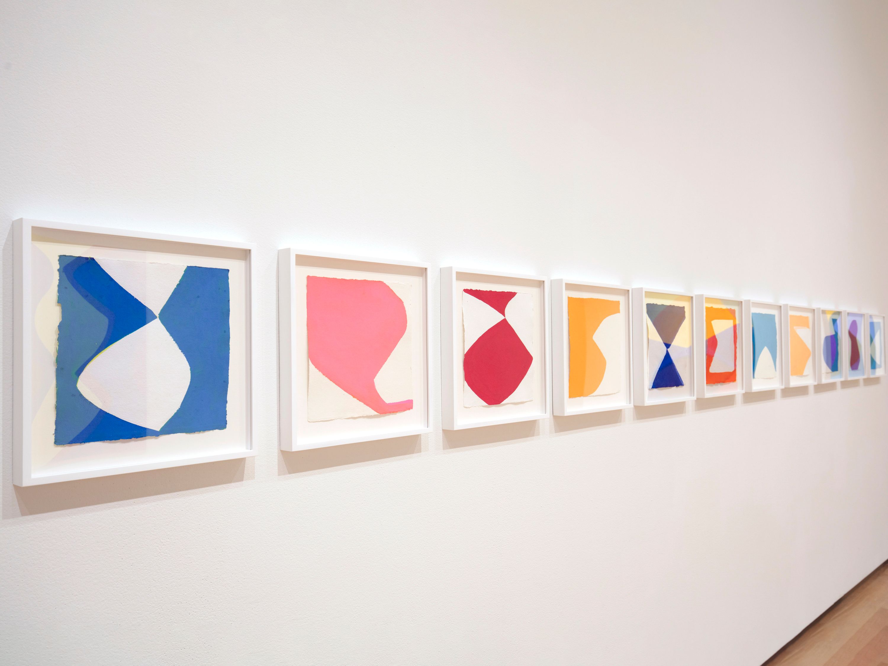 In addition to sketching directly on her canvases, Adams develops compositions in her works on paper, as seen in the NY Series. Each gouache in the series features a single shape made with one color on bright white, handmade Indian paper, blurring the distinction between positive and negative space. The NY Series influences her larger paintings but are not direct studies for them. Adams began the series in 2010 after seeing an exhibition at the Villa Medici in Rome that paired the American modernist Ellsworth Kelly’s hard-edged paintings with figurative drawings by the nineteenth-century Neoclassical French artist Jean-Auguste-Dominique Ingres. The unexpected pairing focused viewers’ attention on the treatments of curves in Kelly’s abstracted forms and in Ingres’s depictions of the human body—two very different approaches to shape that also reverberate throughout Adams’s oeuvre.