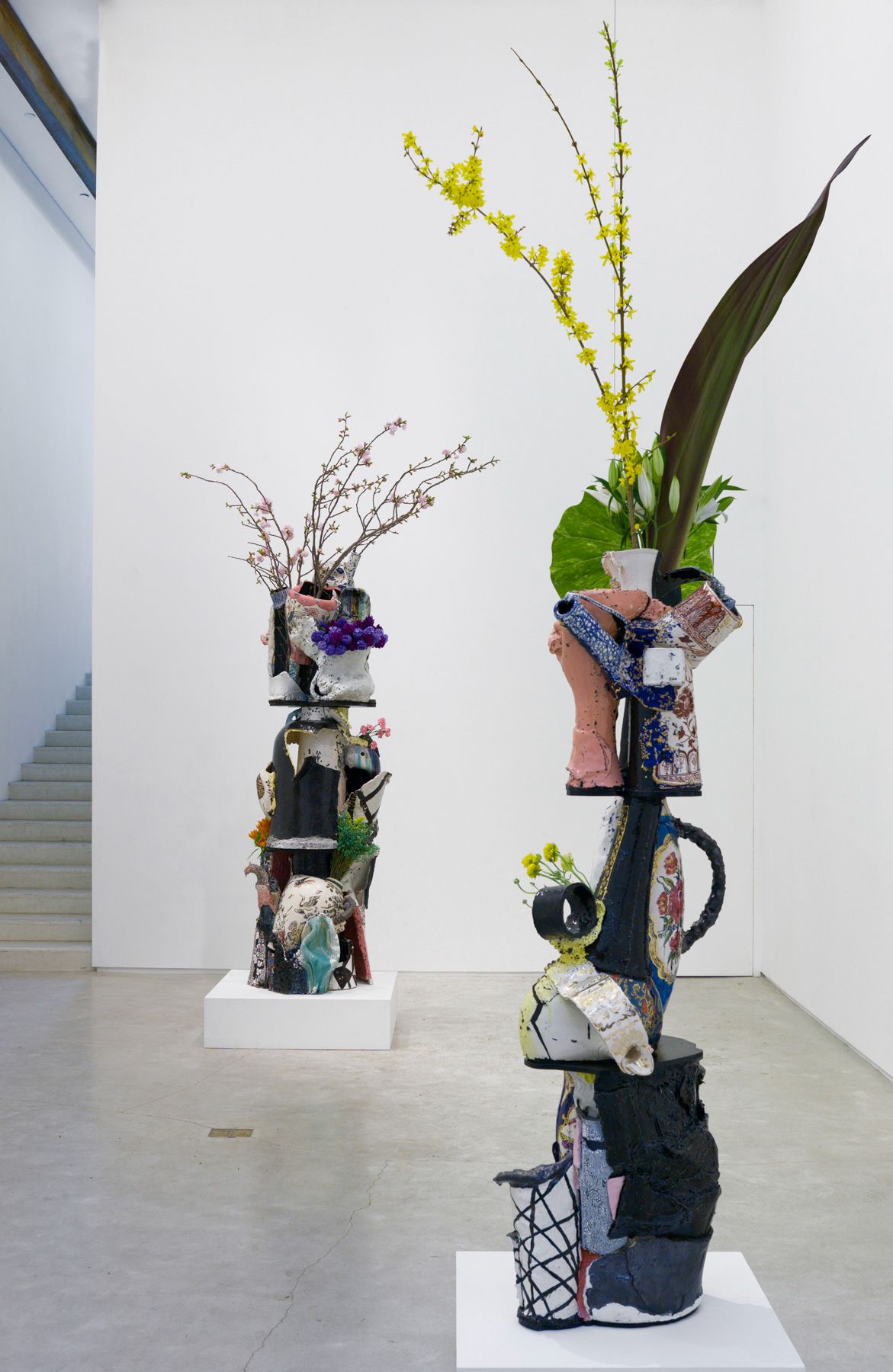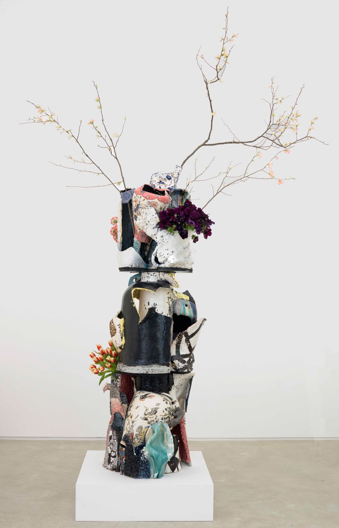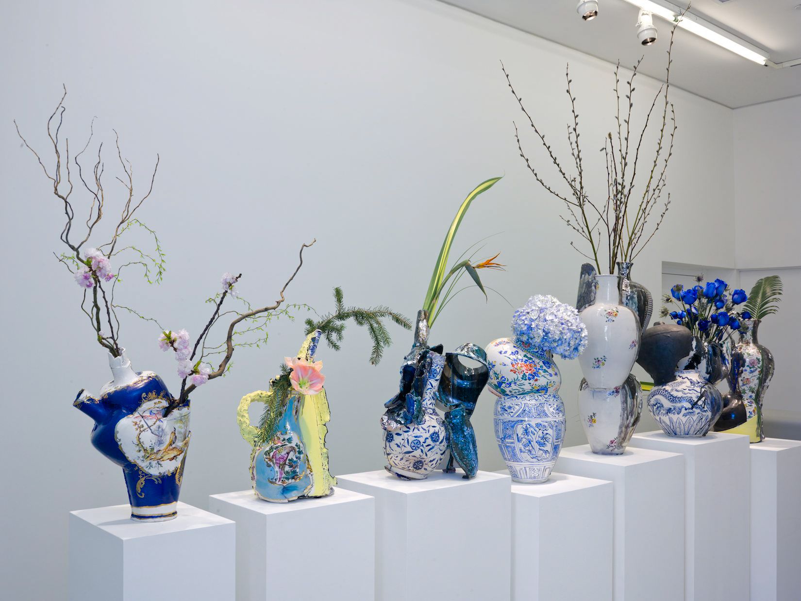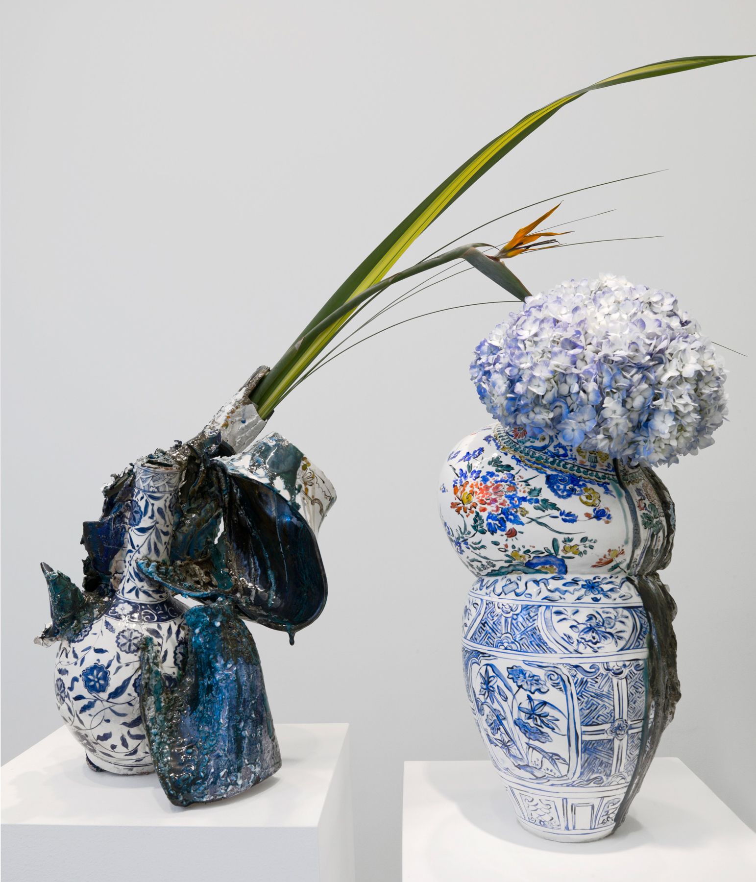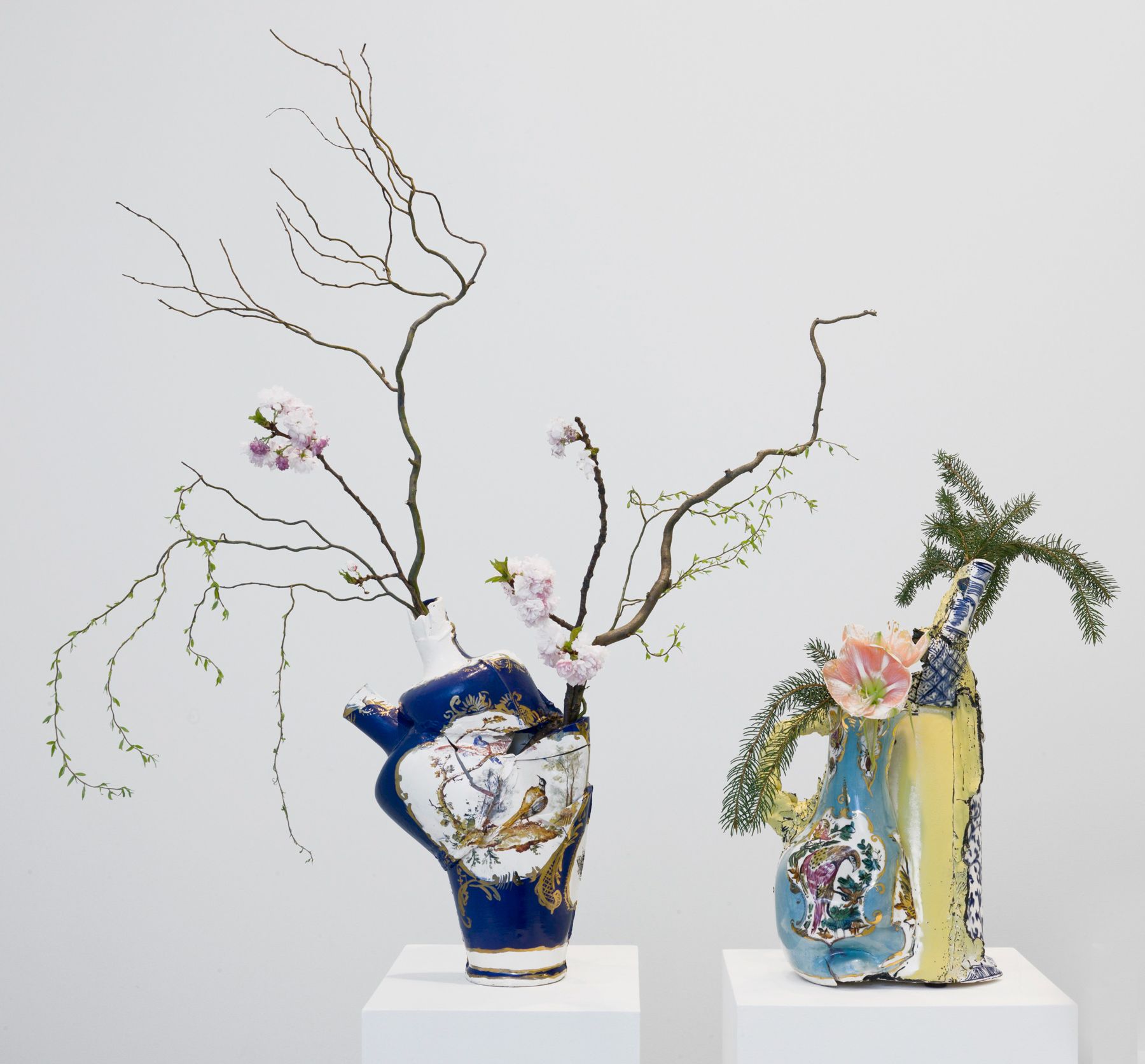 DiMattio’s new multi-faceted ceramic sculptures fluctuate between illusionism and abstraction, high art and craft. Made from handmade porcelain vessels that the artist melds together into a contorted whole, each sculpture embodies DiMattio’s interest in the everyday object as a means to explore shifting ideas of beauty, femininity, and art. Every angle reveals a different firing and glazing technique from finely painted gold luster to the more expressionistic lava crackle. One can easily find an arrangement of carefully articulated china painted roses next to a dripping hire-fire flowing glaze, or a finely modeled slip cast vase grafted onto a more free-form hand-molded base. Her imagery is similarly eclectic and far-reaching from references to 17th Century French Chinoiserie to the mass-produced kitch object or to the molten sculptural forms of Peter Voulkos.