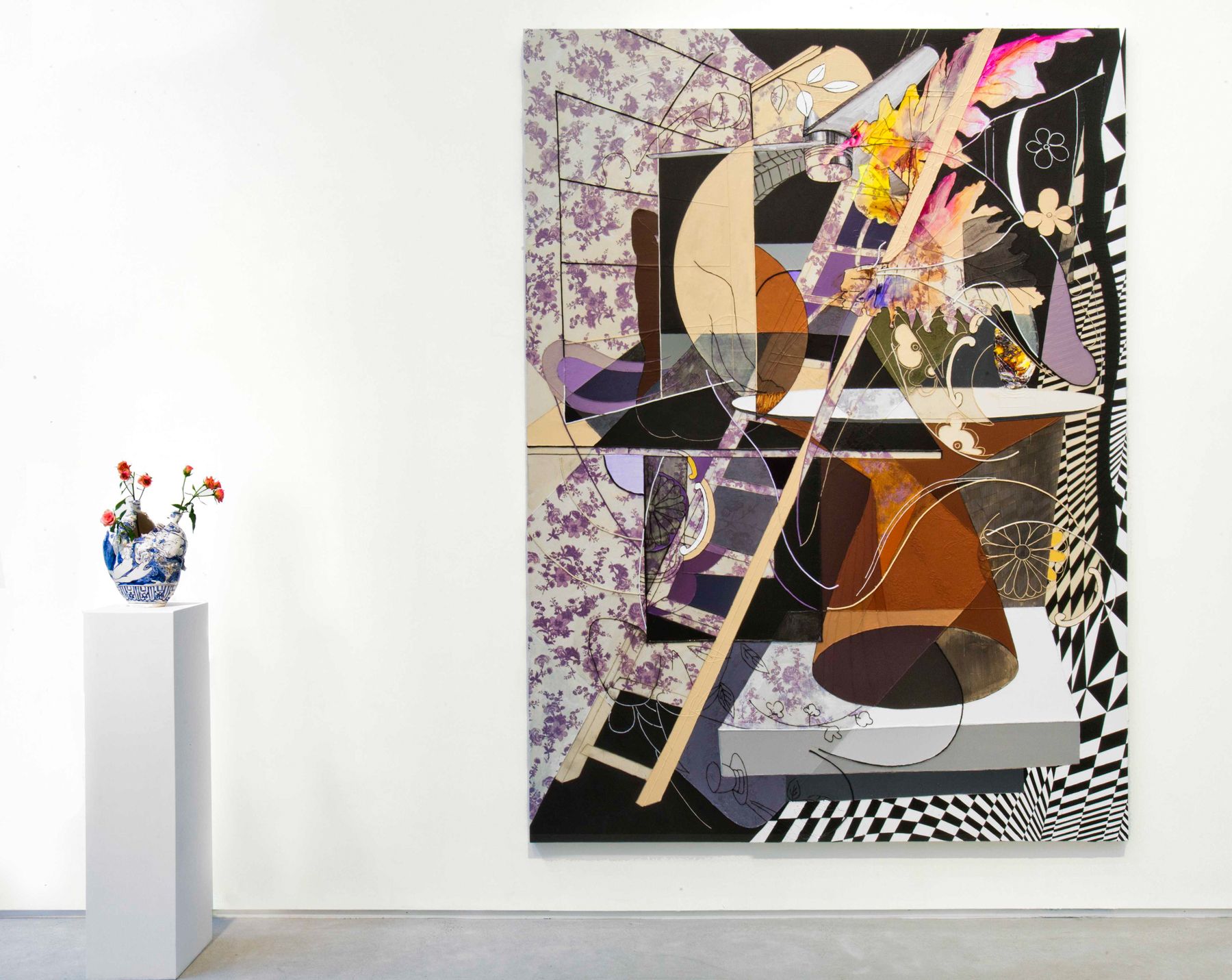 In her new body of work, DiMattio brings her focus to the still life and domestic interior, transforming the once intimate genre painting into grand, contrapuntal murals. Architectural motifs are fractured and combined with expansive areas of color, both flat and textured, to create an added dynamism to the artist’s illusionist canvases. Each work is composed of overlapping rope drawings which serve to delineate space—flat and deep—and to suture disparate imagery together. The inclusion of collaged elements such as textiles and plastic shopping bags further activates the space while accentuating the domesticity of the subject.