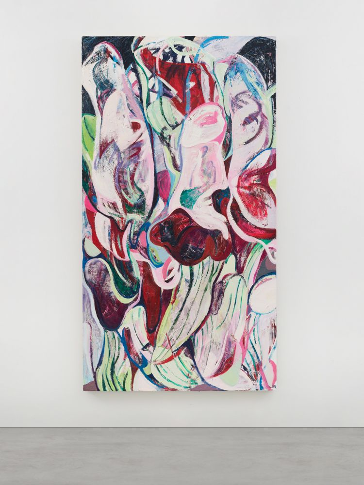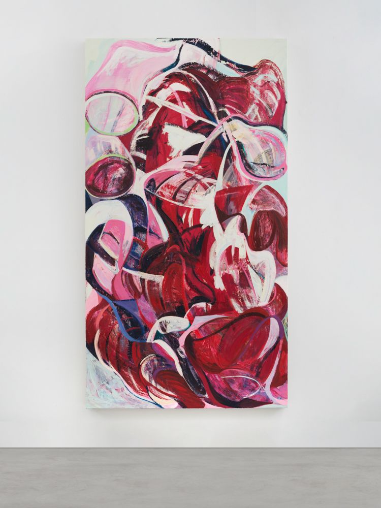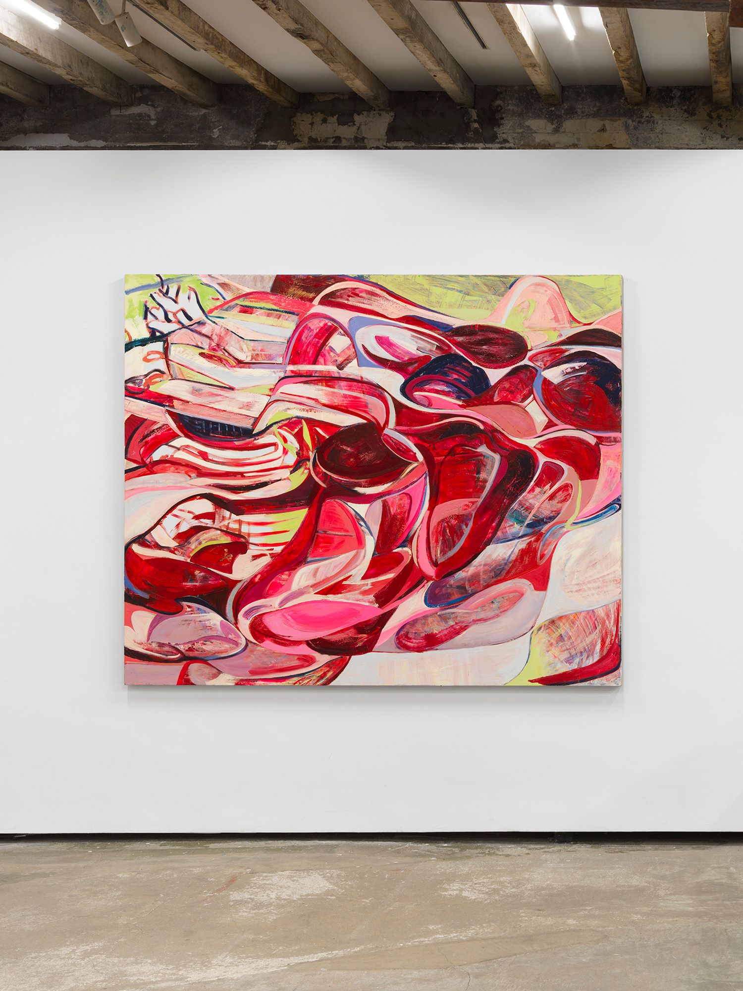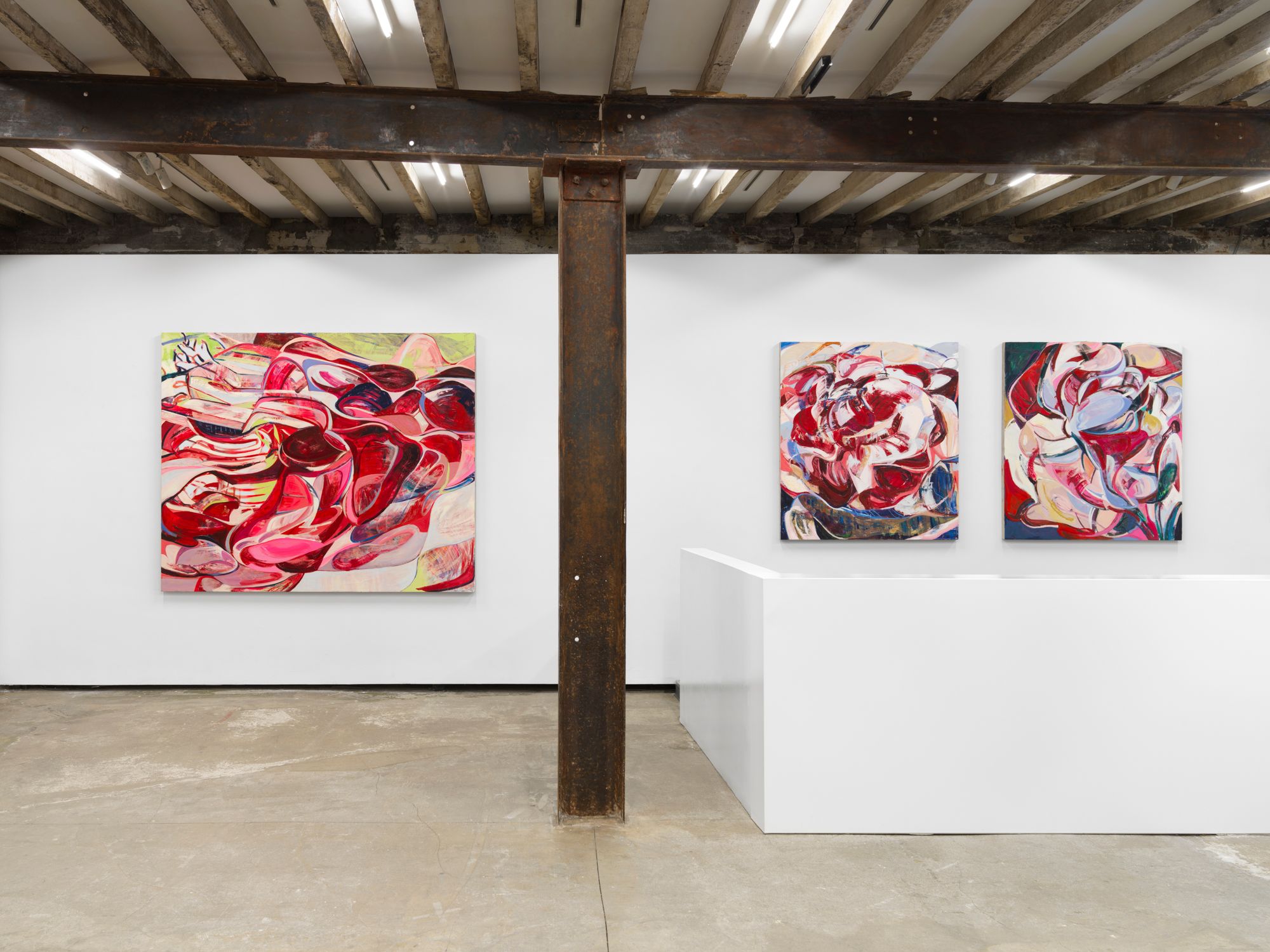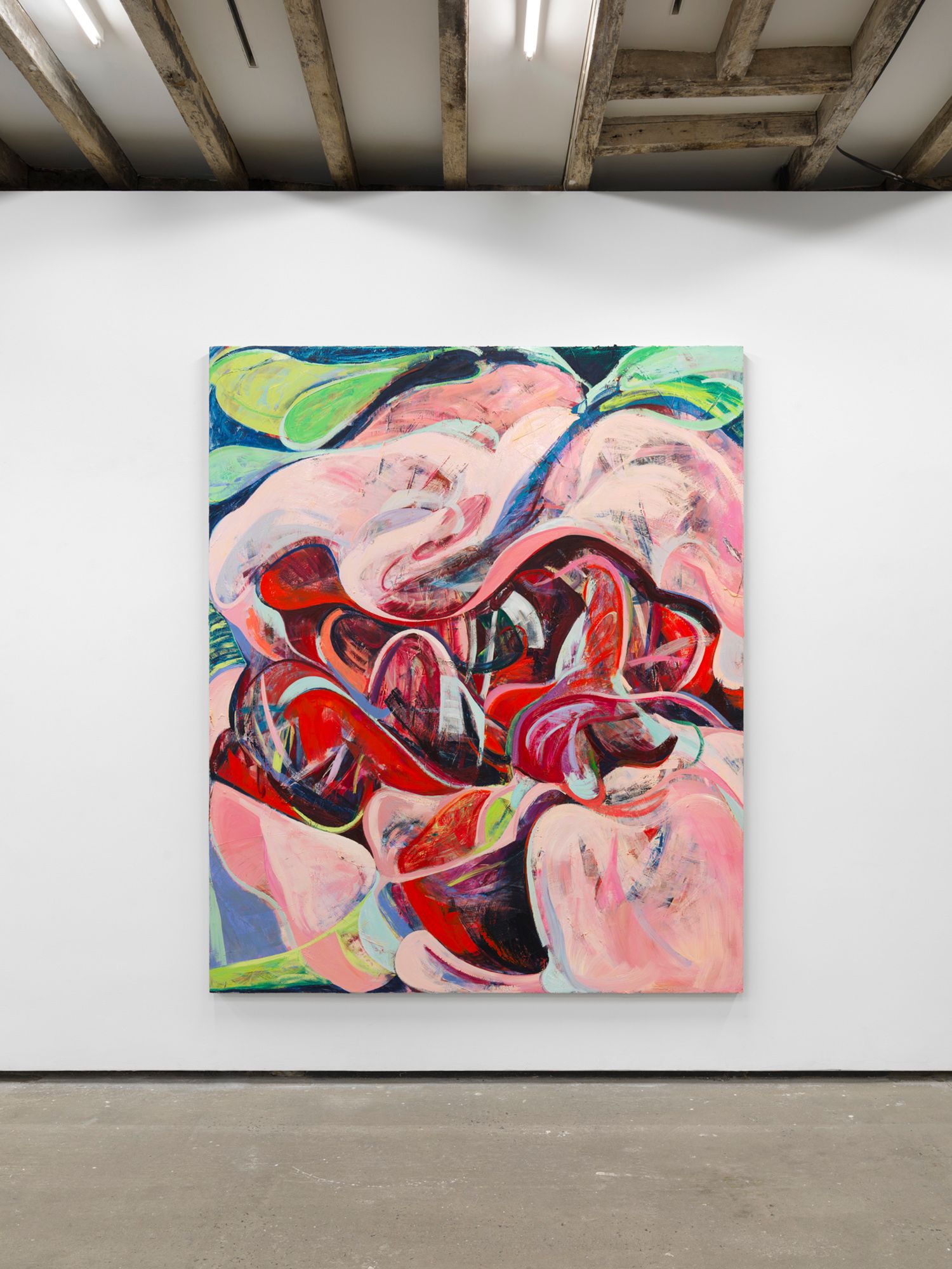 For her debut solo exhibition Heart of Anchor in the United States and at Salon 94, Zhang Zipiao has painted ten large-scale oil-on-canvases, fraught with abstracted meat and flowers—as suggested by the titles—enlivened by lurid red, pink, and green. The work continues her exploration of an explosive palette and intertwined forms, as channels for raw emotion and restless energy. Zhang wholeheartedly embraces change and contingency. Her paintings are spontaneous, instinctual, and physical—she sweeps, smears, and scrapes pigments directly on canvases from edge to edge, often skipping preliminary sketches—rendering deconstructed flesh, butchered meat (a frequent visitor to her neighboring butcher), bodily fluid (blood, oil, tears, sweat, milk, and piss), evanescent petals and blooming flowers that twist and spiral into one. They prompt Francis Bacon’s notion of non-illustrational forms that work “first upon sensation and then slowly leak back into the fact.” ¹