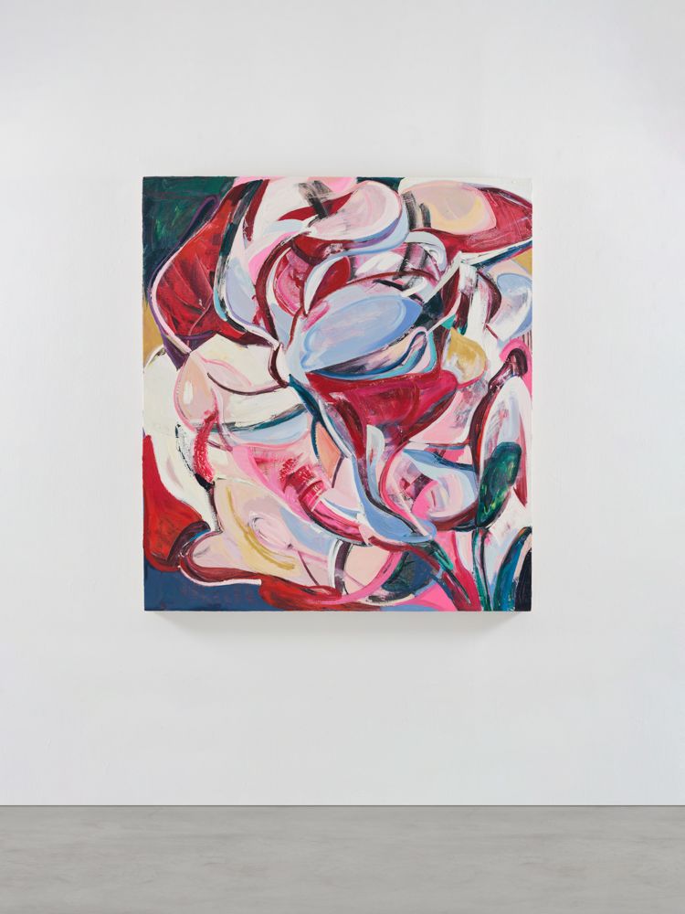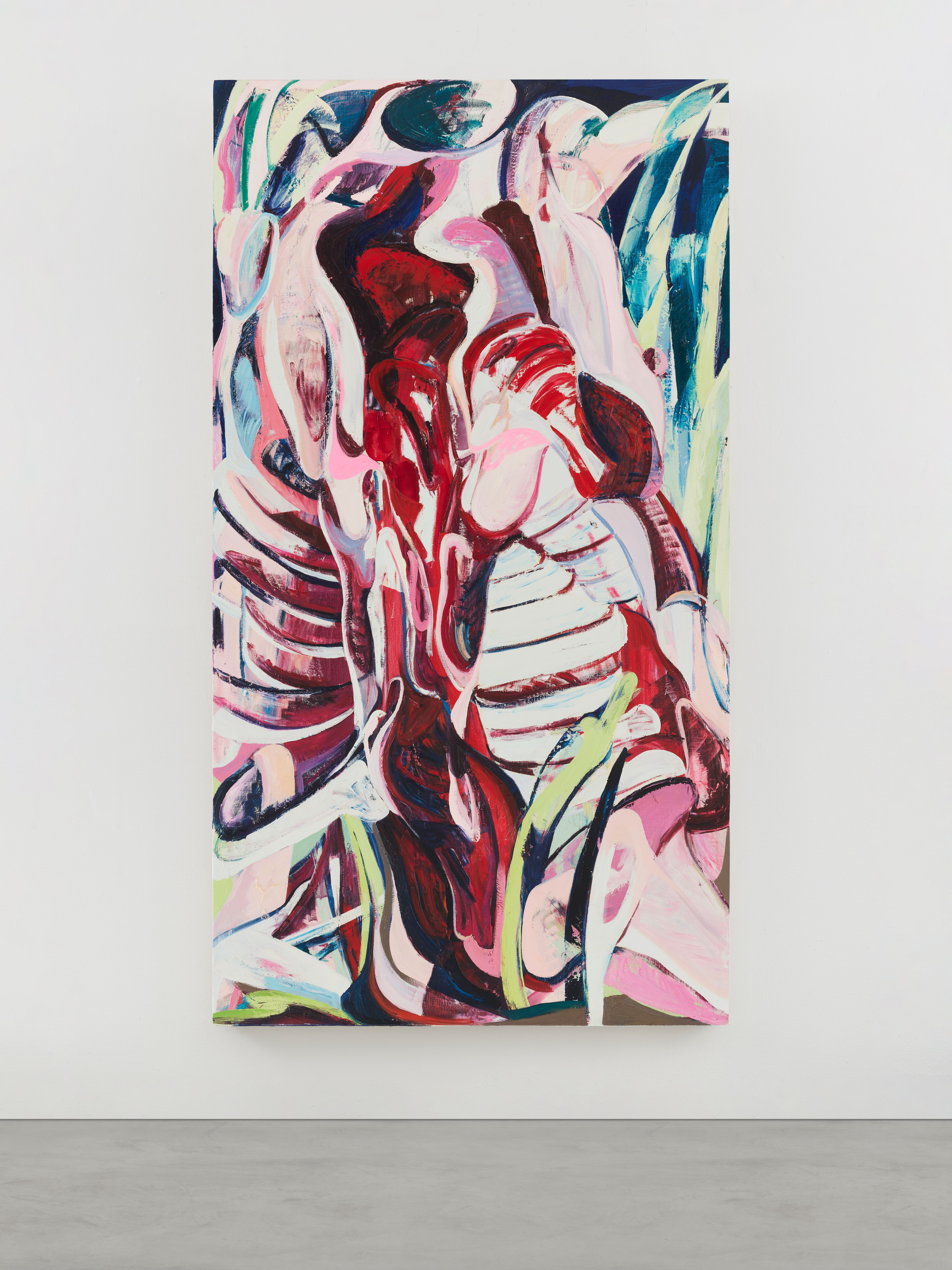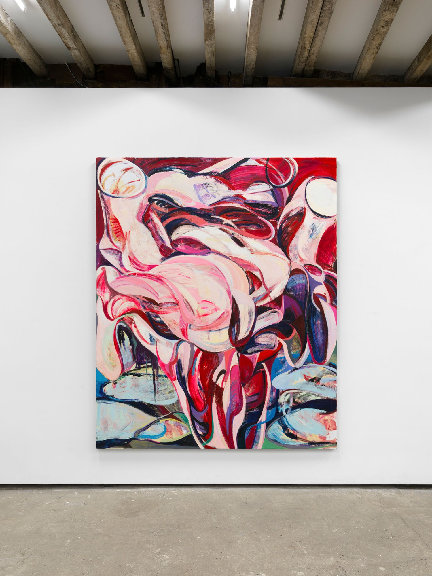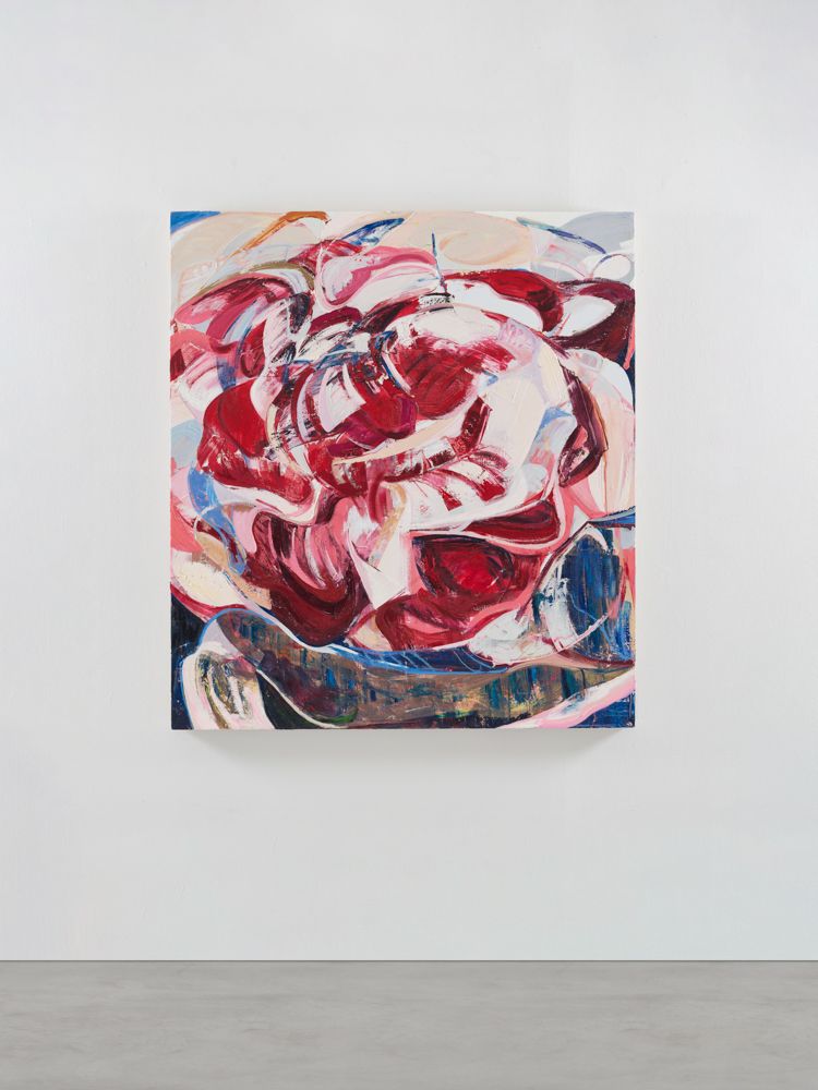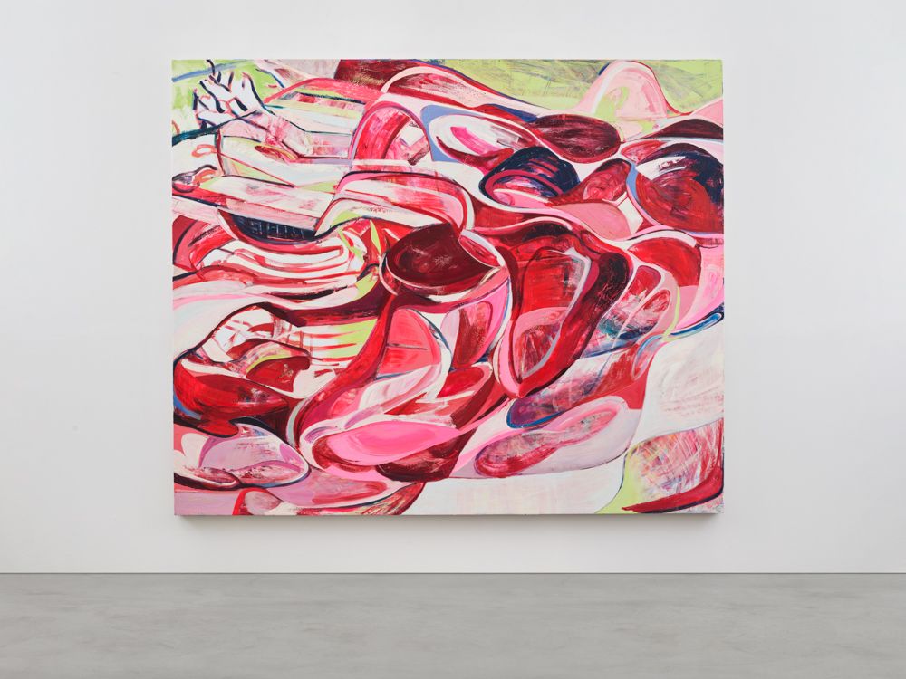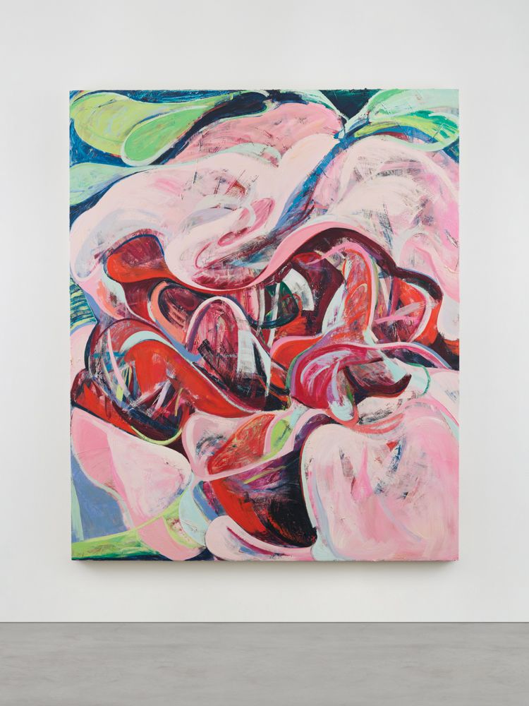 For her debut solo exhibition Heart of Anchor in the United States and at Salon 94, Zhang Zipiao has painted ten large-scale oil-on-canvases, fraught with abstracted meat and flowers—as suggested by the titles—enlivened by lurid red, pink, and green. The work continues her exploration of an explosive palette and intertwined forms, as channels for raw emotion and restless energy. Zhang wholeheartedly embraces change and contingency. Her paintings are spontaneous, instinctual, and physical—she sweeps, smears, and scrapes pigments directly on canvases from edge to edge, often skipping preliminary sketches—rendering deconstructed flesh, butchered meat (a frequent visitor to her neighboring butcher), bodily fluid (blood, oil, tears, sweat, milk, and piss), evanescent petals and blooming flowers that twist and spiral into one. They prompt Francis Bacon’s notion of non-illustrational forms that work “first upon sensation and then slowly leak back into the fact.” ¹