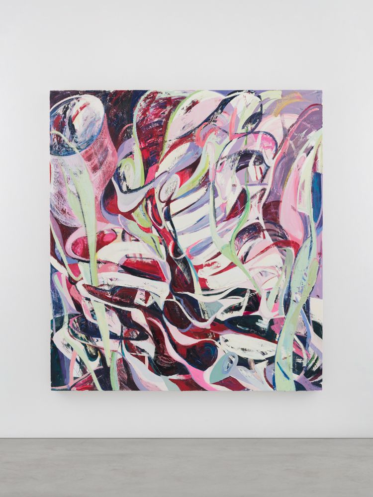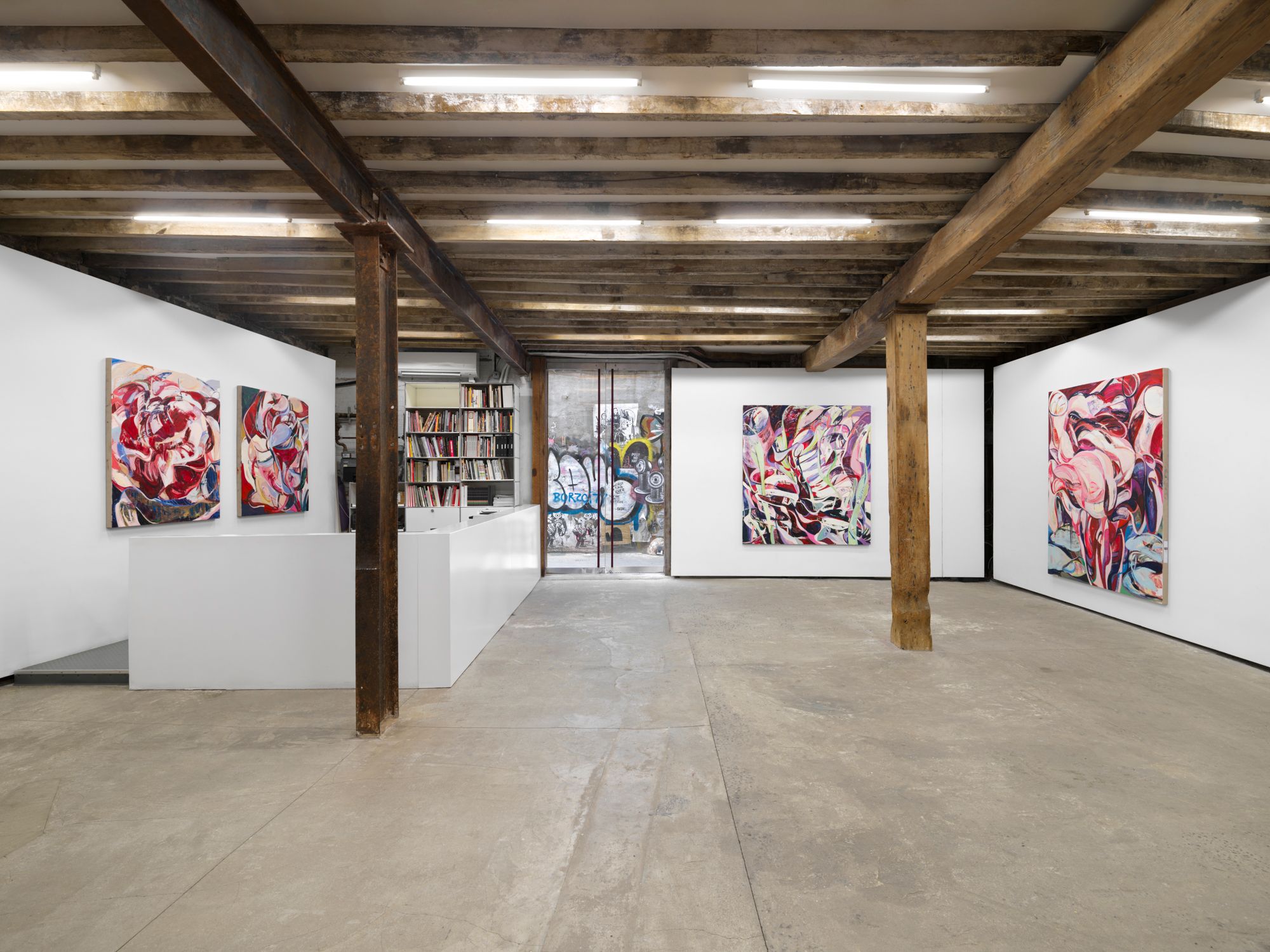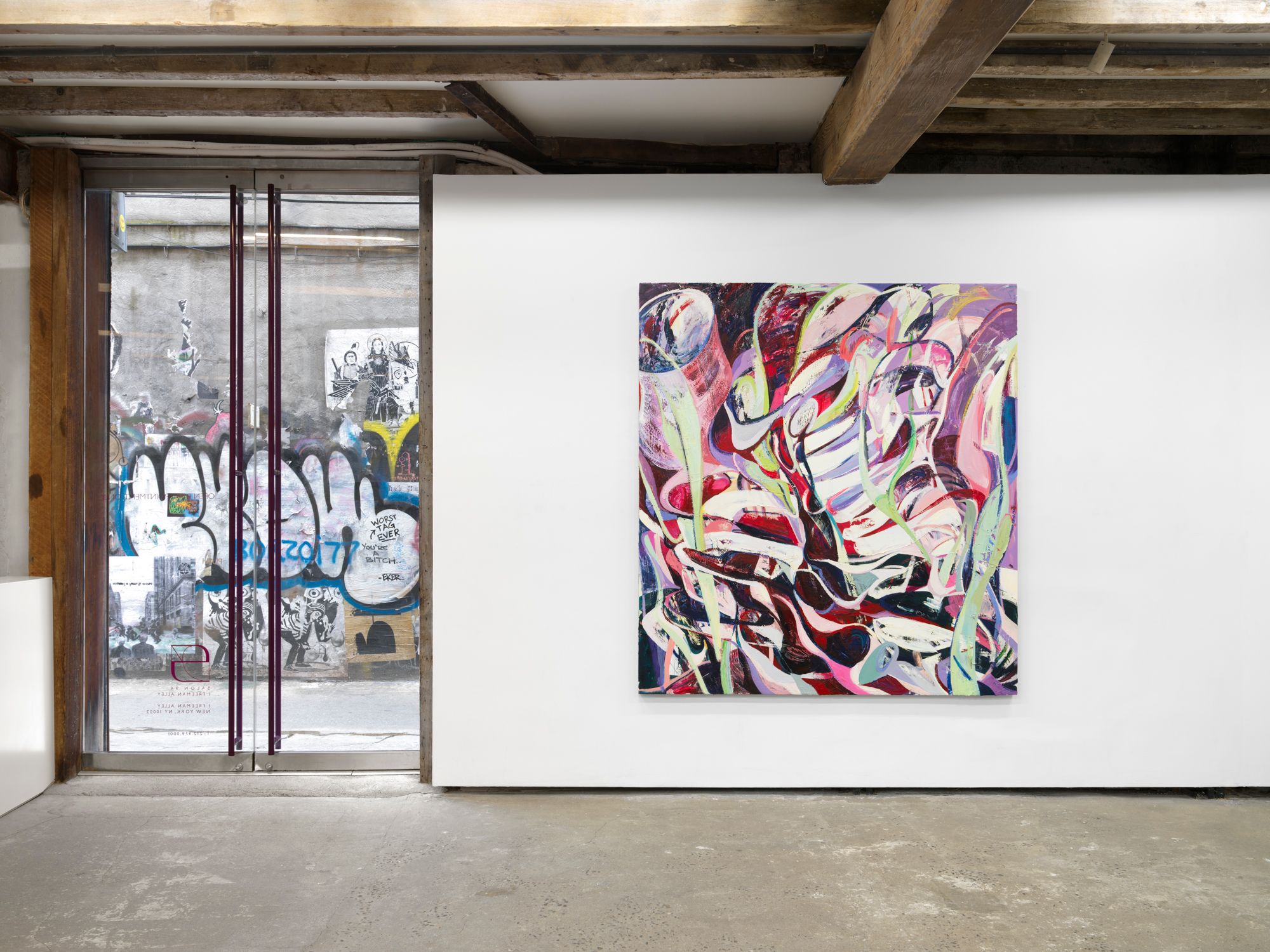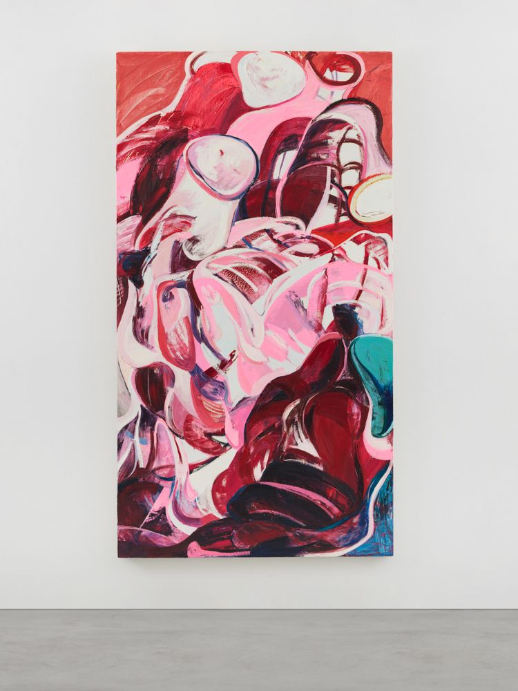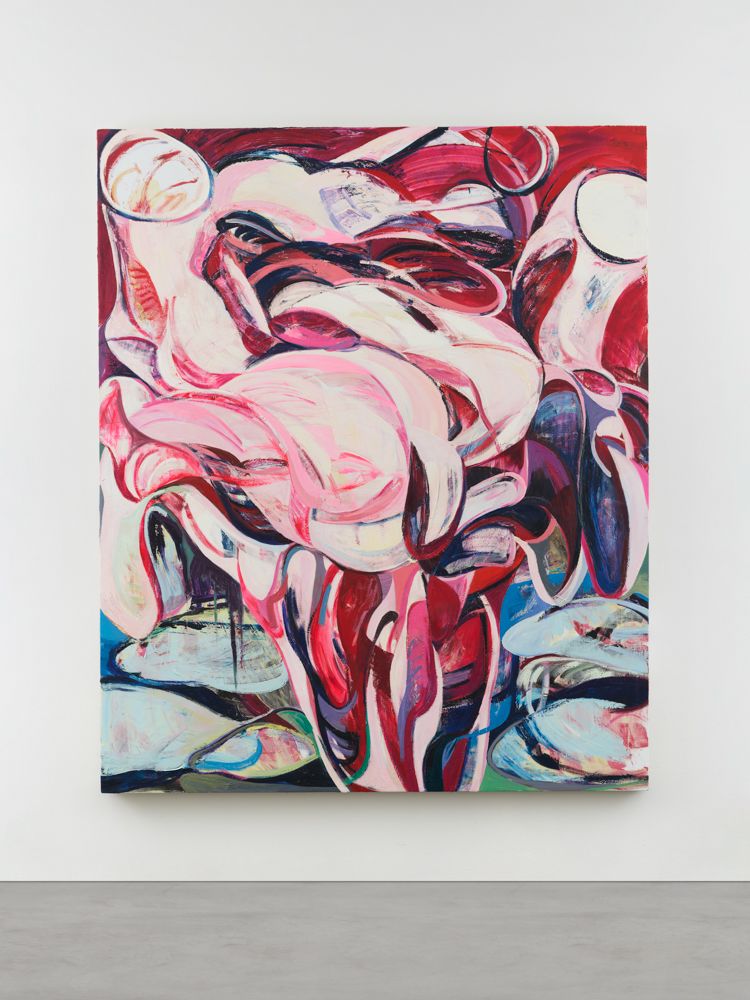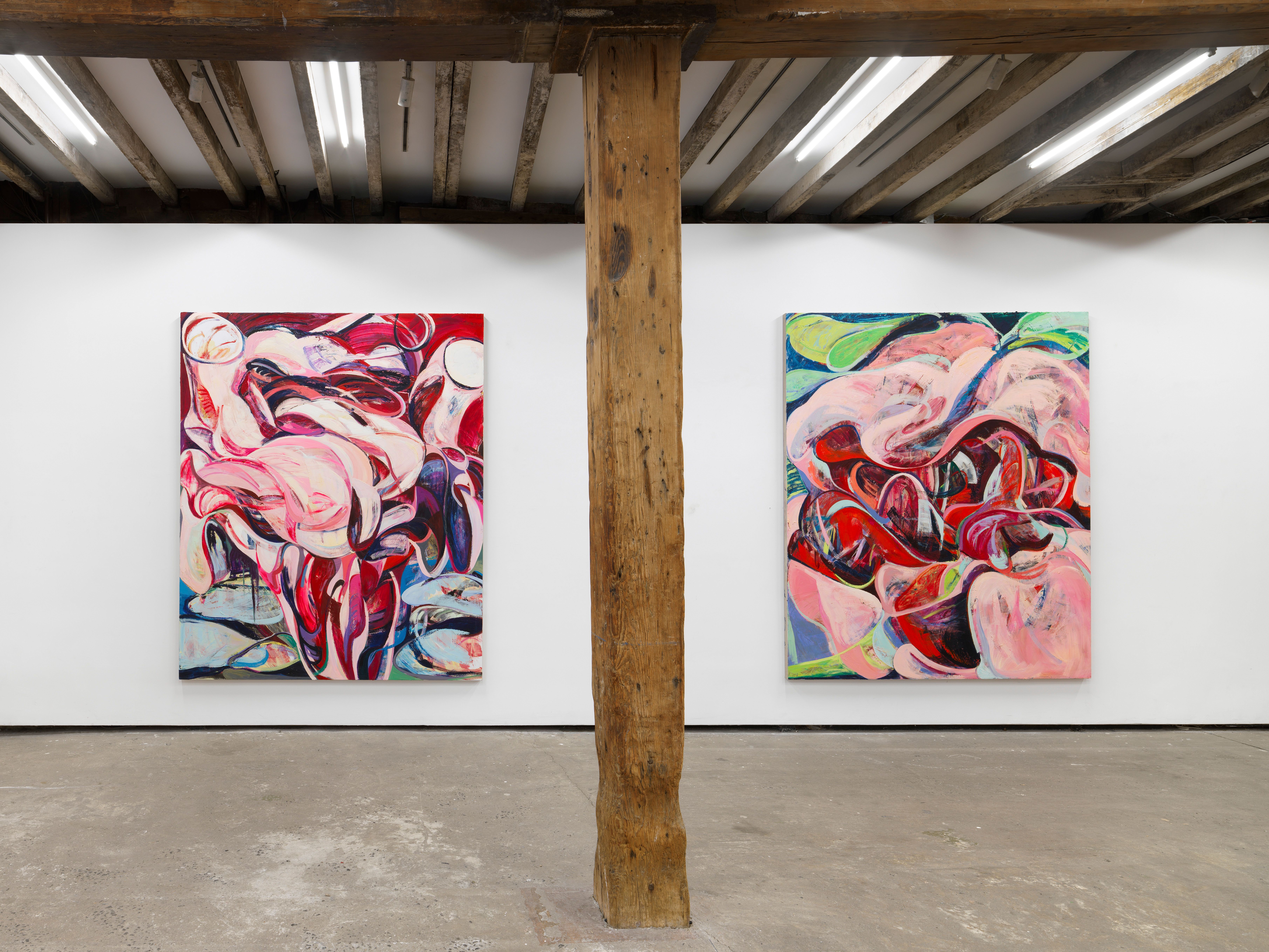 For her debut solo exhibition Heart of Anchor in the United States and at Salon 94, Zhang Zipiao has painted ten large-scale oil-on-canvases, fraught with abstracted meat and flowers—as suggested by the titles—enlivened by lurid red, pink, and green. The work continues her exploration of an explosive palette and intertwined forms, as channels for raw emotion and restless energy. Zhang wholeheartedly embraces change and contingency. Her paintings are spontaneous, instinctual, and physical—she sweeps, smears, and scrapes pigments directly on canvases from edge to edge, often skipping preliminary sketches—rendering deconstructed flesh, butchered meat (a frequent visitor to her neighboring butcher), bodily fluid (blood, oil, tears, sweat, milk, and piss), evanescent petals and blooming flowers that twist and spiral into one. They prompt Francis Bacon’s notion of non-illustrational forms that work “first upon sensation and then slowly leak back into the fact.” ¹