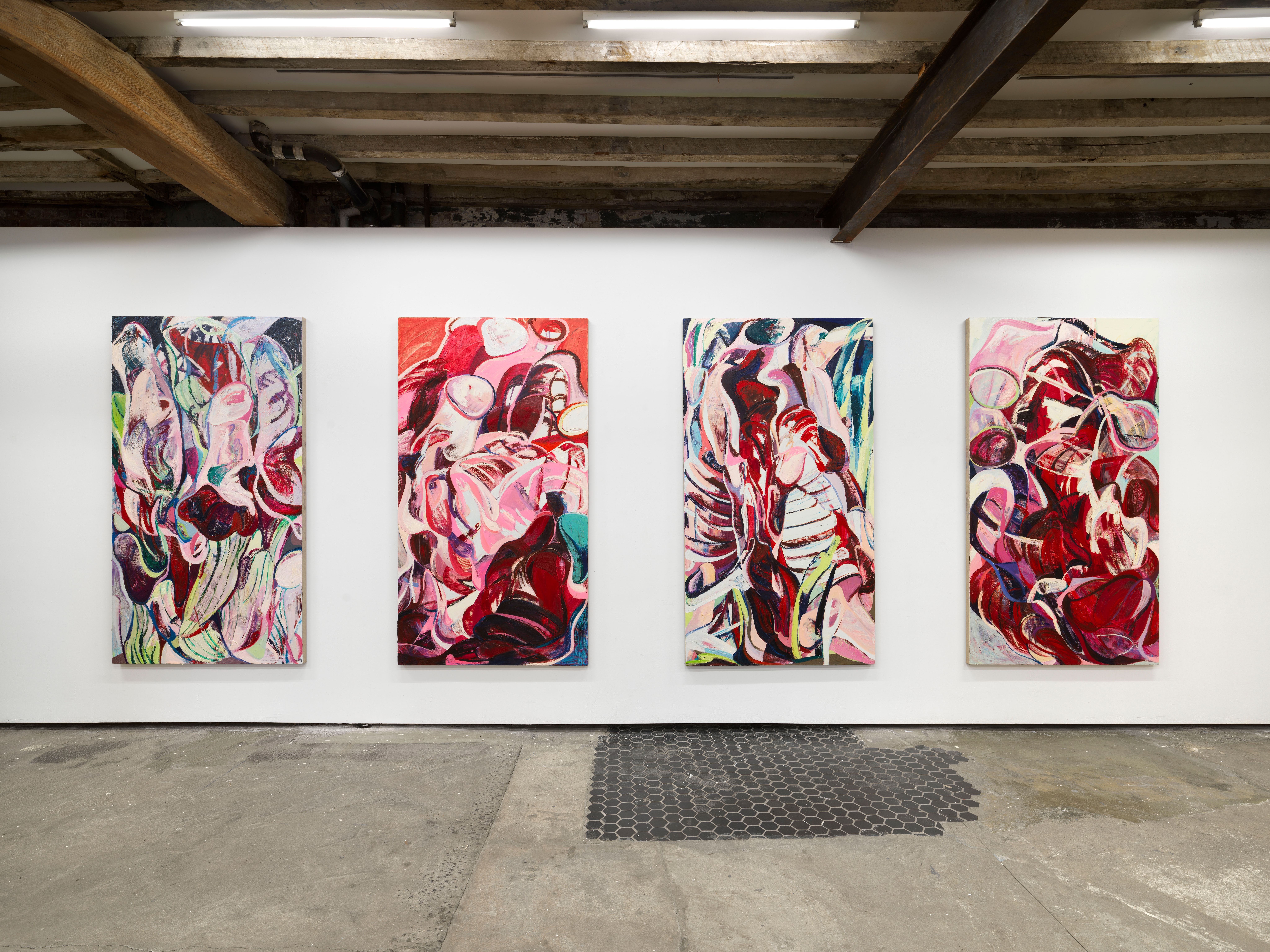 "Each painting, with its loose and spontaneous quality, is larger than life and matched with pent-up energy that propels viscous blood, tumbling folds, voluptuous flesh, ripped organs, and deconstructed meat cascading from the canvas, like a simultaneously seductive, dissonant, and violent cacophony." – Danielle Shang, 2021