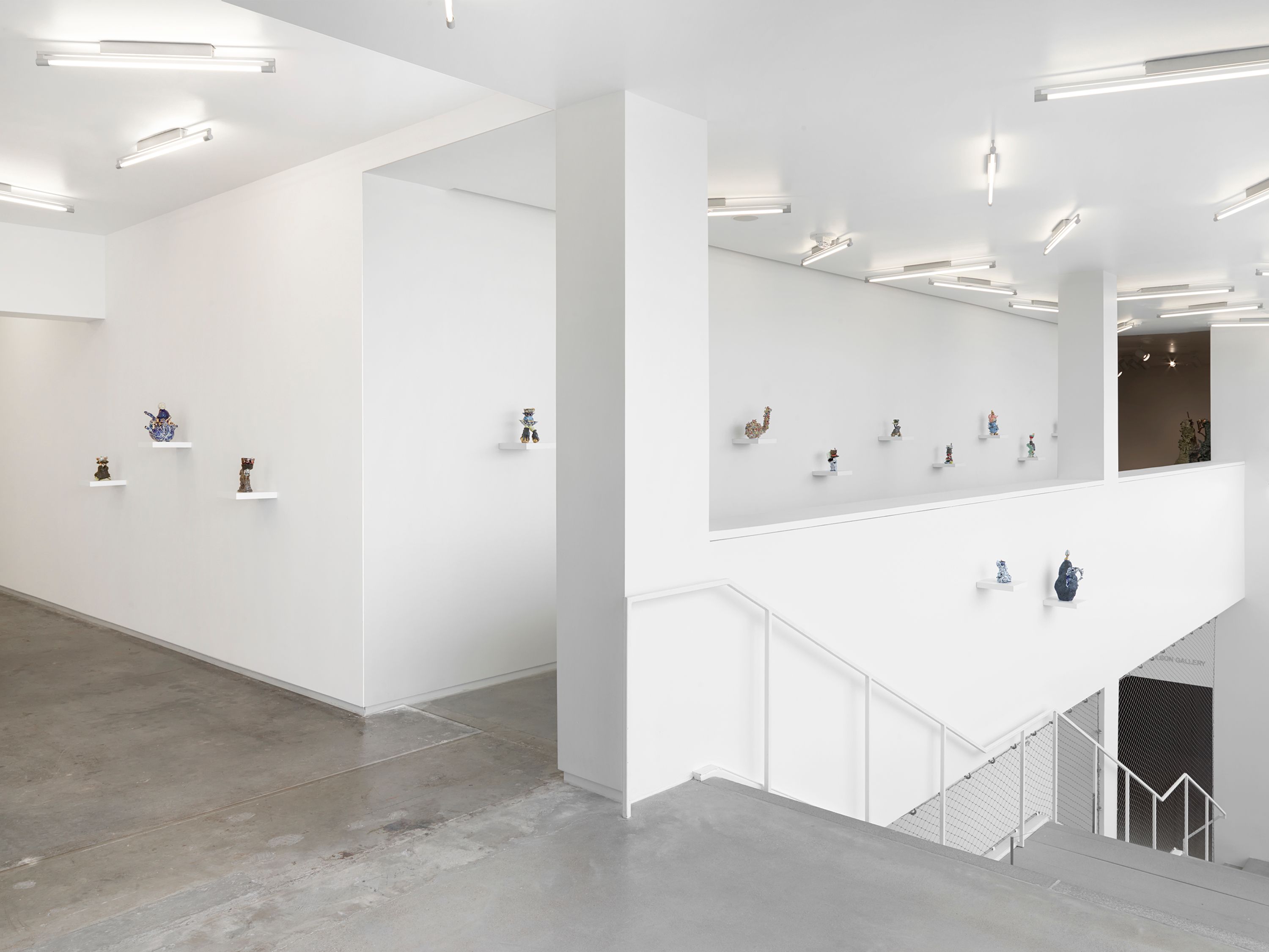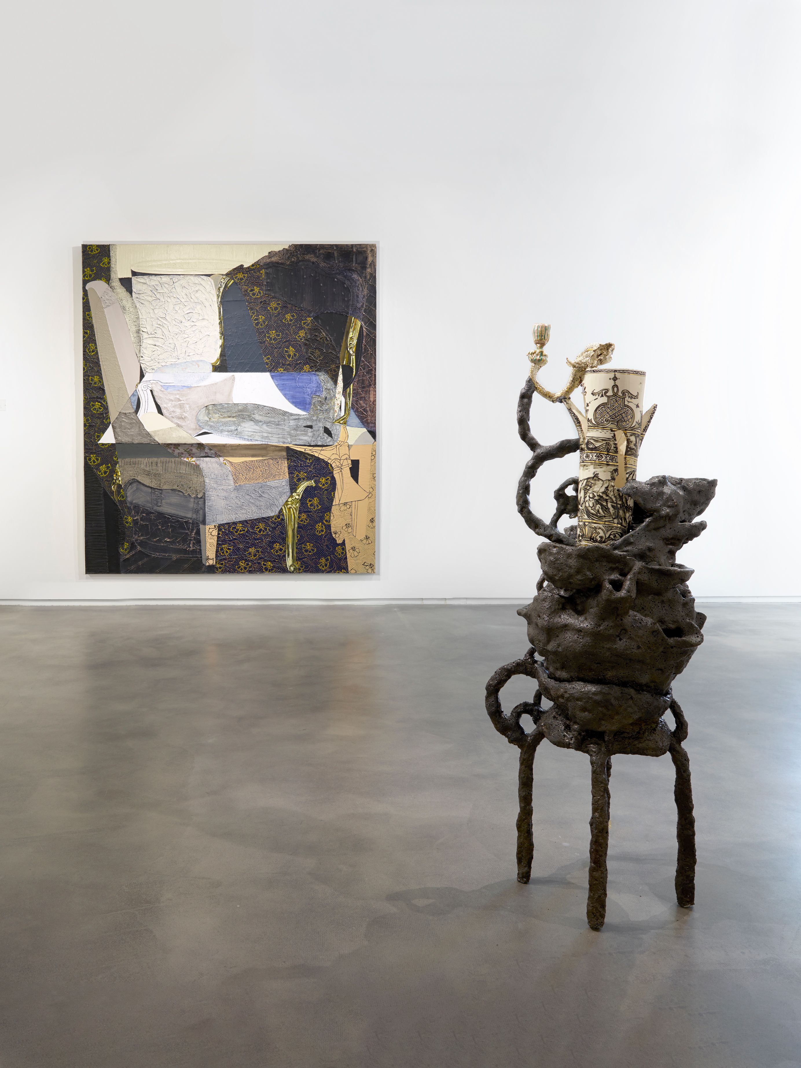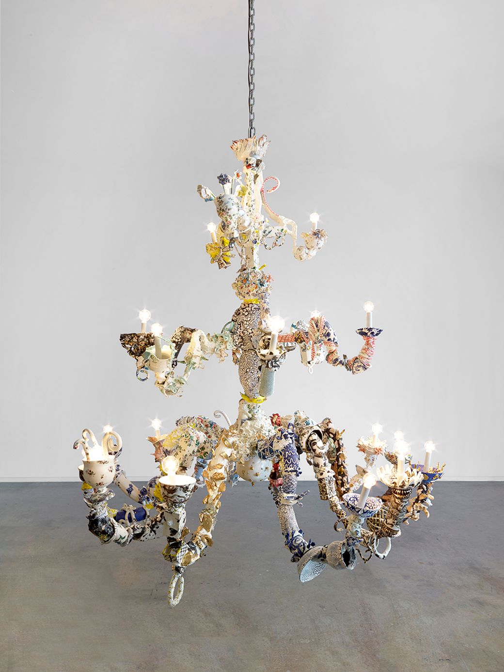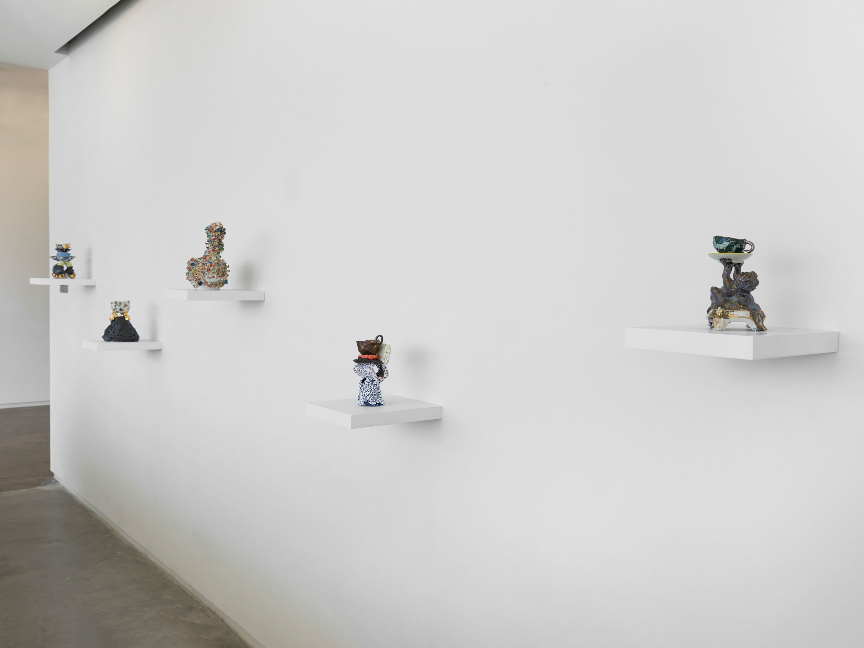 The same is true for her sculpture. DiMattio’s earlier work referenced the genres of history painting and landscape, but since 2010 her focus has shifted to the still life and domestic interior. It is in this context that she began making ceramic vessels, or, more precisely, sculptures about vases, and more recently sets of tea cups and pots. Like the paintings, the sculptures fuse together different traditions and techniques, ranging from 17th Century French Chinoiserie to mass-produced kitsch tchotchkes to the molten forms of Peter Voulkos’s sculptures. Through material and formal collision her sculptures investigate and challenge ideas of the decorative and its association with femininity. Says DiMattio, “It changes what we think of as feminine and presents the domestic in forms that call for new adjectives.”