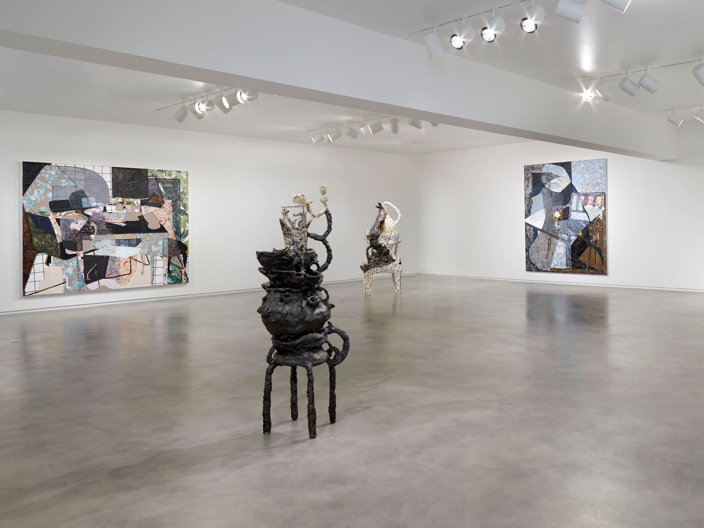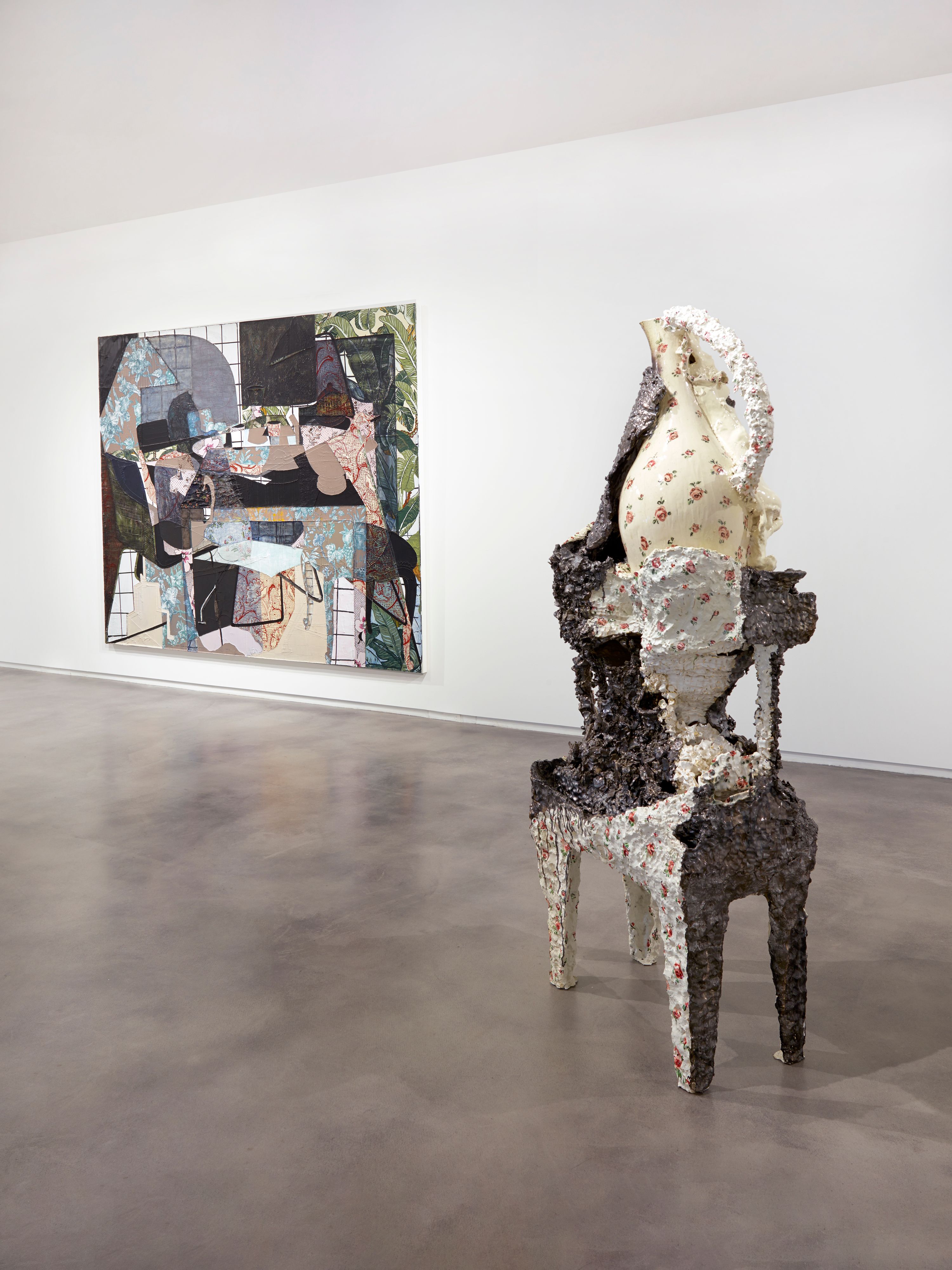 Francesca DiMattio is part of a generation of artists bent on reinvigorating painting and sculpture through careful consideration of the history of the medium and its traditions of material, genre, style and periodization. Treating her canvases like a stage set, DiMattio creates intricately layered scenes where architecture, furnishings, objects and figures collide in a continually shifting plane. She often compares the rhythm of her painting as akin to weaving in which she uses representational elements made of paint, textiles or plastics to build abstract paintings where each element is recognizable but does not behave as it should. “The imagery moves between the nameable world that adheres to rules of weight and gravity, and a flat world of pattern and abstraction that follows its own logic. Because everything is fractured, there is a suggestion of motion rather than stillness. Every element is interrupted or broken by another element. Nothing is left whole.”