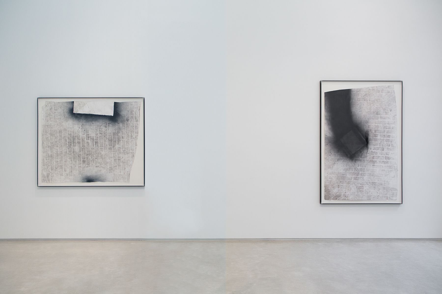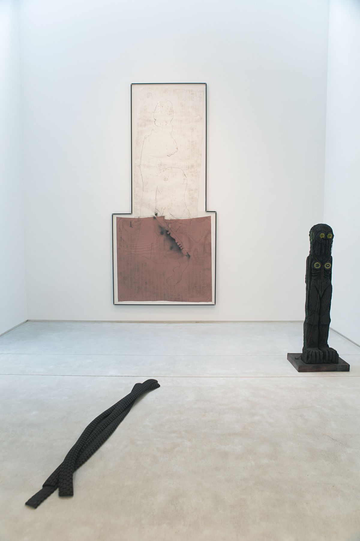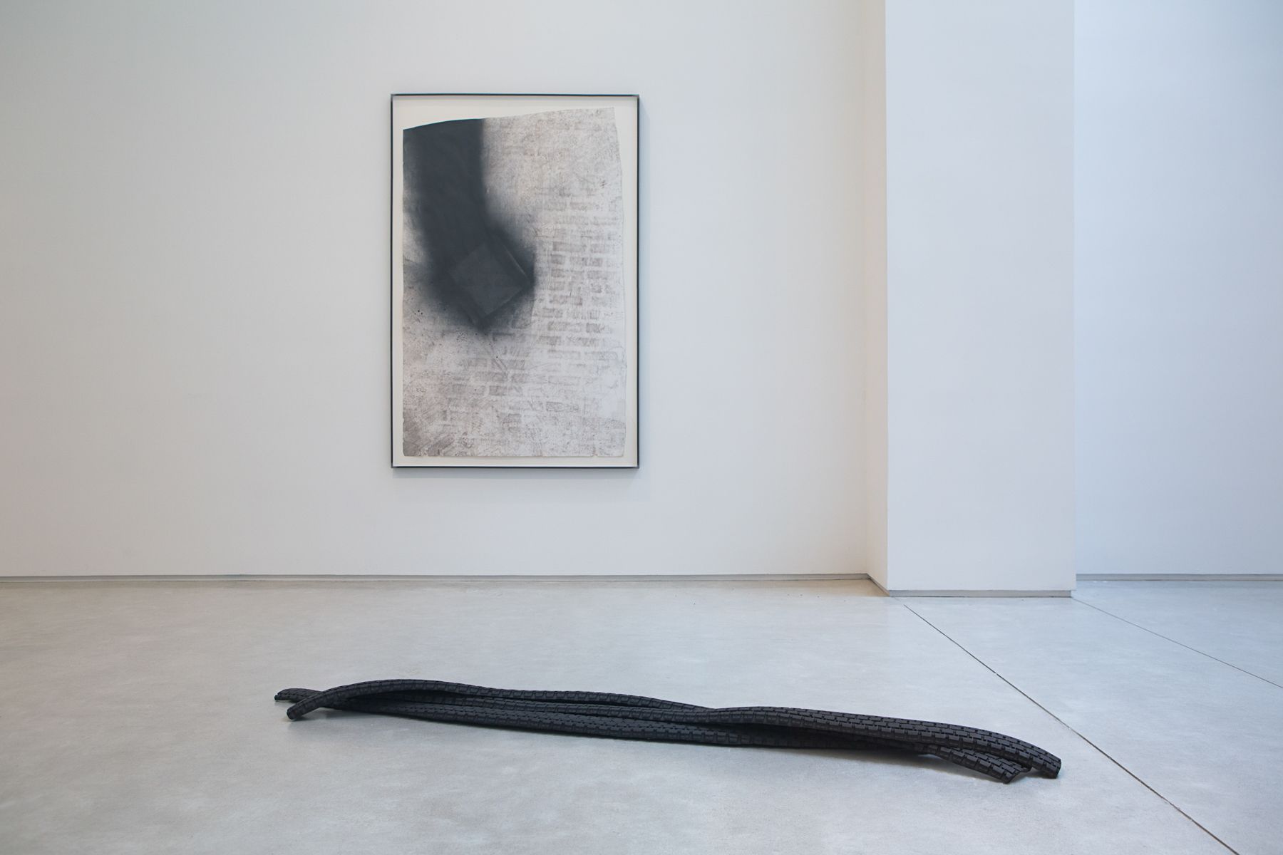Surrounding the sculptures are drawings made on rolls of white photography backdrop paper. These works reveal a palimpsest of Bhabha’s art making practice. The paper was set on the ground of her studio during the making of her recent sculpture; footprints and other markers are left visible. The distressed works carry traces of studio scraps and process, and depict other architectural and building materials like bricks, wood, and stone.