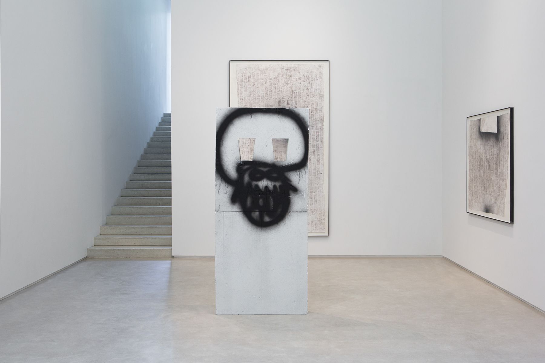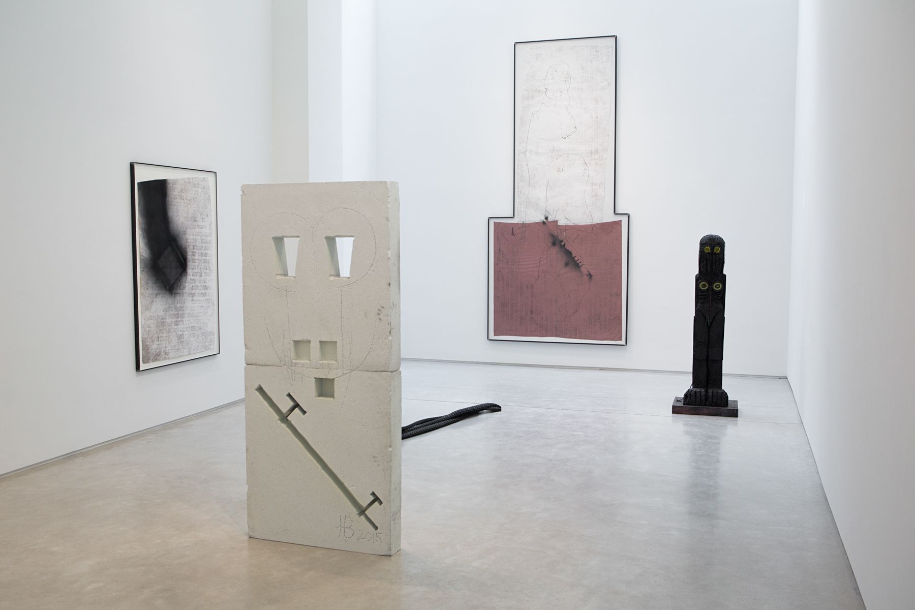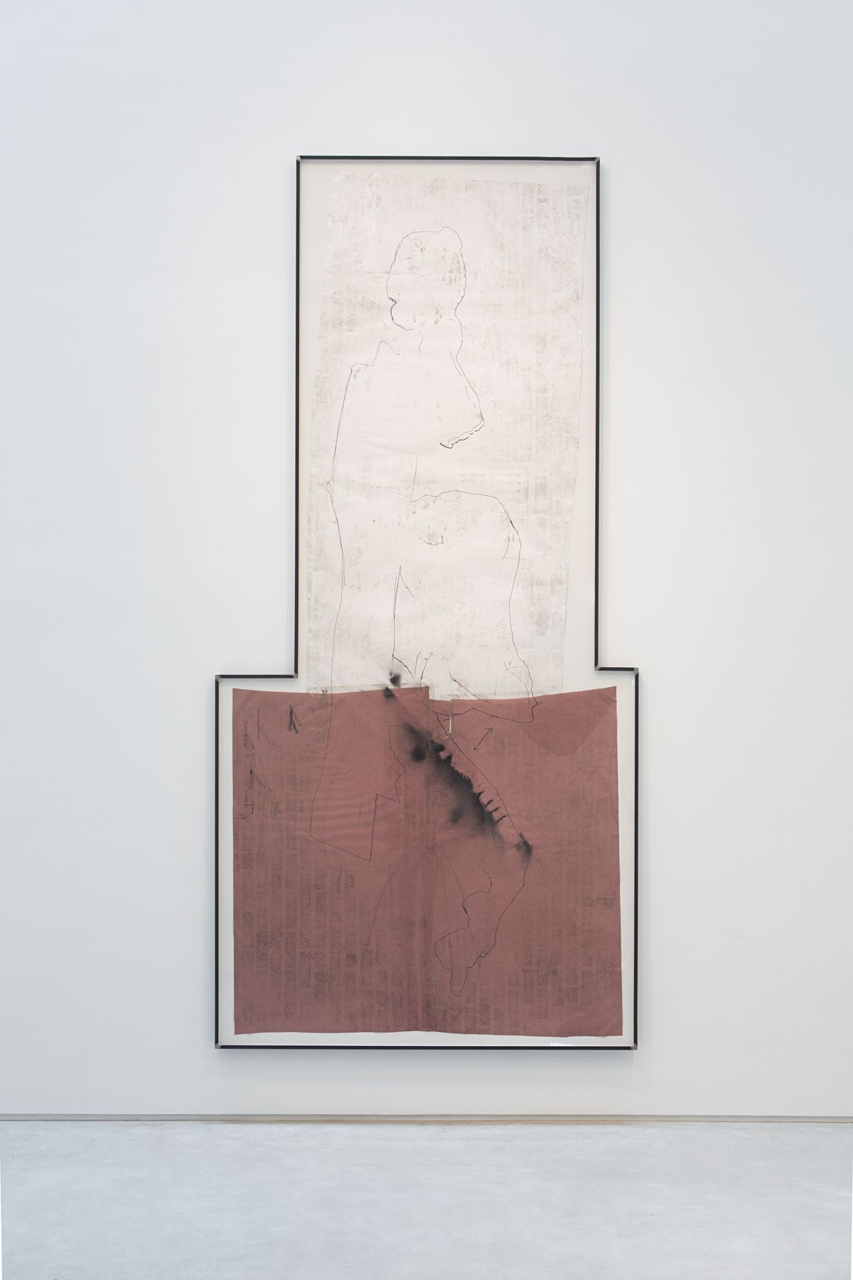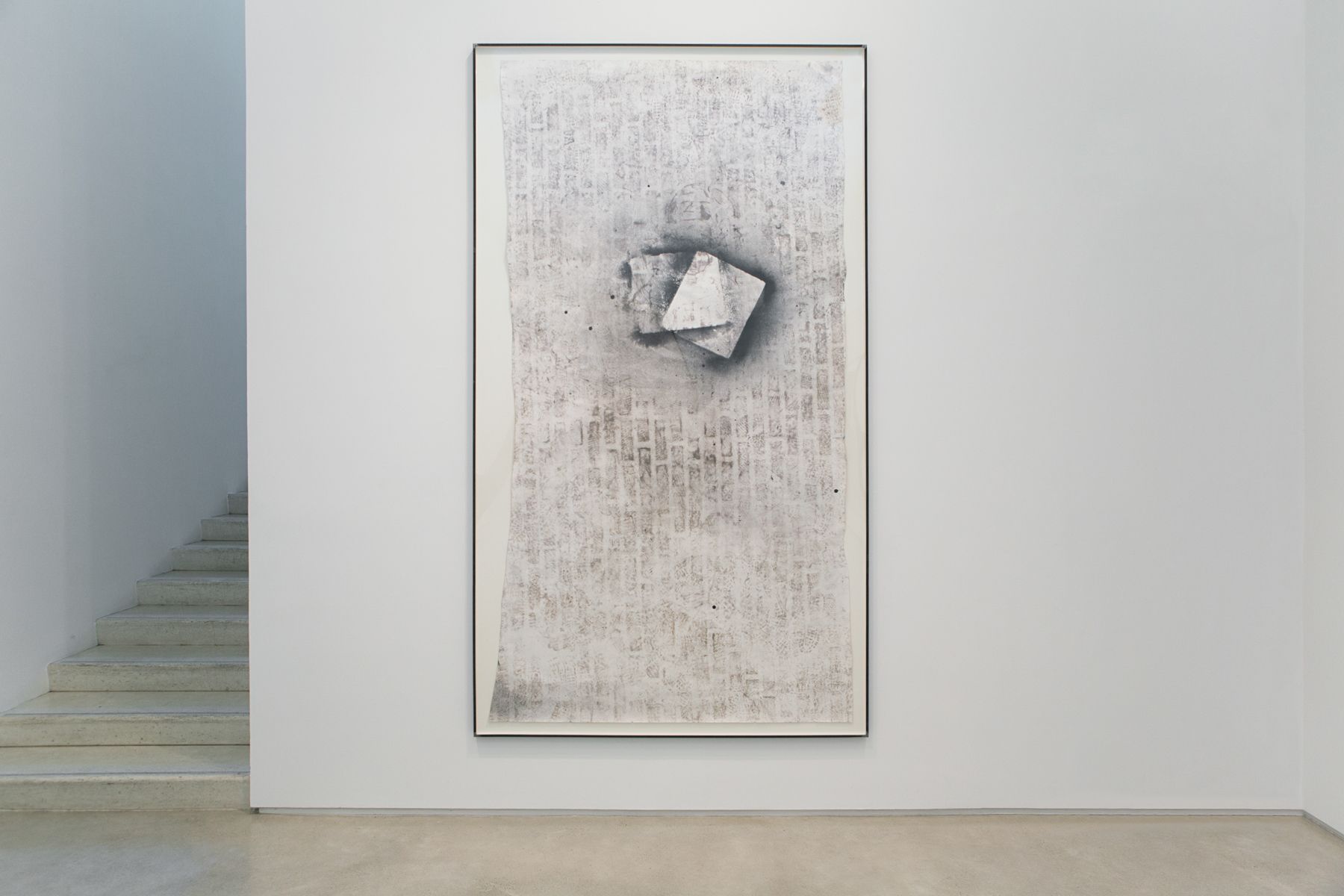 Surrounding the sculptures are drawings made on rolls of white photography backdrop paper. These works reveal a palimpsest of Bhabha’s art making practice. The paper was set on the ground of her studio during the making of her recent sculpture; footprints and other markers are left visible. The distressed works carry traces of studio scraps and process, and depict other architectural and building materials like bricks, wood, and stone.