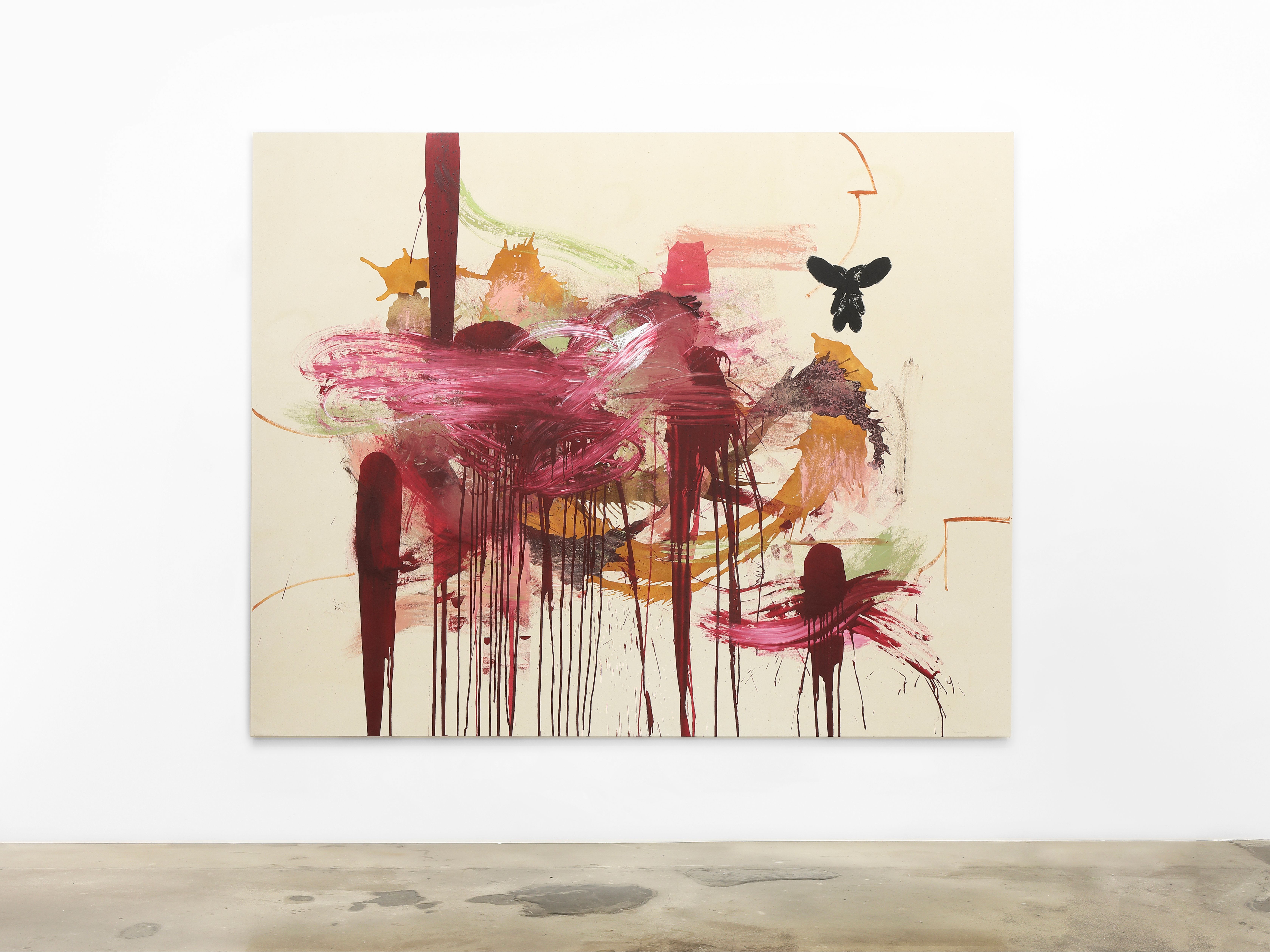 Neel’s red is the particular mix of blood and mud that soaks a newly born calf, or the rusty clay seeping through her toes after a summer pour. A heroic and joyful painting, Captivity shows off a bouquet of burgundy and crimson reds, hot pinks and dusty roses, and, as if left alone in the barn at night, small animals seem to have left their trace, as their imagined footprints march across the canvas muddying and swirling together the wet paint. And, as if a sudden change of season- speckles of white paint pepper Captivity, like a dusting of snow.