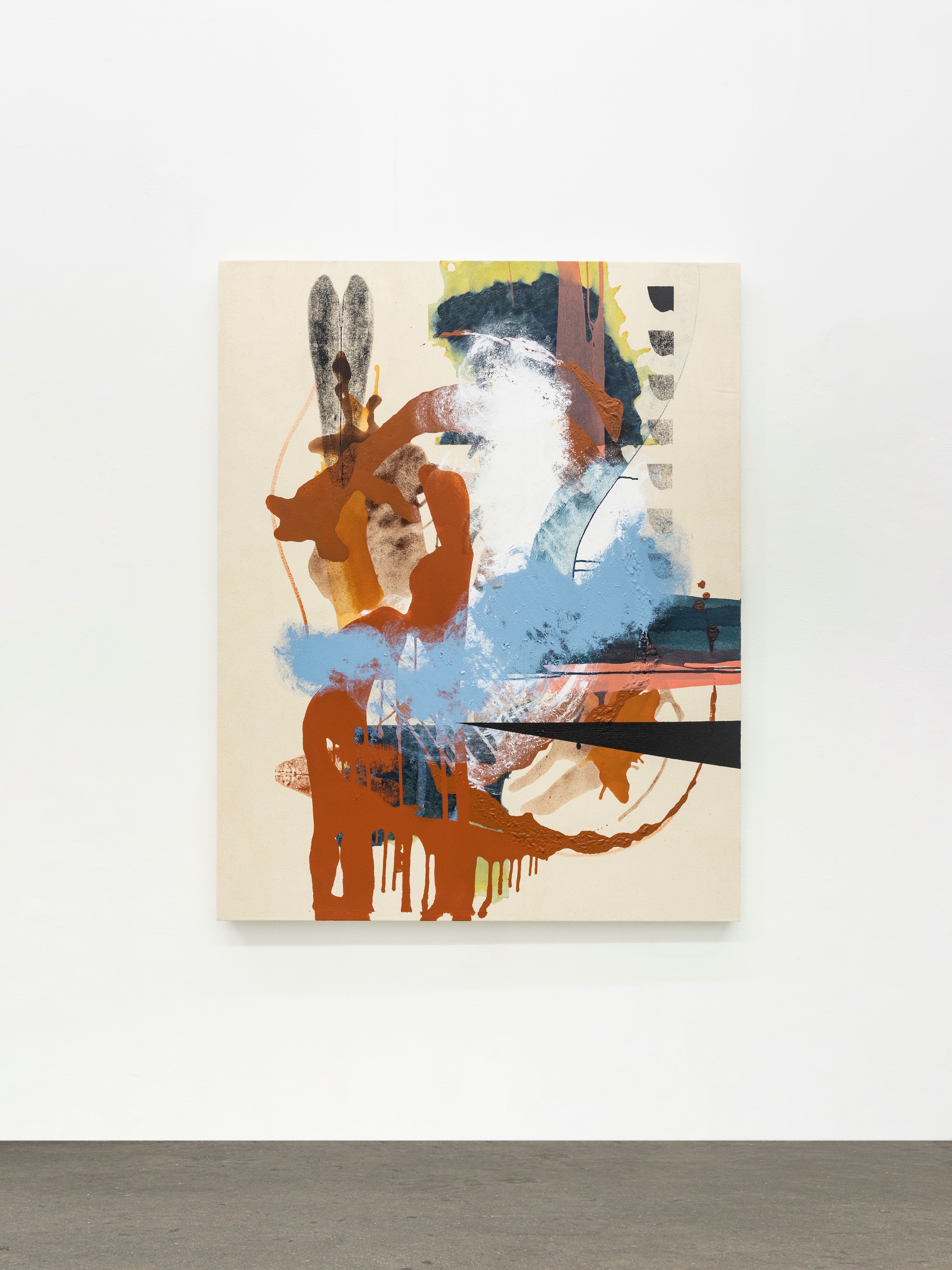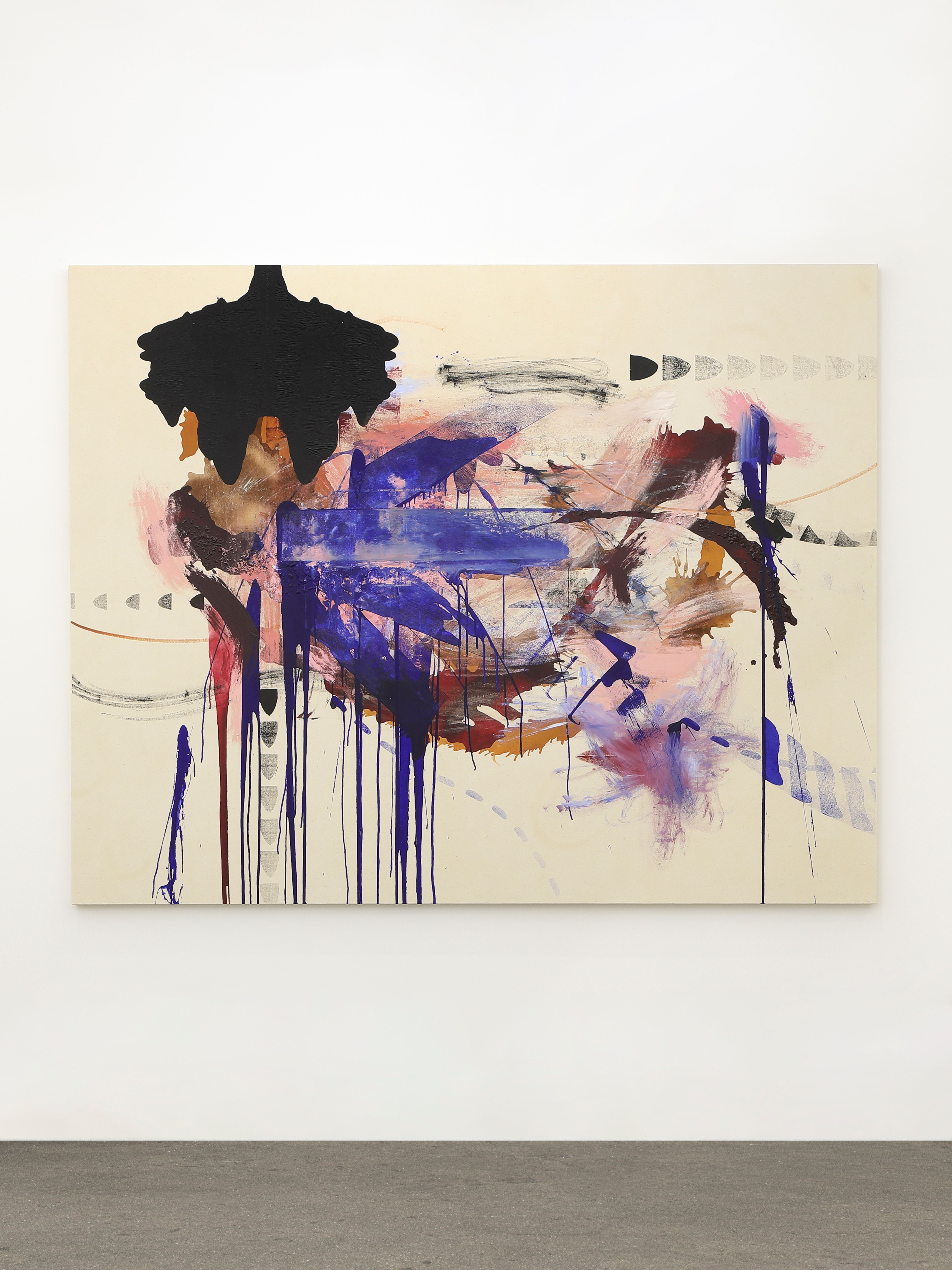 An intensely physical painter, Neel’s mysterious shapes, symbols and strokes in acrylic are poured, brushed, printed, folded, stamped, rolled and dragged onto raw canvas, only to be stretched after completion. As if tilling, harrowing, and leveling a field, it is not surprising that these paintings, made over the long Covid months, were wrought in a barn on her family’s farm in Morristown, Vermont.