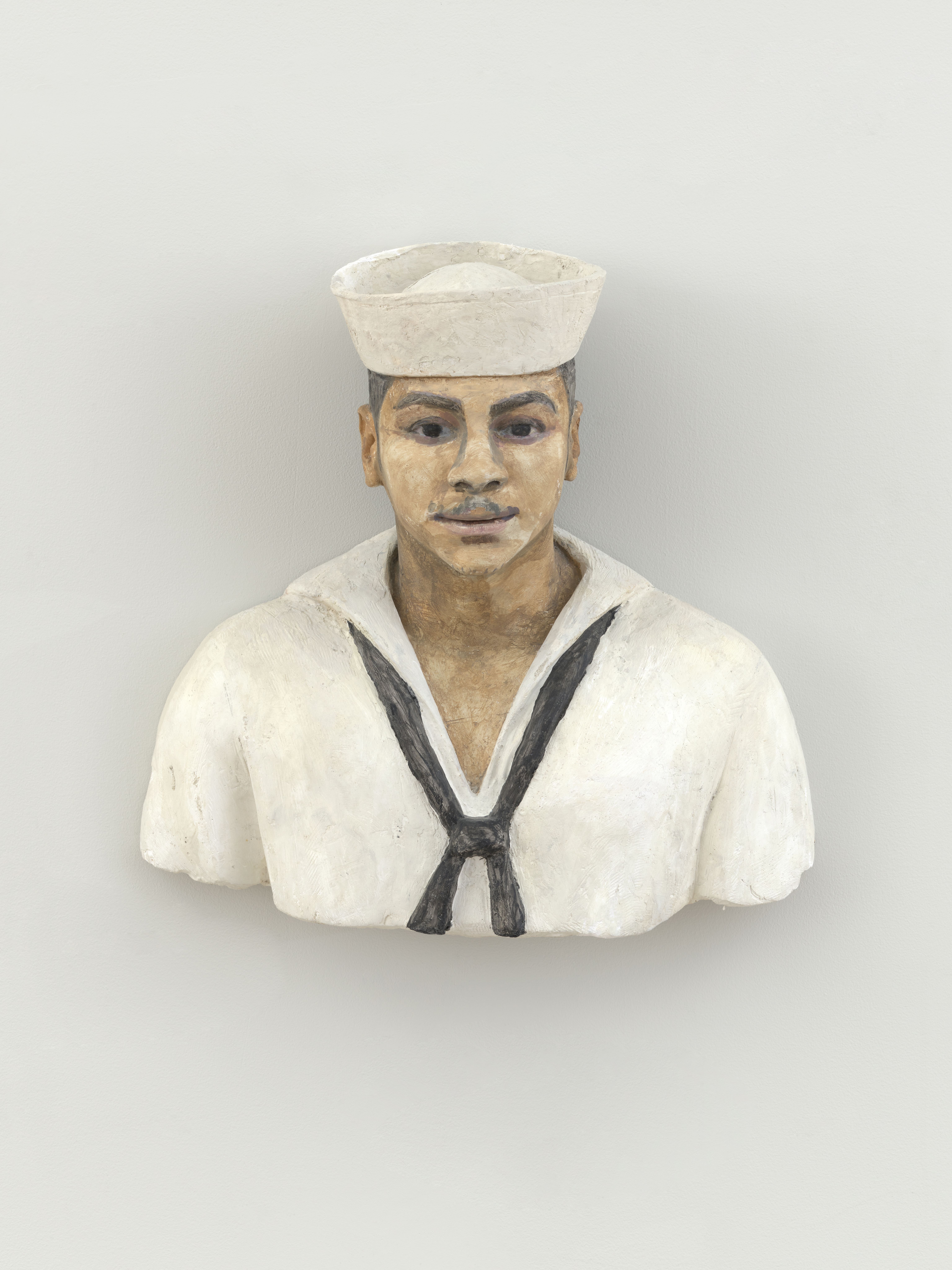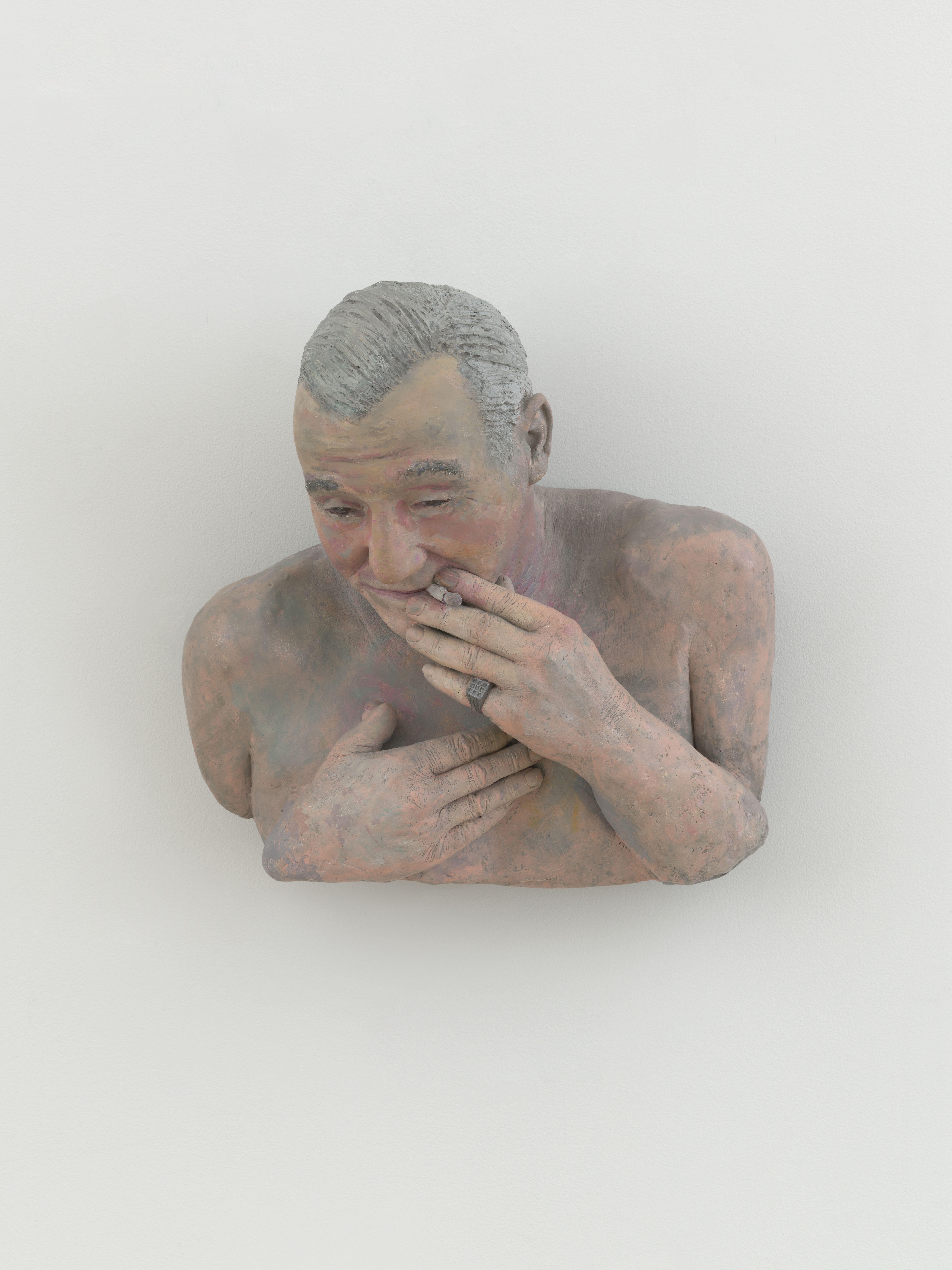 Immediately following his residency at Fashion Moda, Ahearn briefly returned to live and cast at his East Village apartment shared with the legendary actress and gallerist Patti Astor. His return also reconnected him with the radical, self-funded artist communities of the downtown scene of which he was a member prior to his Fashion Moda days: namely Collaborative Projects, Inc. (Colab) and Club 57. It was at Club 57, a no-budget arts and music venue located in the basement of a Polish church at 57 St. Marks Place, where Ahearn would screen some of his earliest short artist films, including Bronx Train (1977), which tracked a frenzied ride from Lower Manhattan, as well as a series of interviews with transients in Scranton, Pennsylvania conducted during a brief sojourn there in 1977. Both films attest to Ahearn’s deeply humanistic approach to his practice, both in film and sculpture. During this period Ahearn met septuagenarian Eddie Moshier and invited him back to his apartment to be cast. The resultant portrait is sensitively rendered with realism and gravitas. His shirtless torso and downturned face are fissured with signs of aging; despite this, Moshier’s pinky ring, cigarette, and sleekly combed hair express his indisputable cool. Ahearn’s treatment of Moshier as a subject, as well as his subsequent casts, recalls the paintings of his artistic predecessor Alice Neel (as noted by Hilton Als), whose portraits of largely overlooked members of society brilliantly and simultaneously convey their beauty and awkwardness. Moshier’s portrait is a major work from this period and was included in The Museum of Modern Art’s Club 57 exhibition in 2017.