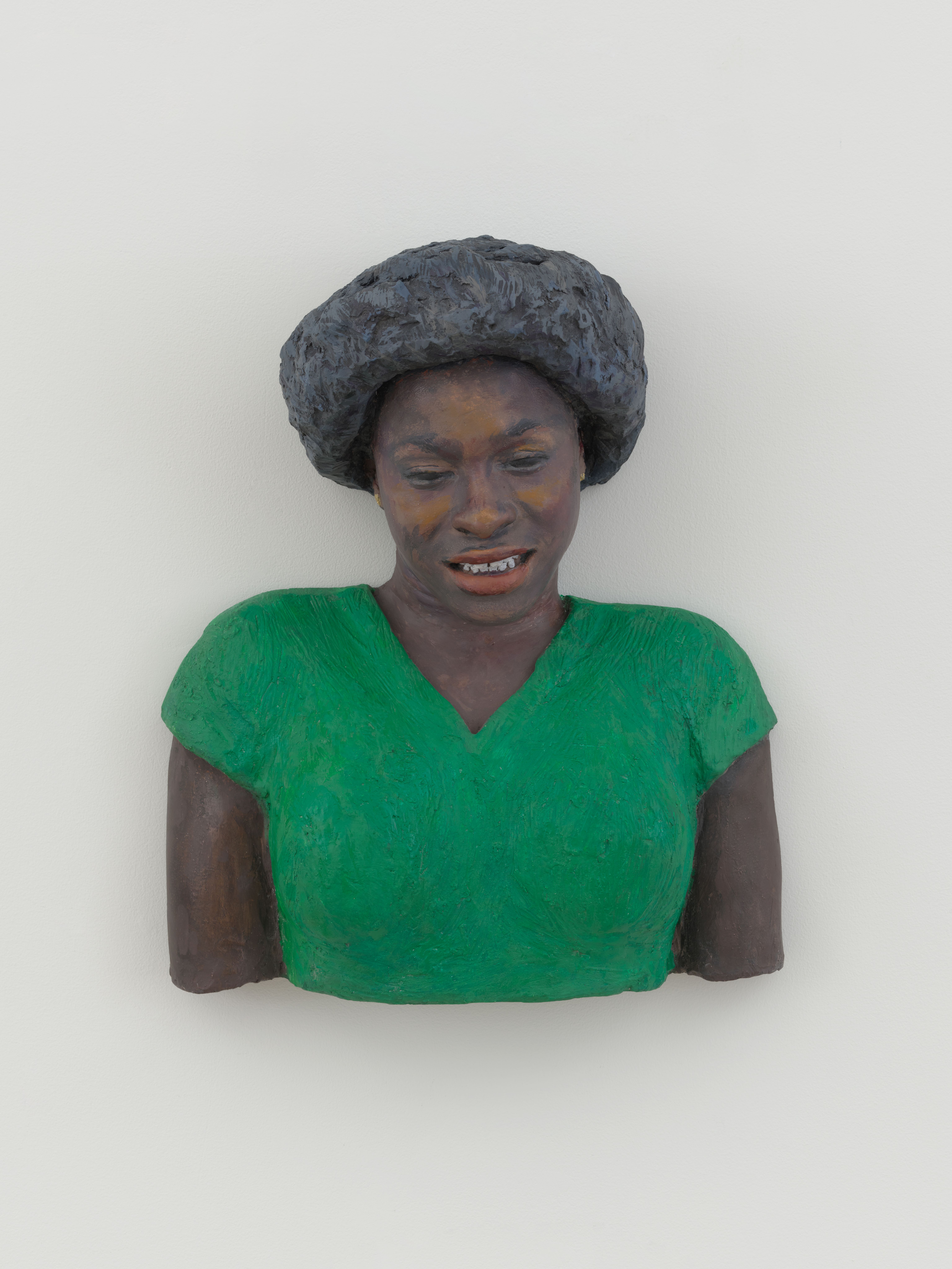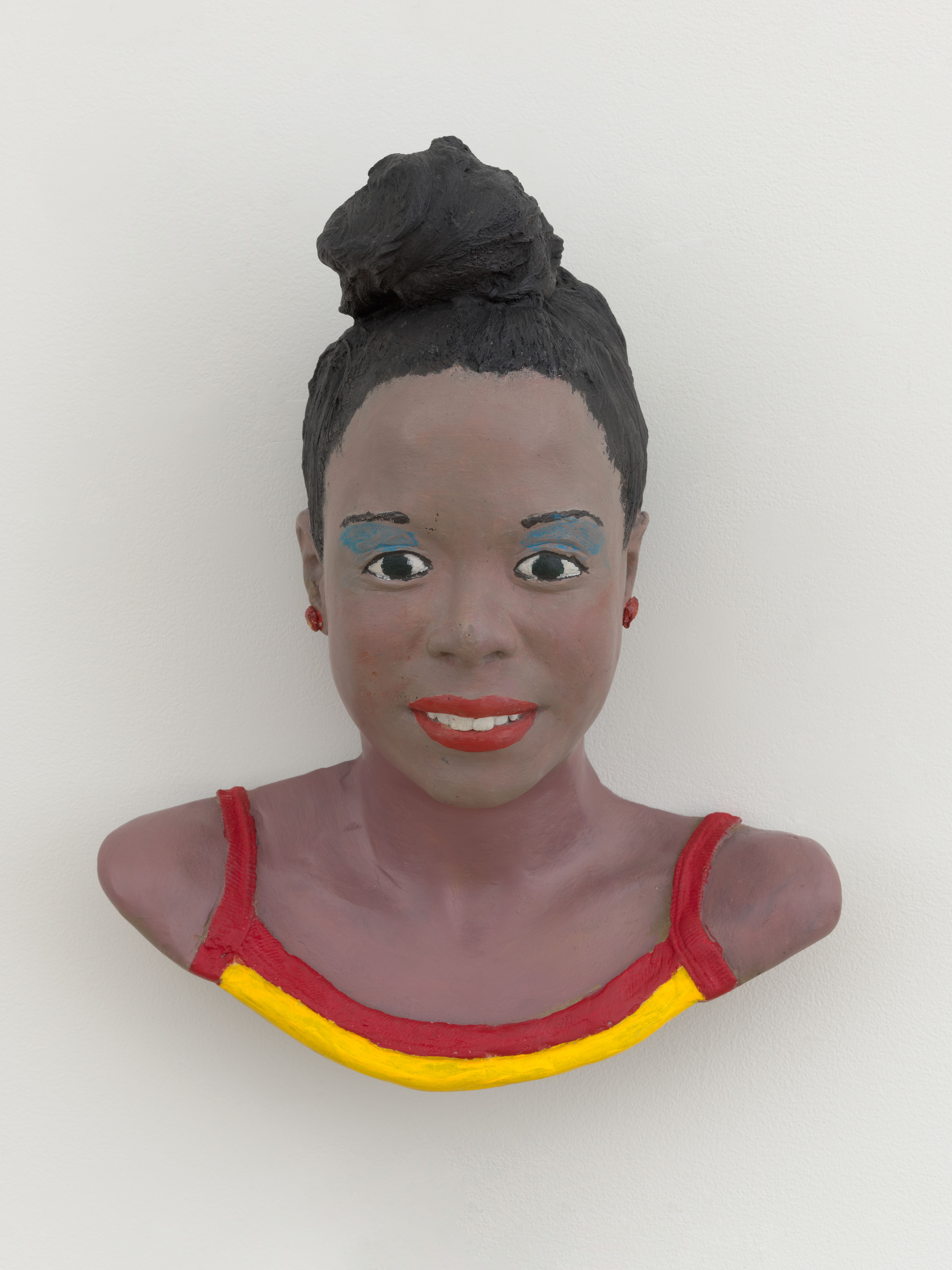 Eddie Moshier (1979) was soon installed at the influential 1980 Times Square Show organized by Colab. The guerilla-style exhibition, called “The First Radical Art Show of the ‘80s” by The Village Voice, featured Ahearn and Torres casting regular people onsite before a wall of portrait busts from The South Bronx Hall of Fame made at Fashion Moda just one year prior. Soon thereafter Torres collaborated with Ahearn on Teri (1980), cast from an elegant dancer and model whose peaceful expression (eyes closed, brow relaxed, lips slightly parted) belies the uncomfortable casting process. Teri embodies what would become the hallmarks of Torres’ individual practice: an almost cartoonish treatment of paint, vibrant color, and a joyful sense of play (Torres notes the three tear droplets as a nod to the subject’s name).