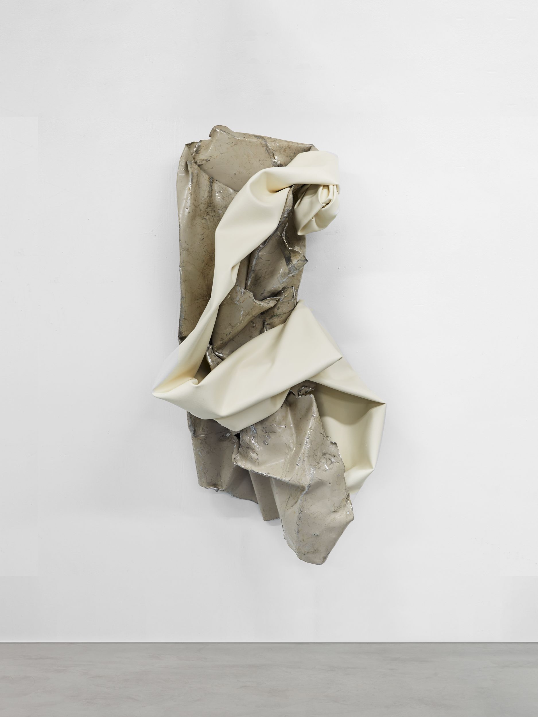Recoil (2017) is an entirely metal work; Prototype (2018) is a largely metal work that incorporates faint moments of cream paint skins; and Regeneration (2021) is nearly a different species of work that backgrounds the metal elements and foregrounds the paint skin’s full capacity.