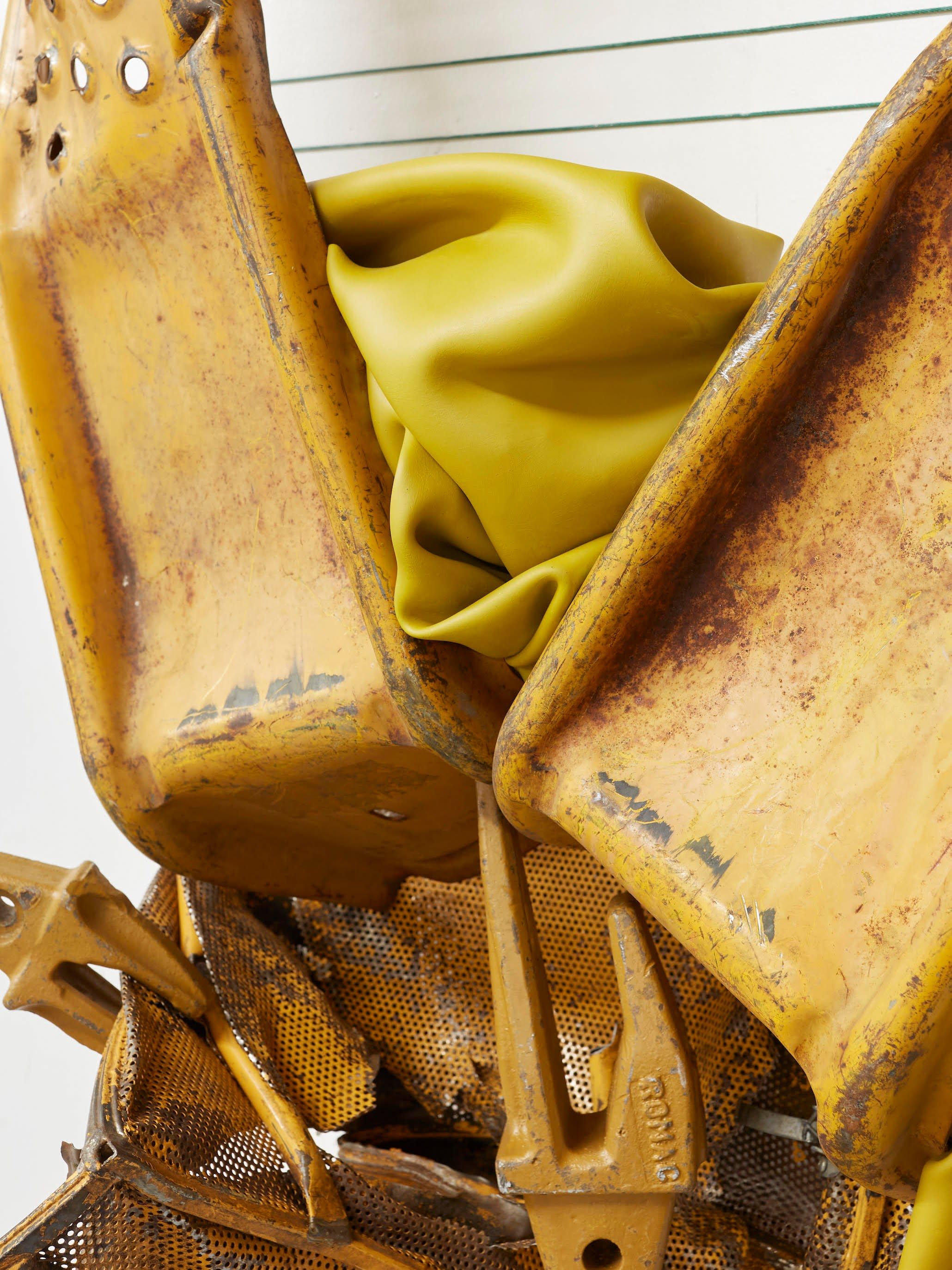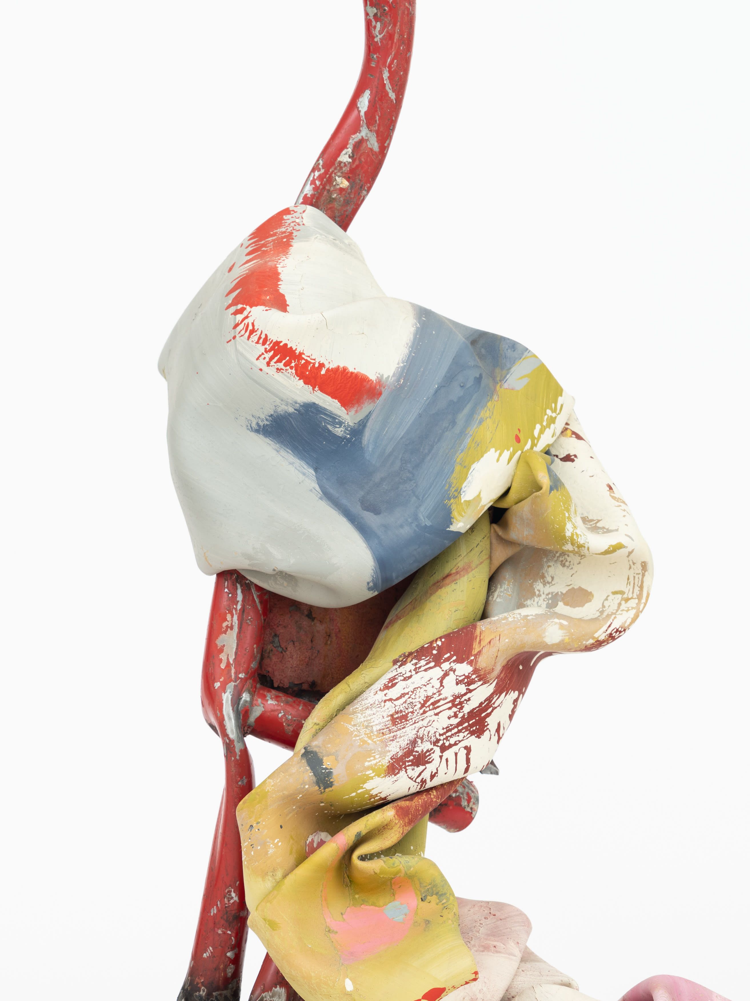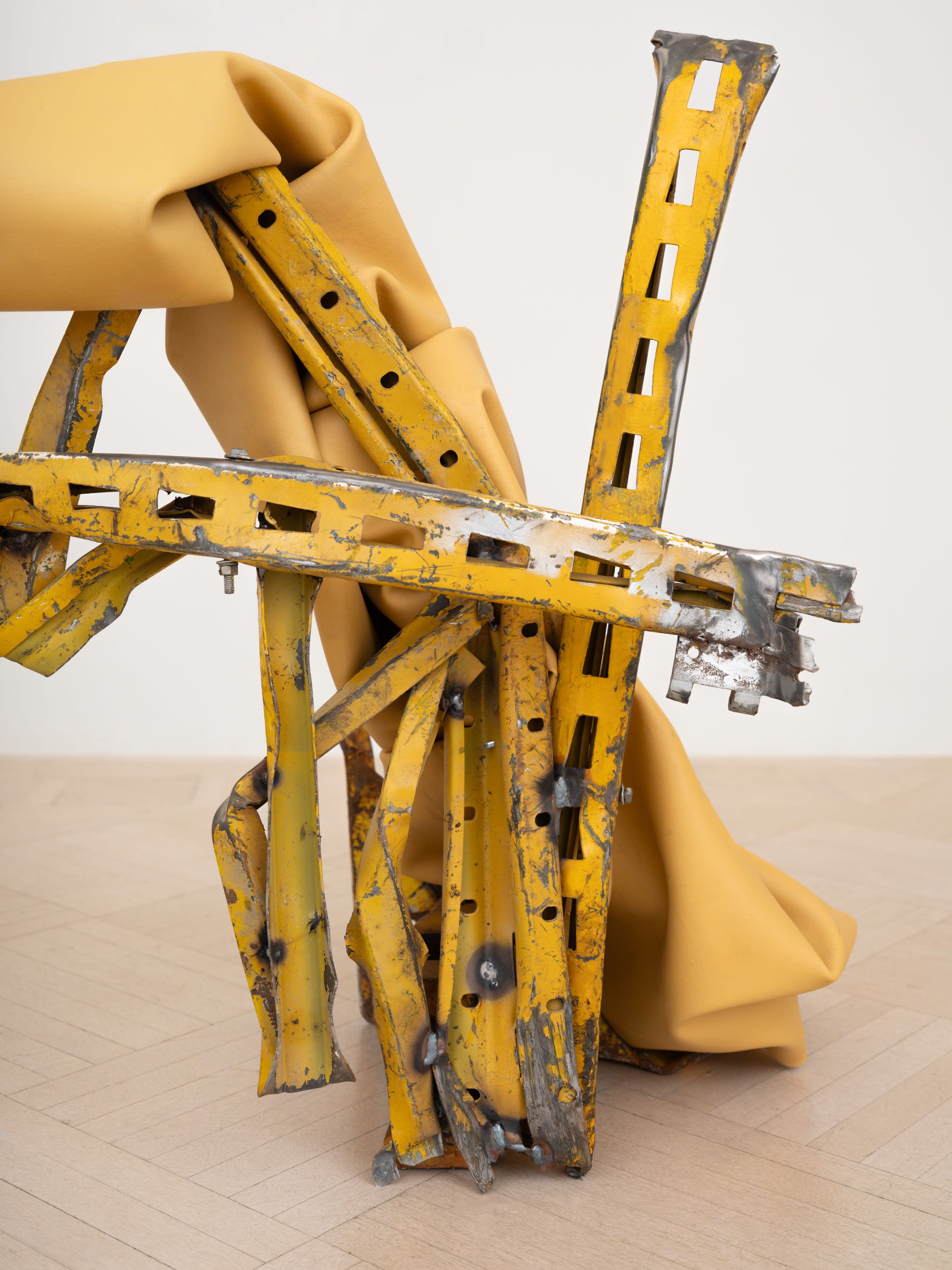 In With Fire and Blood (2024), the red metal column is consumed, overwhelmed by drapery at the top of the two-foot-high tabletop object, in a state of metamorphosis from refuse to requisite. Studio tools are implicated in this work as their incendiary role reinforces the act of making. And in Cy’s Vision (2024), a slithering skin gently winds around a metal frame, swallowing its rigidity with enveloping softness. Yanko’s work is nonrepresentational, but as we linger over the physical potential for continuing transformation of materials, there is room for narrative.