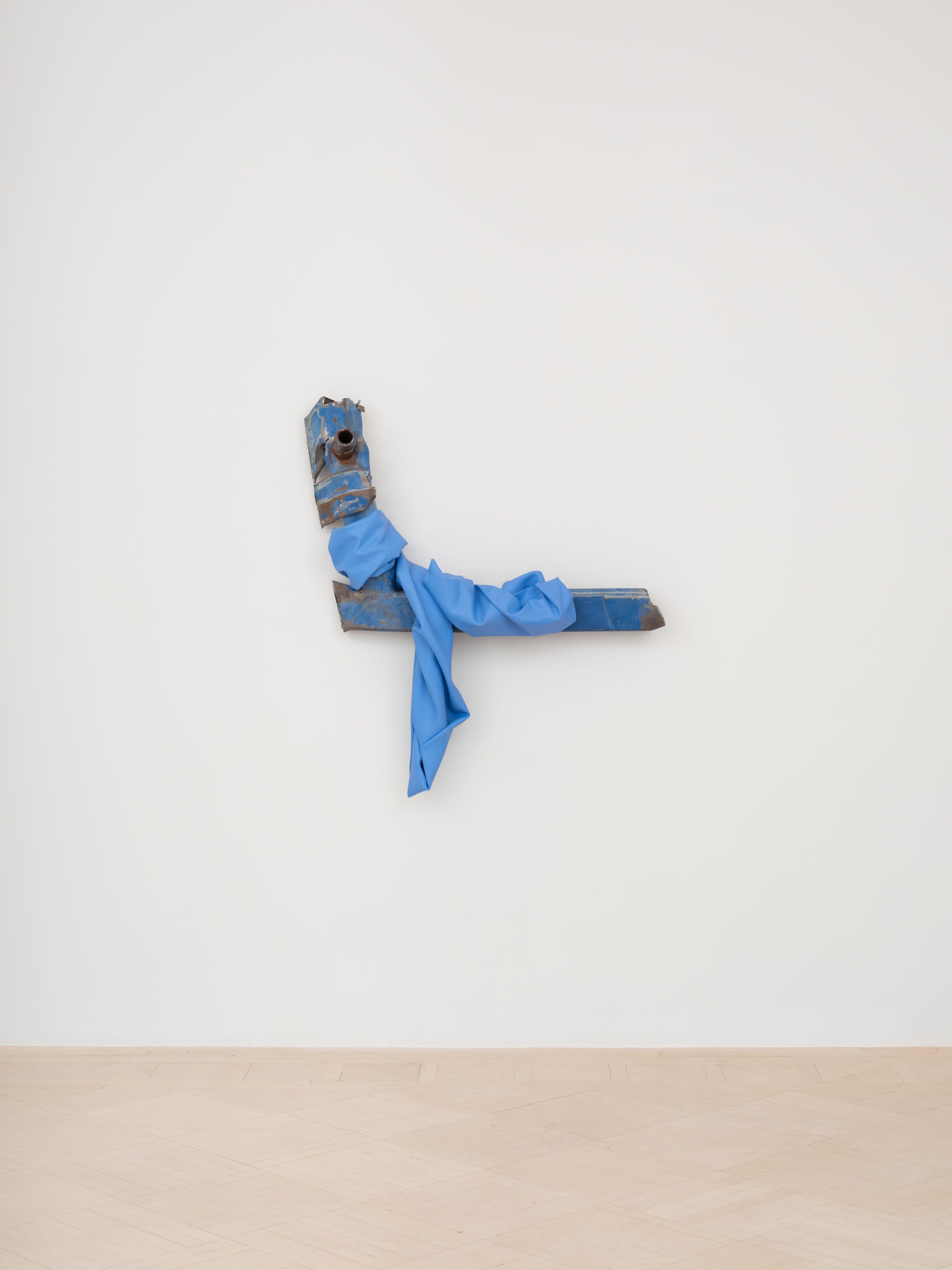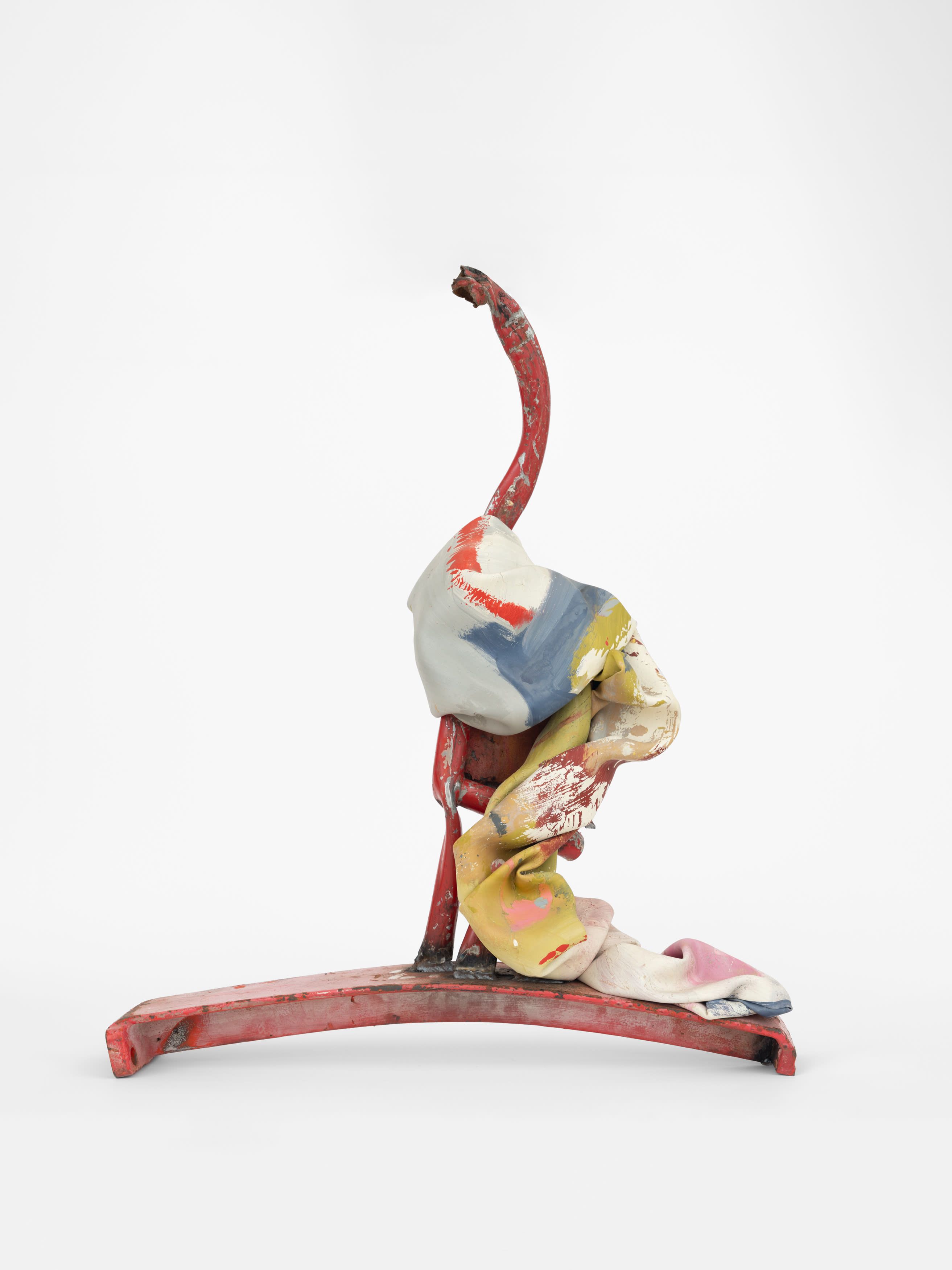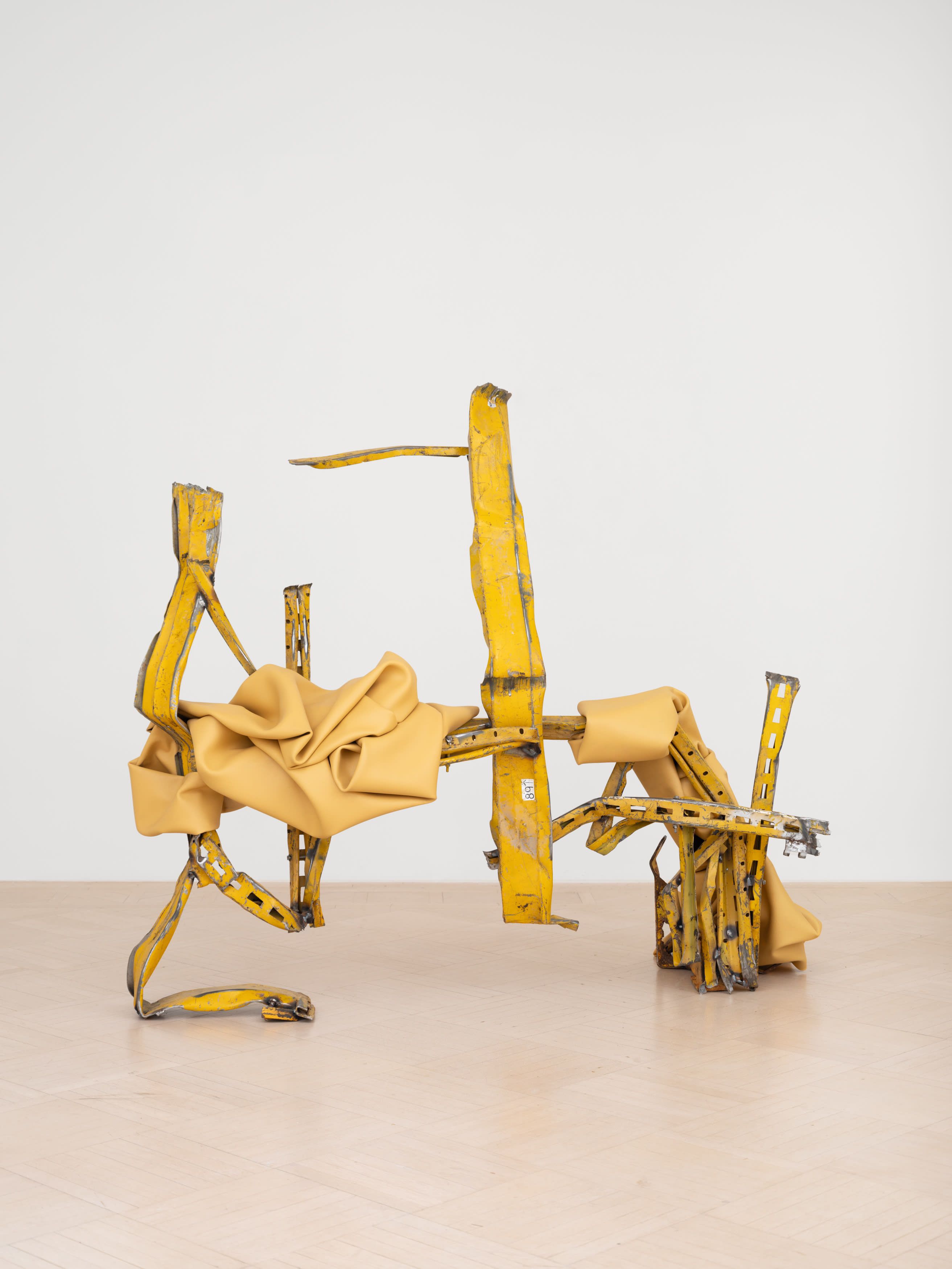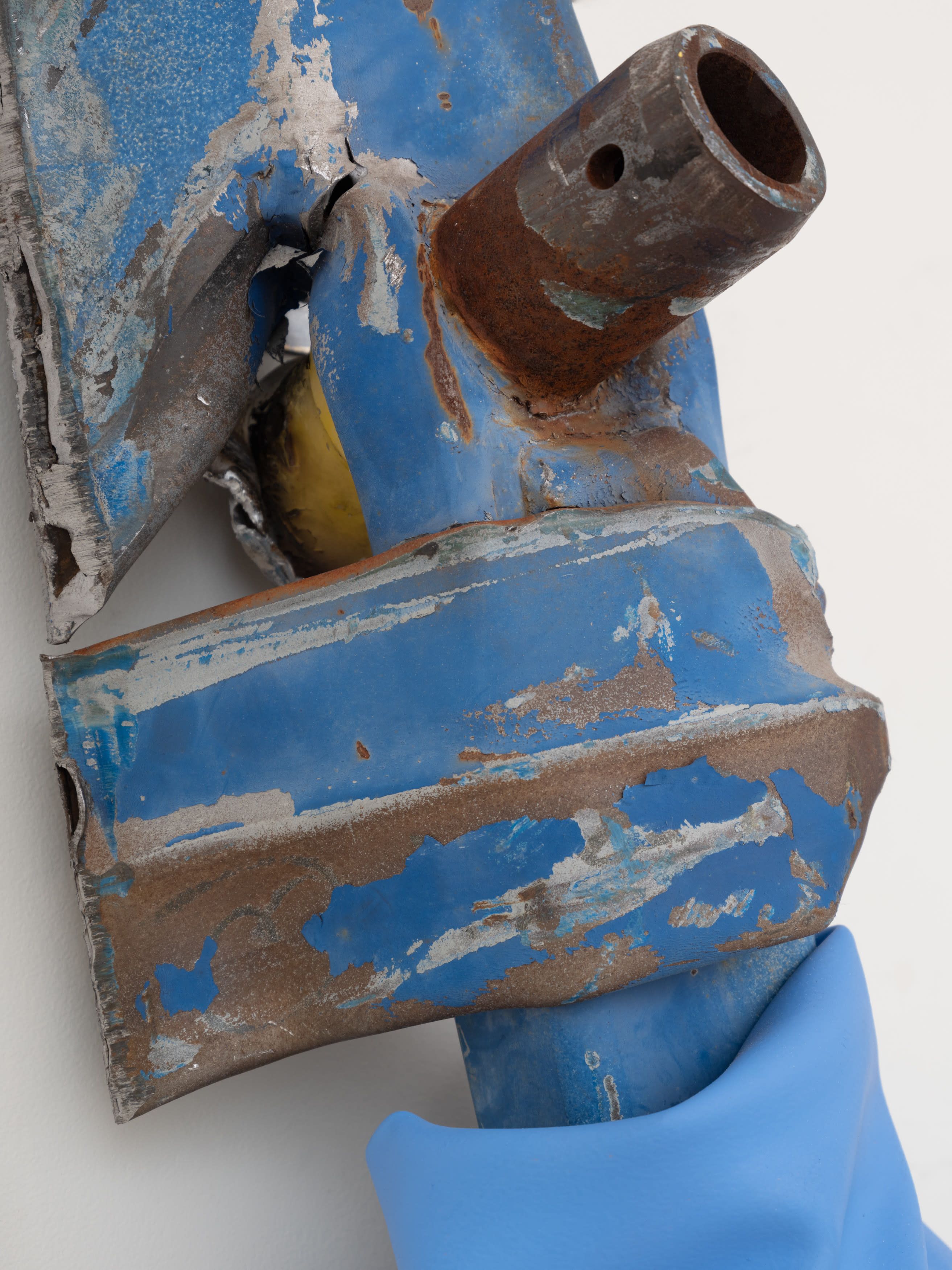 In With Fire and Blood (2024), the red metal column is consumed, overwhelmed by drapery at the top of the two-foot-high tabletop object, in a state of metamorphosis from refuse to requisite. Studio tools are implicated in this work as their incendiary role reinforces the act of making. And in Cy’s Vision (2024), a slithering skin gently winds around a metal frame, swallowing its rigidity with enveloping softness. Yanko’s work is nonrepresentational, but as we linger over the physical potential for continuing transformation of materials, there is room for narrative.