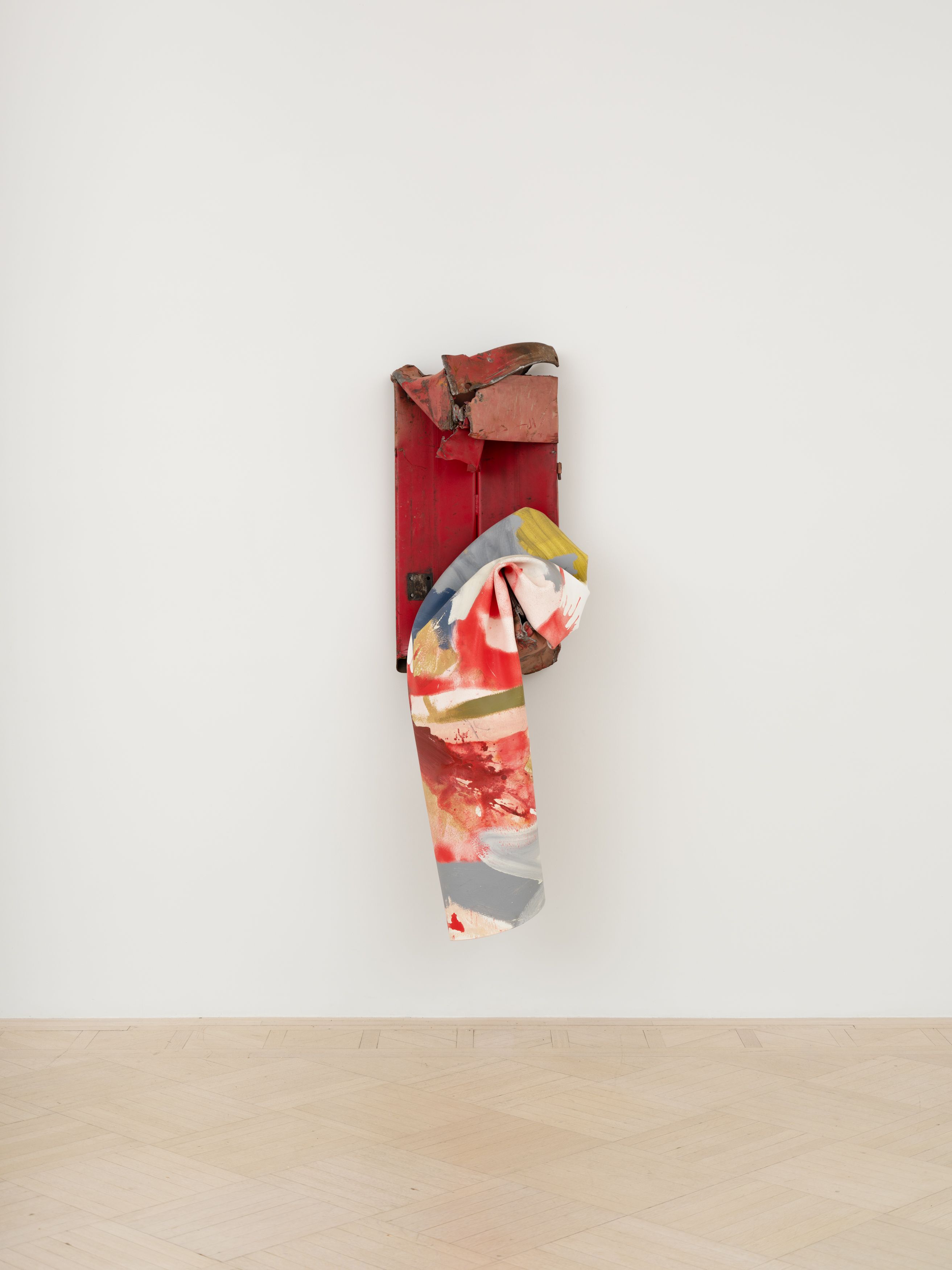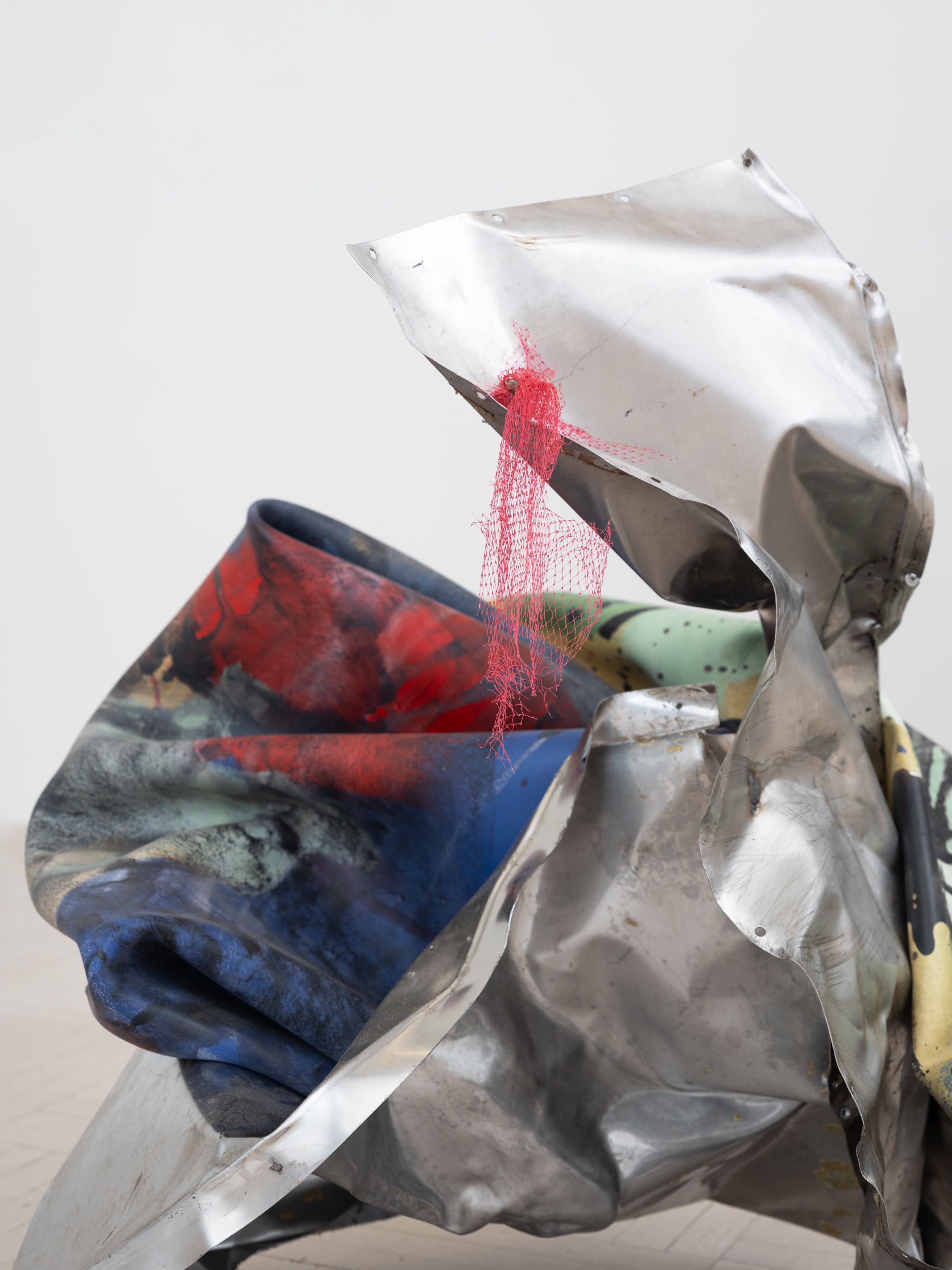 Paludamentum (2024), at just twenty-eight inches high, incorporates the same materials in smaller scale. The colorful painted skin lists amorously to one side and nestles into the salvaged red steel ground that welcomes and expels its softer counterpart. The title is a further response to Yanko’s fascination with garments worn in the ancient world—here, a mantle secured on a military commander’s shoulder. Unlike other examples in this series, the wall relief Rupture Future (2025) is harmonious; a folded paint skin is closely tucked into its same-shaped metal counterpart, and their pairing takes wing with an antenna gently dropping from the sculpture. Balance is subtly, expertly, cogently disrupted in Yanko’s hands. That elegant instant is surrendered in the floor work Stretched to Break (2025), where paint skin and metal collaborate so provocatively that they are on the precipice of combustion. Yanko executes the duality with two traces of red: one on the furious painted surface of the skin, the other with a suspension of netting trickling from the metal.