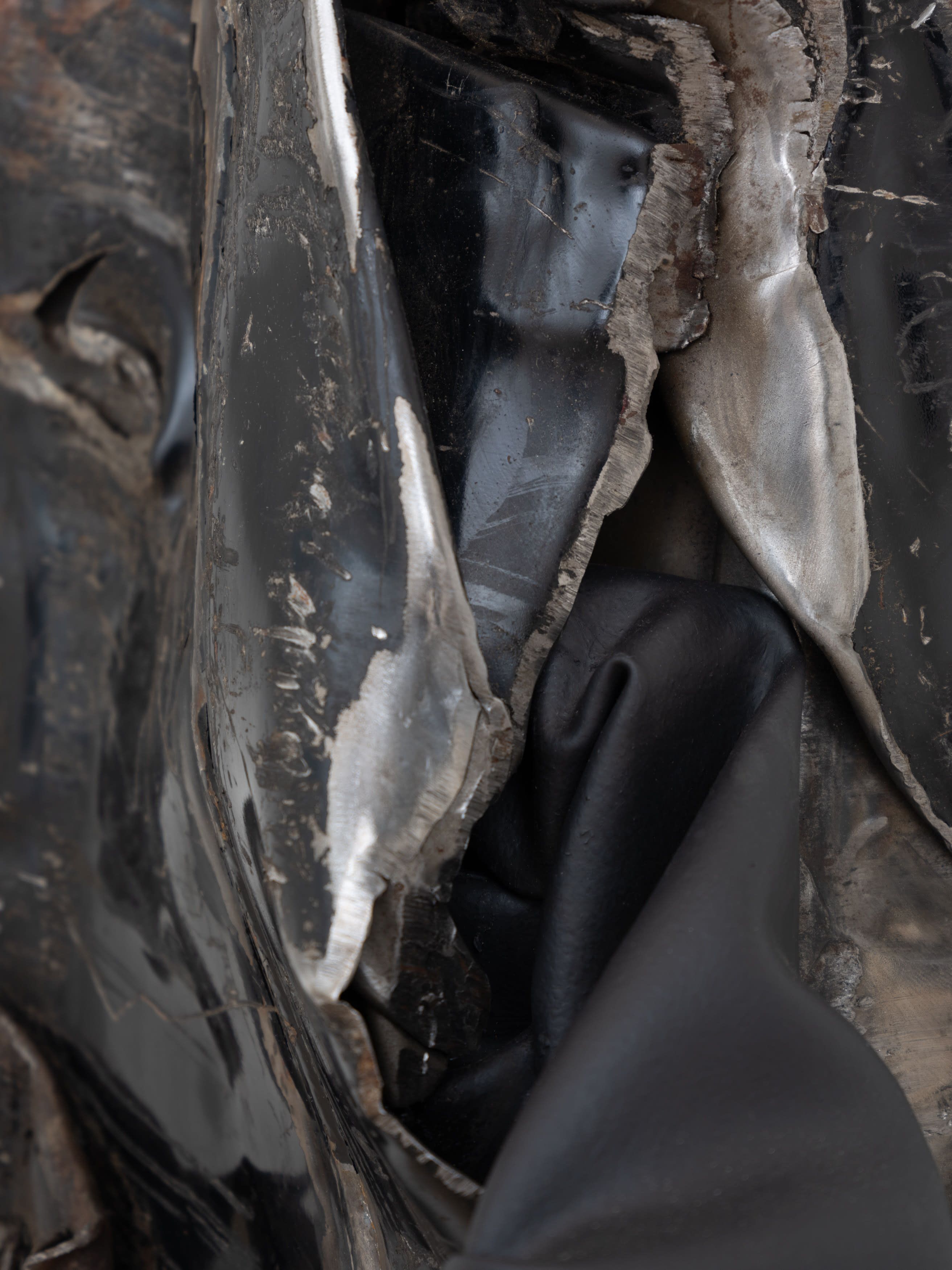 Kennedy Yanko (b. 1988, St. Louis MO) is a sculptor and installation artist whose works in salvaged metal and paint skin defy the limitations of their respective media. Sourcing junkyard scraps from Brooklyn to Miami, Yanko overlays these crushed metallic frames with lush “skins” which she produces by heaving gallons of latex paint onto her studio floor, letting it harden into a malleable fabric-like shroud. Over the last year, her monochrome skins have increasingly embraced a more kaleidoscopic, painterly approach, reflecting an Abstract Expressionist sensibility. While this luxuriant draping appears weightless, the process of moulding them into the gestural folds and crevices of their metal bases requires significant strength. This transmutation of material finds root in the artist’s lifelong commitment to Daoist principles, which foreground both a harmonious coexistence with nature and a willingness to see beyond the immediately visible.