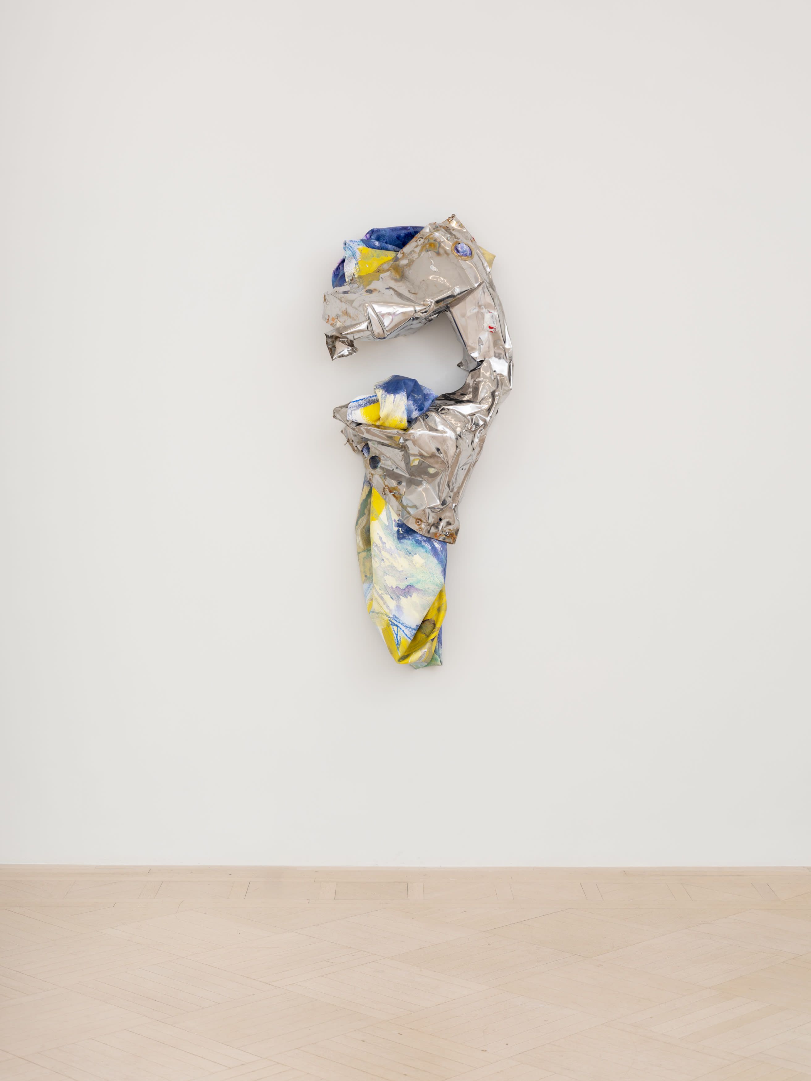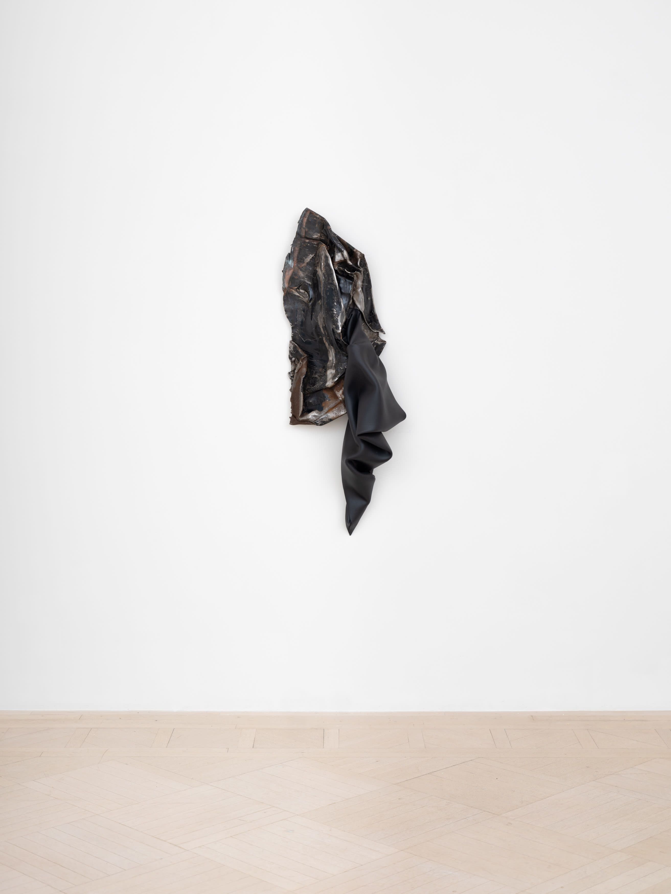 In Talisman (2024), an almost six-foot-high relief that hugs the wall, a painted skin is draped in the lower register, casually resting on a vertical metal door. The sculpture is in dynamic motion; Yanko created it with the Winged Victory in mind. Lodged in Talisman is also a classic Hollywood movie story, with a glamorous sultriness and tough-guy stance. Look closely at that organic wrap, so carefully placed: it resembles a canvas, even a Color Field painting of the 1950s or ’60s that has been rolled up, tossed off, consigned to yesterday. We’re thrust into the realm of an ambiguous homage to Helen Frankenthaler, Sam Gilliam, or Clyfford Still, with acknowledgment that their work isn’t unfurling gloriously, but is instead before us as a remnant, a reminder of art-historical antecedents.