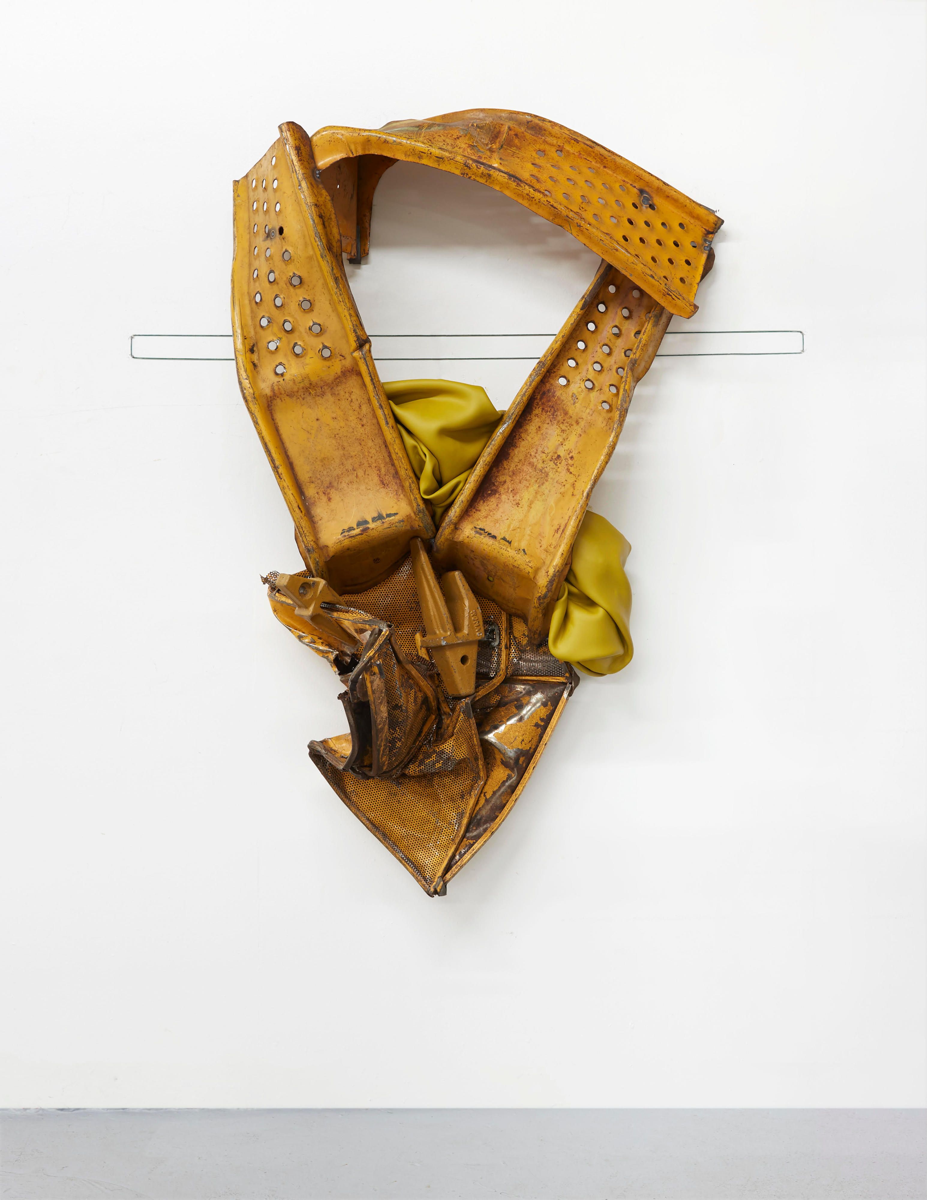 During a recent visit in her studio, Yanko was transported when a guest opened the conversation of how the horror of current matériel employed to destroy people, their lands, and their histories—tanks and drones, explosives and robots, handheld weapons and combat gear—may eventually find a way into artists’ studios, as swords turn into ploughshares. She likewise considers her campaign from salvage yards (where she scours for scraps among the plentiful castoffs) to the studio (where she stockpiles metal fragments whose former use is hinted at by surface paint flecks). Yanko lives with those loaded pieces until she discovers a role for them. The painted skin, poured paint that hardens into relevance, is her origin story, especially when she describes herself as a painter who makes sculpture.