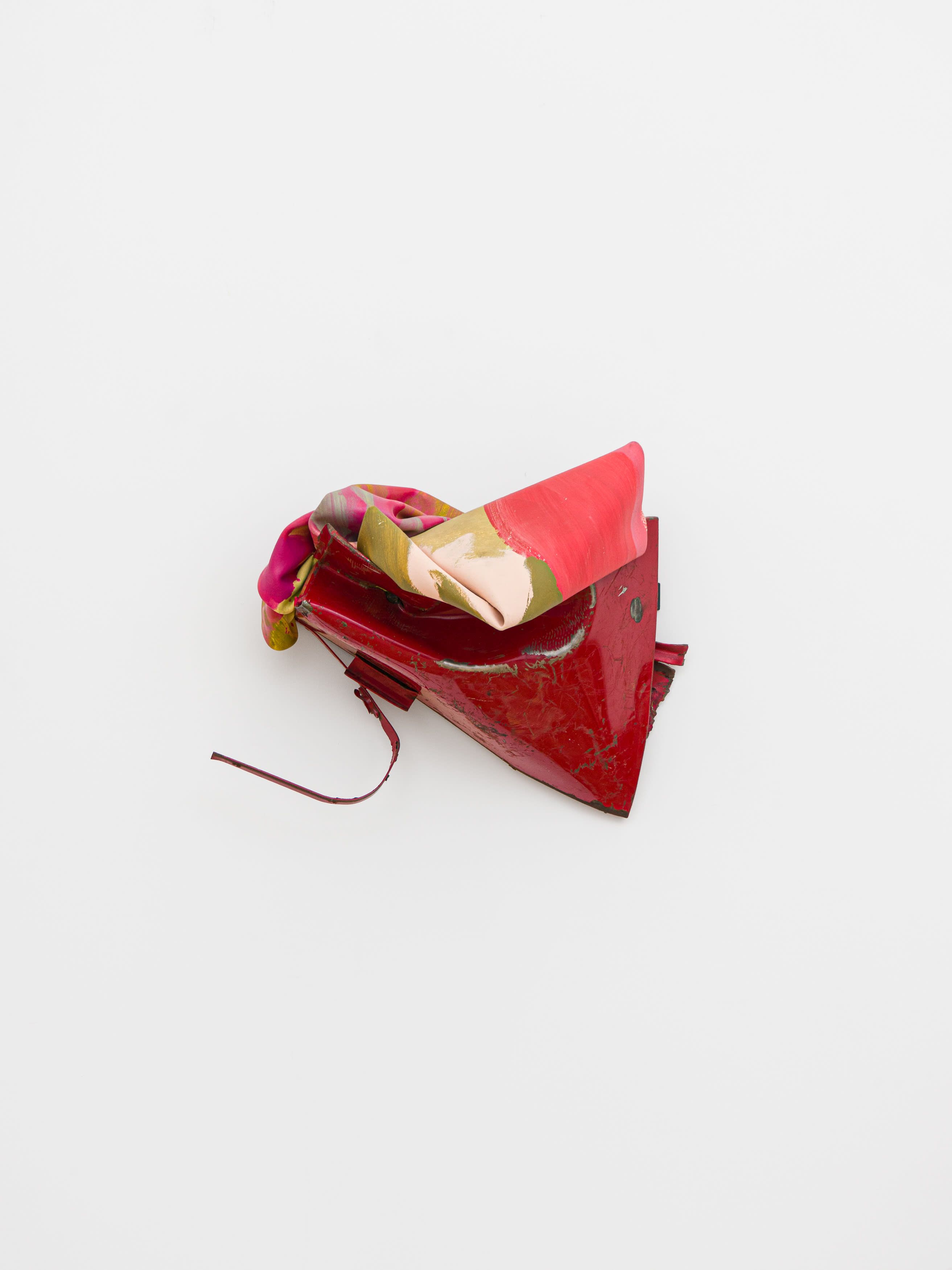 In a new body of work distinctive for the patterning and vitality of color in her painted skins, Yanko identified junked parts—all red—that were formative to her process. She described the sources for this group, installed in one room as coloration coheres formerly disparate elements: “They’re all collected from different places over time and come from different things. I’m not really sure what they were. One part had to be from a car, another from some kind of electrical box. Another one was maybe part of an industrial door.” Any past life or intended function vanishes once Yanko claims the metal odds and ends.