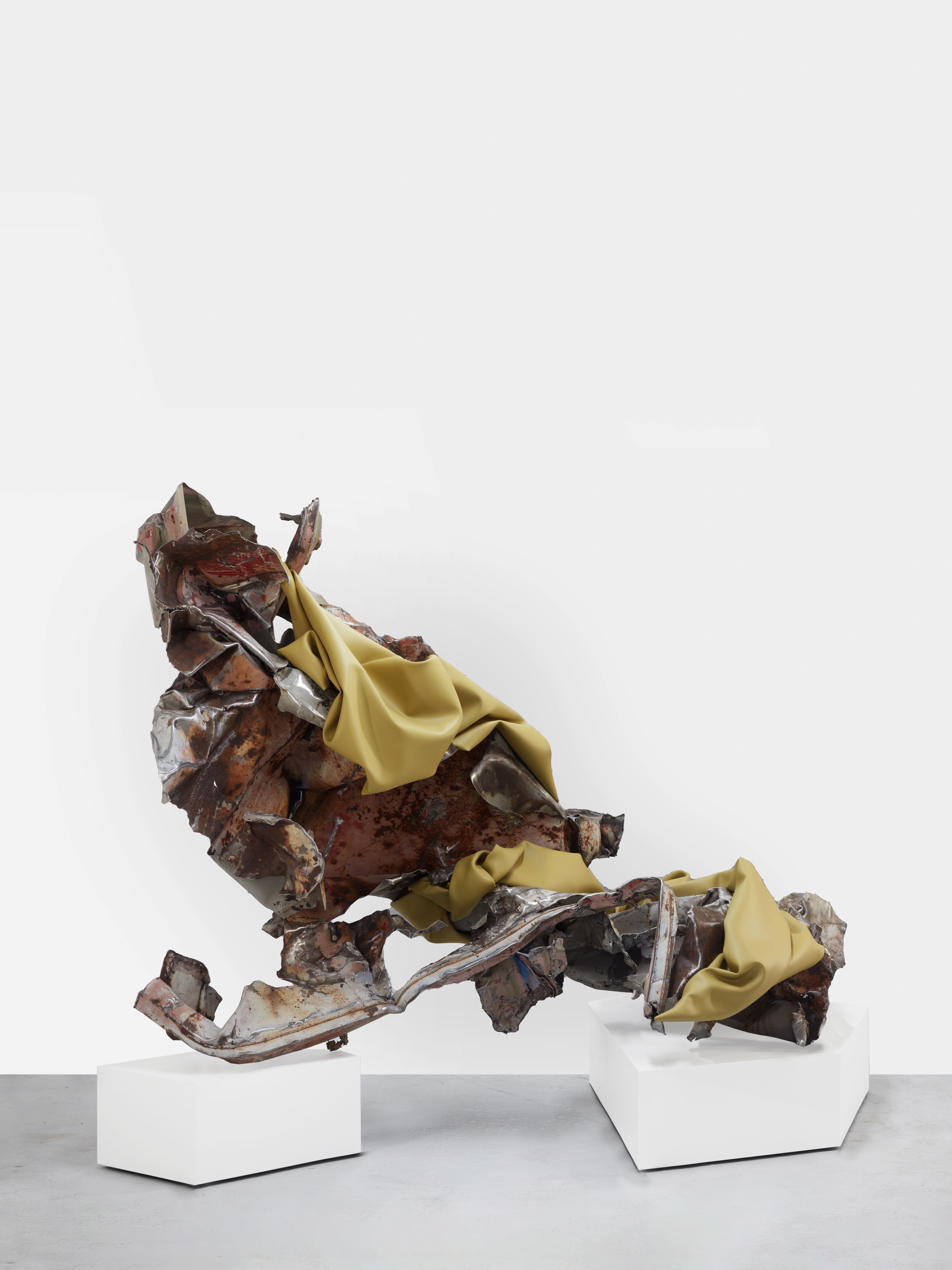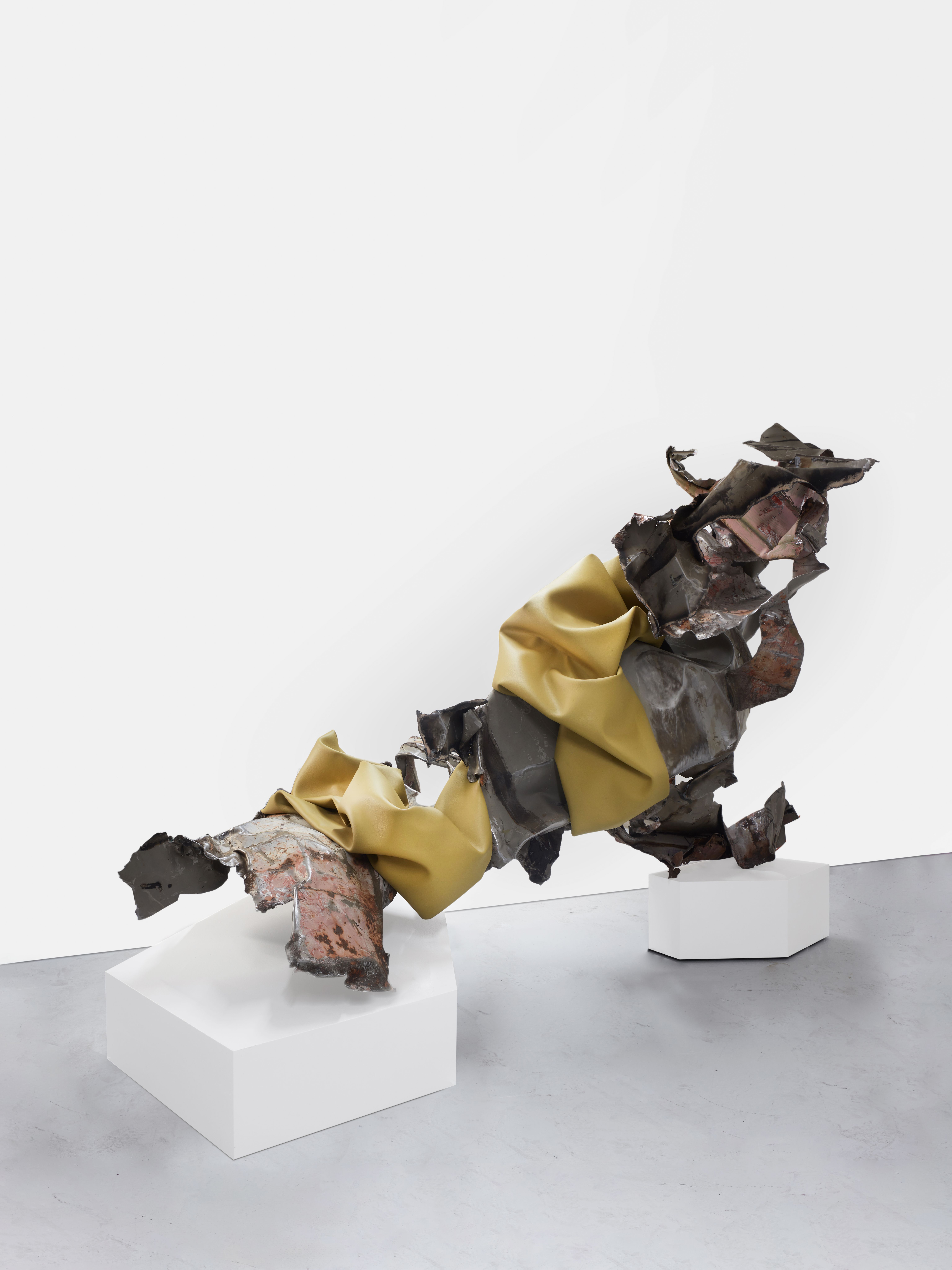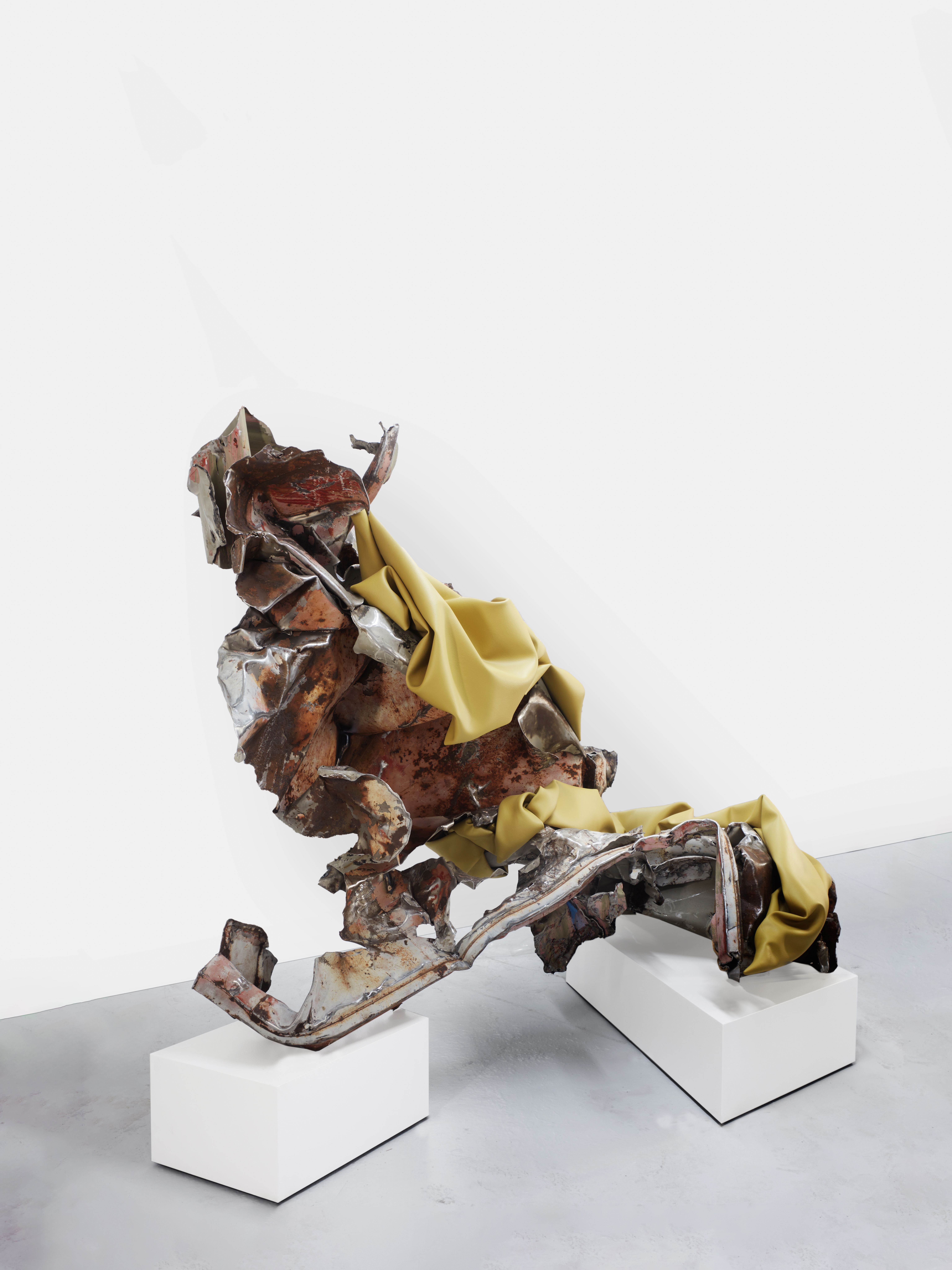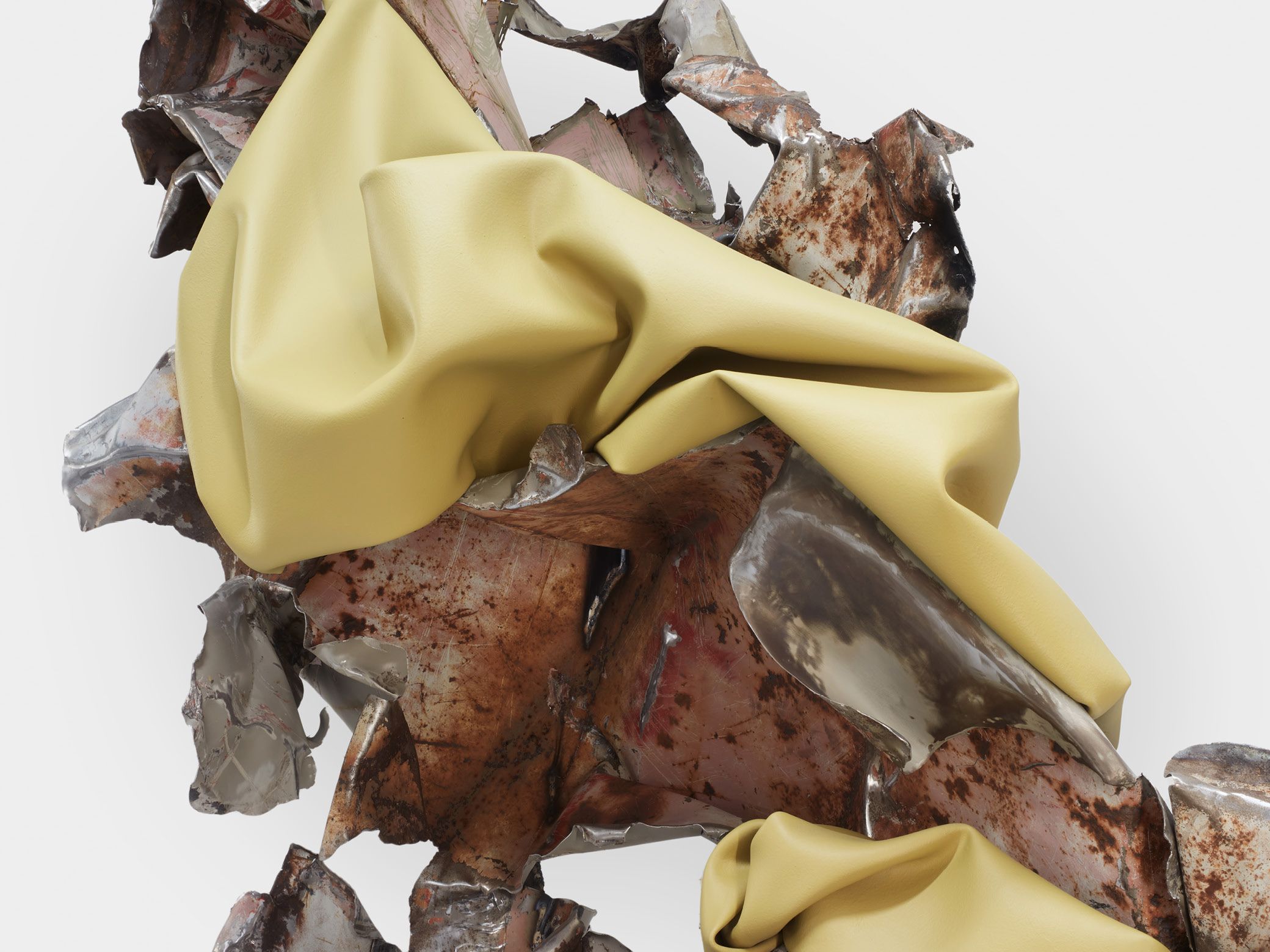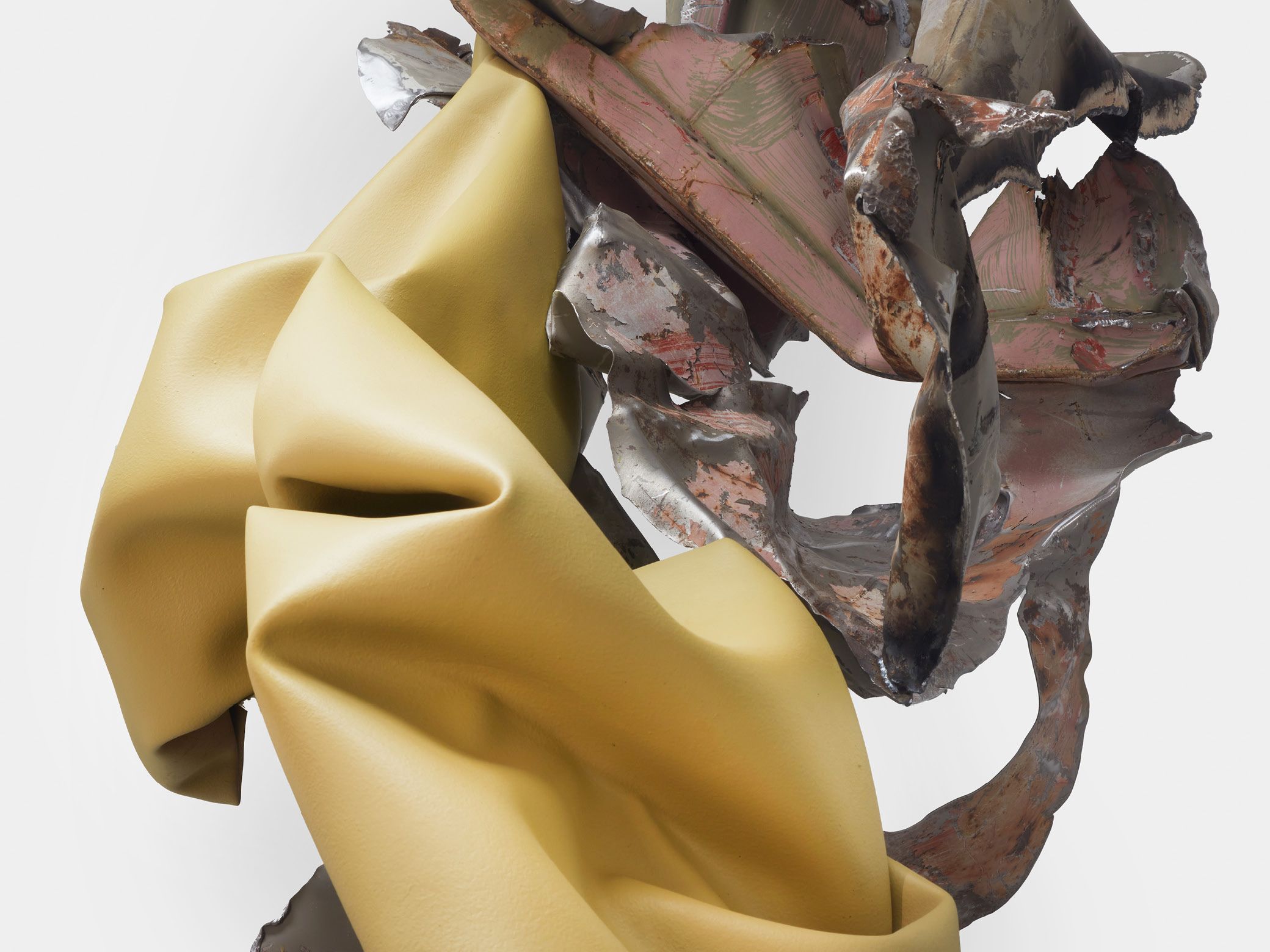 Yanko’s creative process starts in scrap yards where she hunts for distinct colors amid heaps of junk. She treasures tarnished yellows and weathered reds. Back in her studio, she combines and rearranges metal pieces like elements in a collage, often employing crumpling, bending, welding, and surface treatments. She then pours customized latex paint onto plastic sheets, later peeling, sculpting, and placing the skins around the metal structures before the paint completely solidifies. The chartreuse color of Soul Talk was selected in response to the underlying colors nested within the metal’s patina and weathering. The yellow shade teases out its color wheel opposite: magenta with pink hues, furthering the relationship between the two materials. In Yanko’s hands, painting breaks free from the canvas and into our shared space.