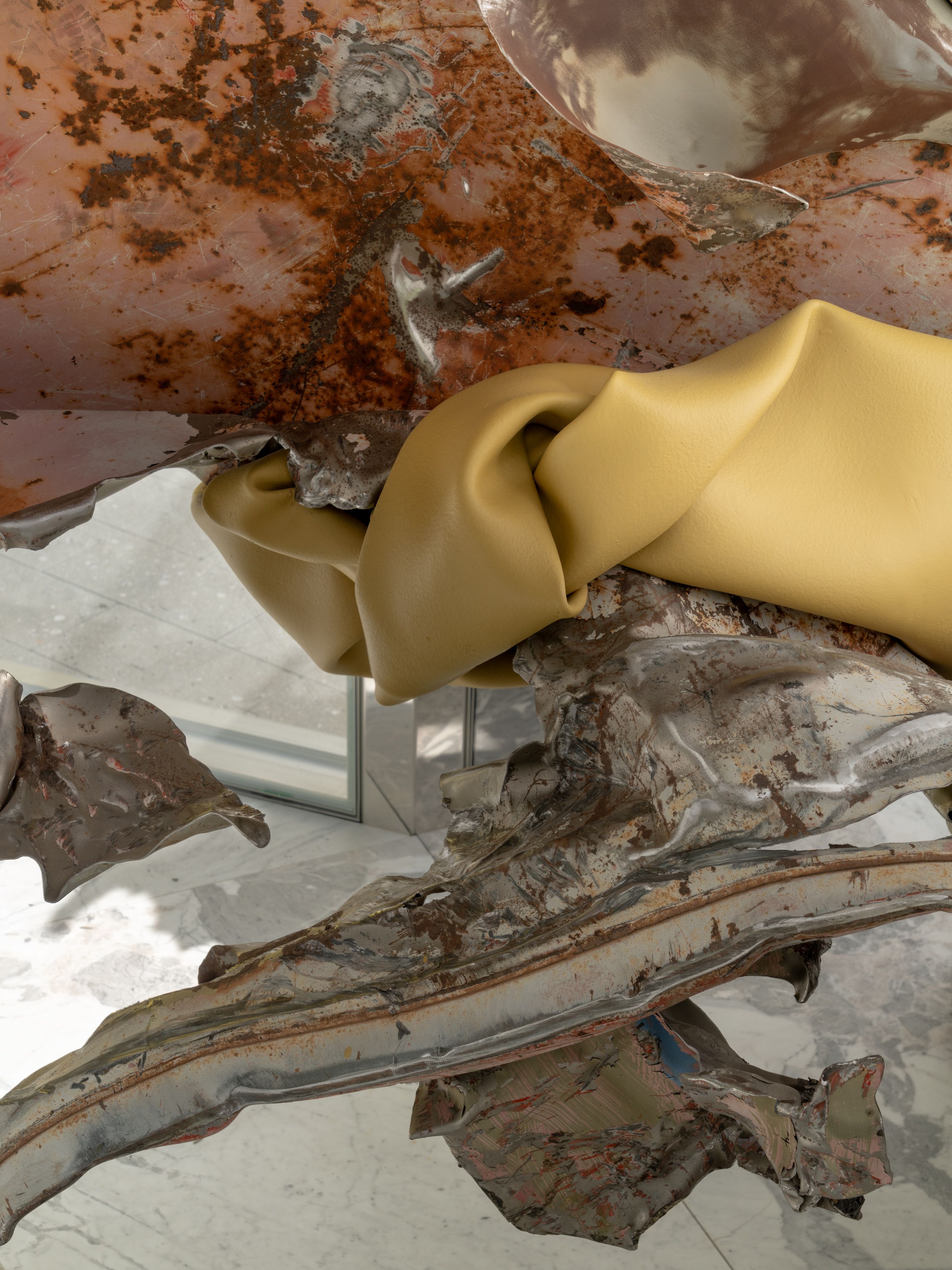 Yanko’s creative process starts in scrap yards where she hunts for distinct colors amid heaps of junk. She treasures tarnished yellows and weathered reds. Back in her studio, she combines and rearranges metal pieces like elements in a collage, often employing crumpling, bending, welding, and surface treatments. She then pours customized latex paint onto plastic sheets, later peeling, sculpting, and placing the skins around the metal structures before the paint completely solidifies. The chartreuse color of Soul Talk was selected in response to the underlying colors nested within the metal’s patina and weathering. The yellow shade teases out its color wheel opposite: magenta with pink hues, furthering the relationship between the two materials. In Yanko’s hands, painting breaks free from the canvas and into our shared space.
