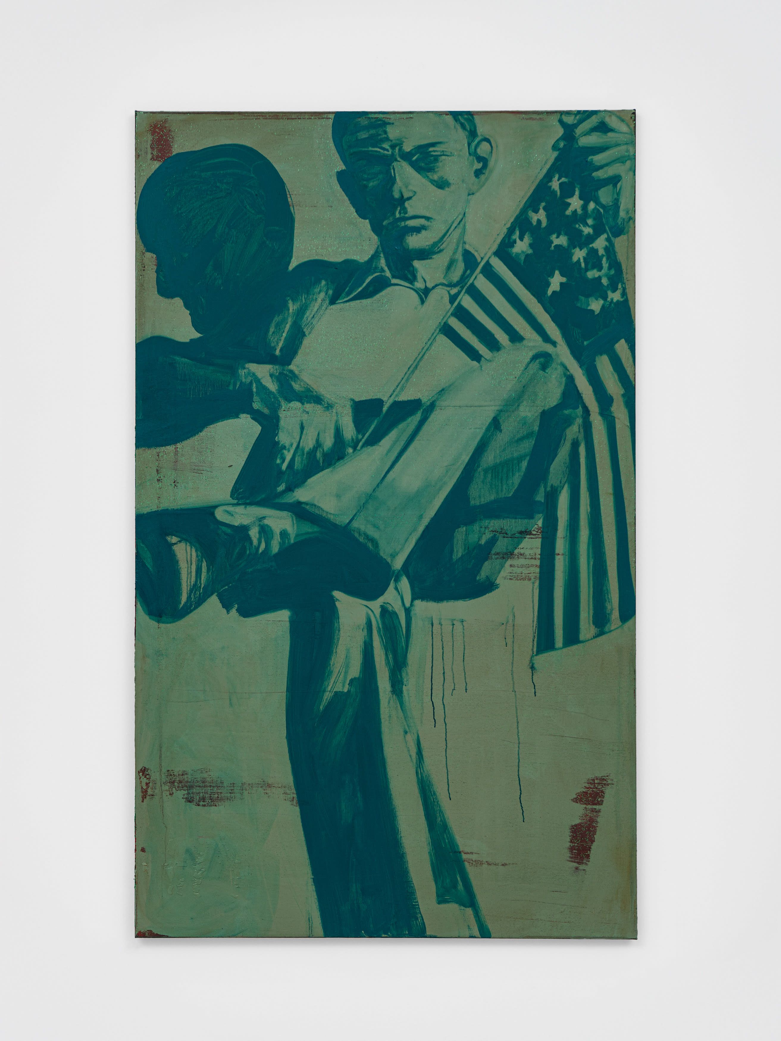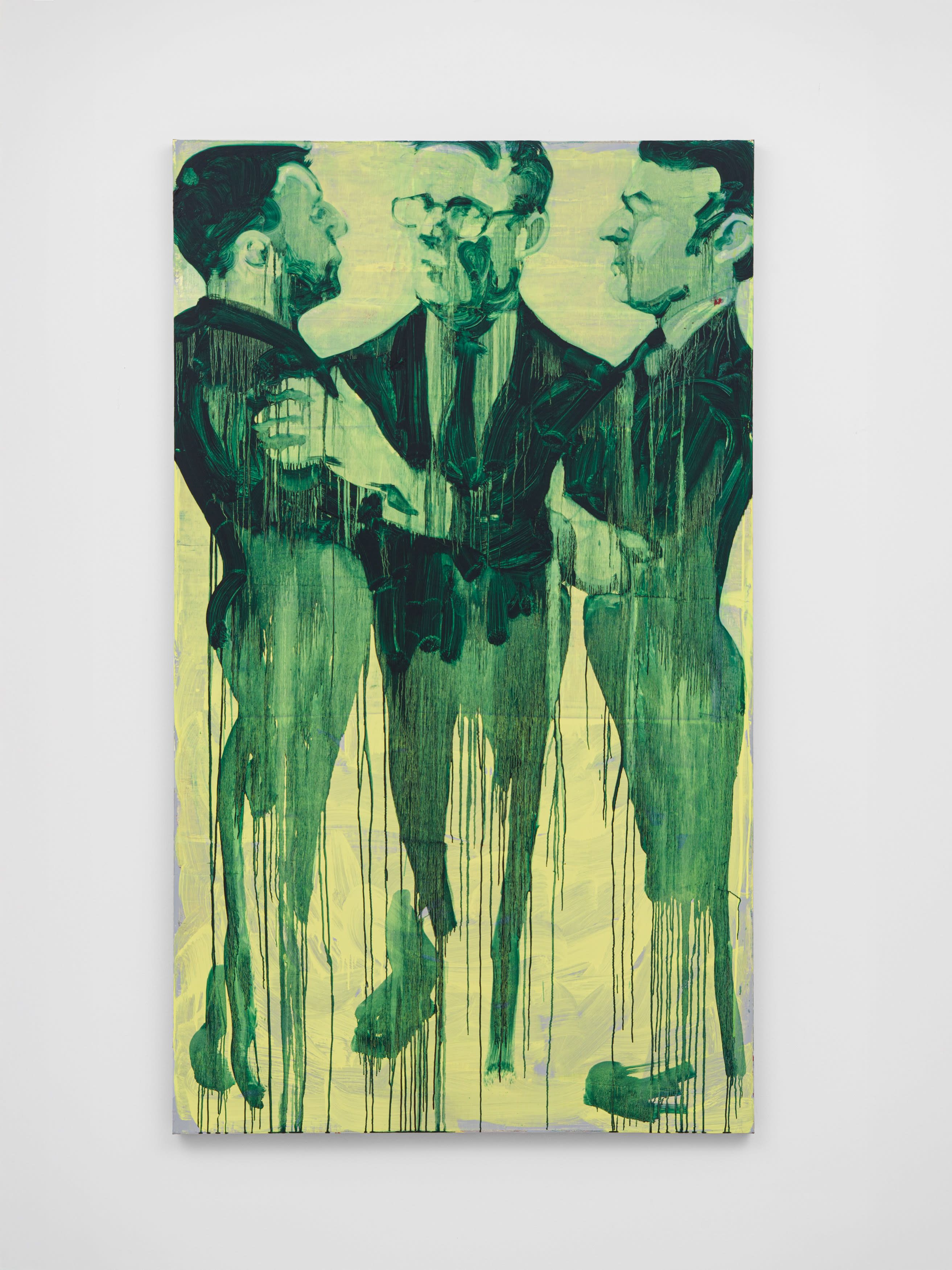 Here, Foxton approaches color through a positive-negative dynamic, concentrating its effects to arrest our gaze on these bodies that confront us as a solid mass. This limited color palette mirrors that of contemporary Western male attire, itself largely derived from military uniforms and the strict ‘‘black suit’’ of the 19th century.
