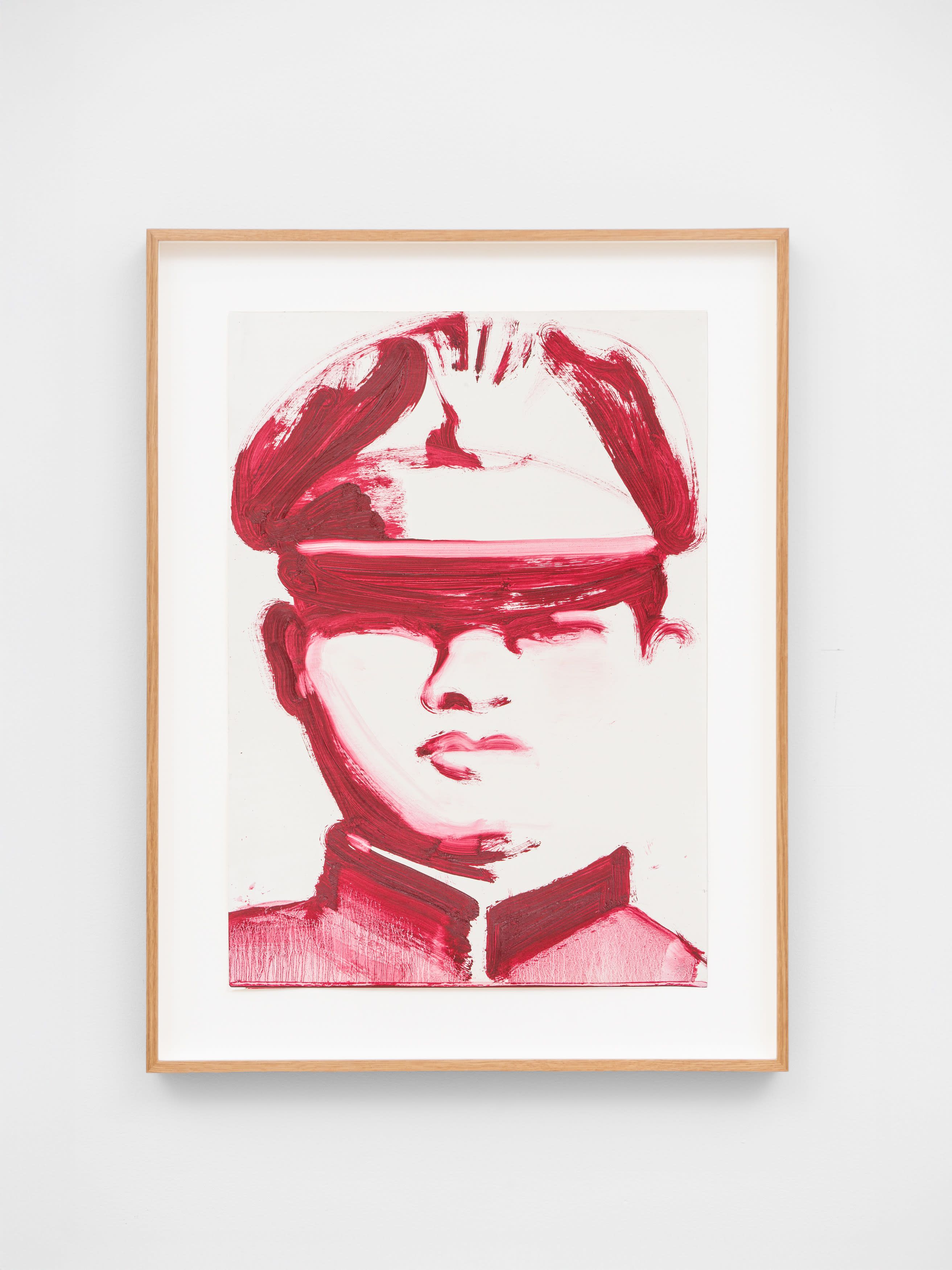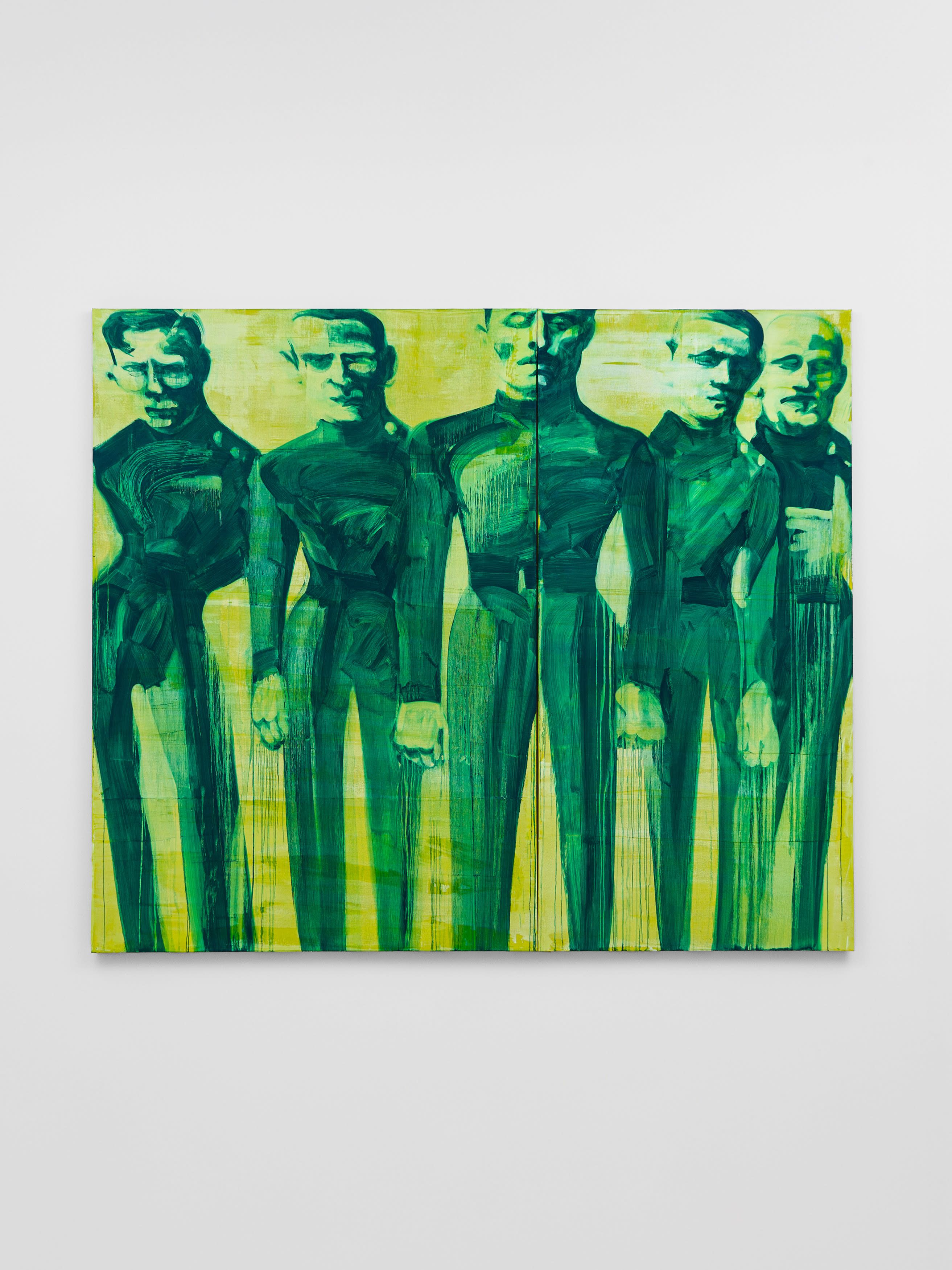 Foxton’s new body of work tackles masculinity at a time when it is being overperformed and reduced to its most classical and rigid codes. Young, controlled bodies with strict demeanors confront us in large group compositions, while portraits of authority figures follow us with their cold gaze. While the artist continues to place primary importance on the physical body, he now approaches it more in relation to the group—to the way it is shaped by various social and political influences.