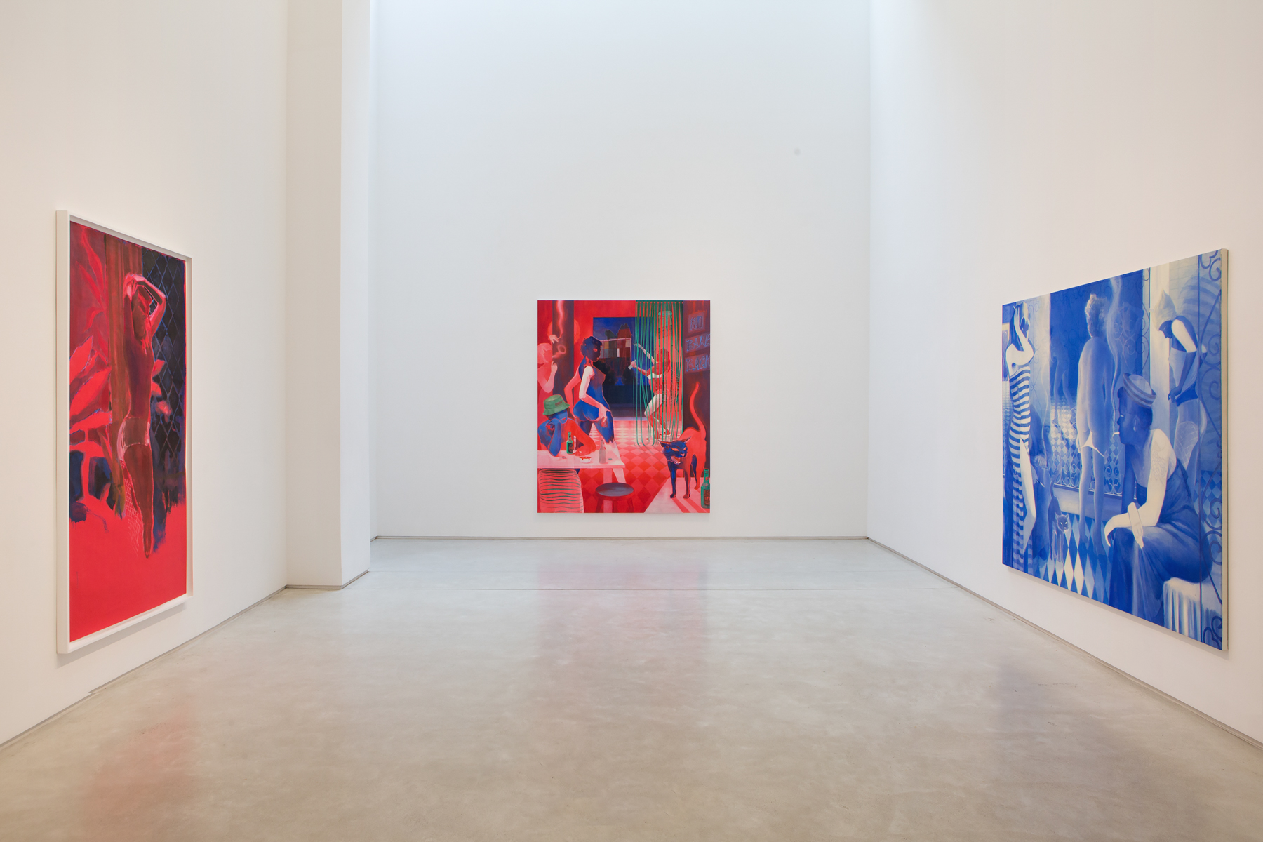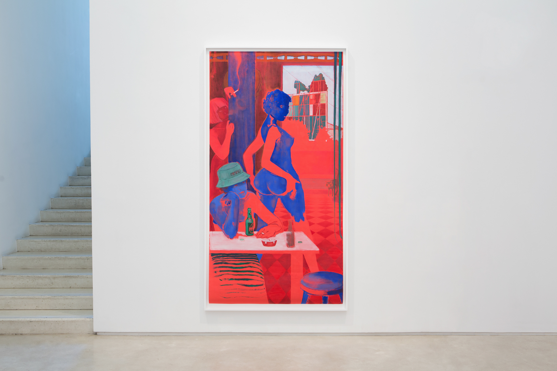 The present body of work expands the artist’s recent use of a near single color palette to include, in particular, a rich red. In the title image Boundary Girl (Natalie), painted between 2009-2017, a woman is captured in a private moment, hands clasped over her head. Her body is set off by the fronds of a large plant behind her. The painting’s title—and its color—derives from the red plant, a common variety used to mark land borders in Trinidad. The painting was composed using multiple references to create a subtle pentimento effect; combining a 1968 Playboy magazine spread with her own snapshot of a woman in white hot pants and orange fishnets taken at a street party. The pose is based on the sassy and defiant attitude of a friend, Natalie, to whom the painting is dedicated. With a personal interest in the way people carry themselves, this work refers to a boundaried code of social conduct that Brice identifies as particular to person and place.