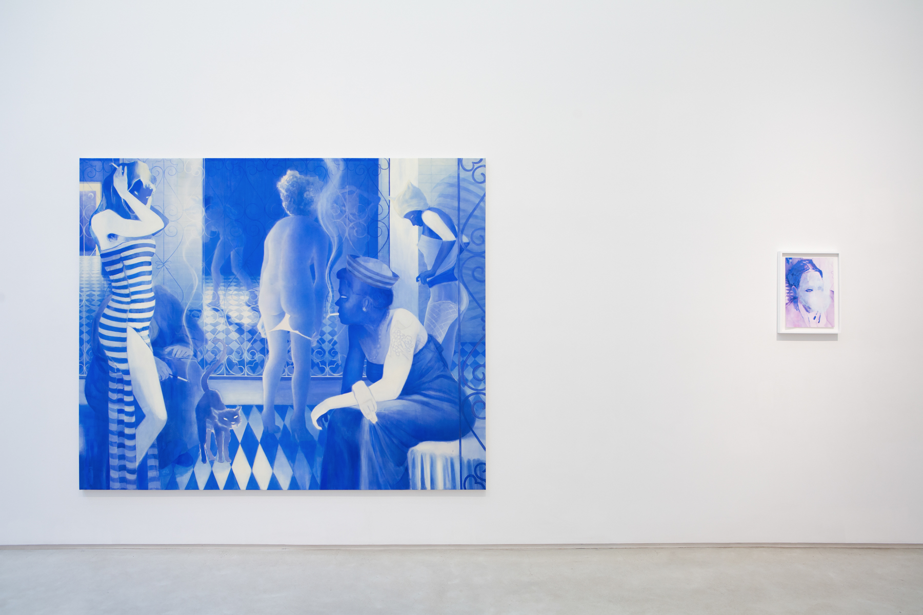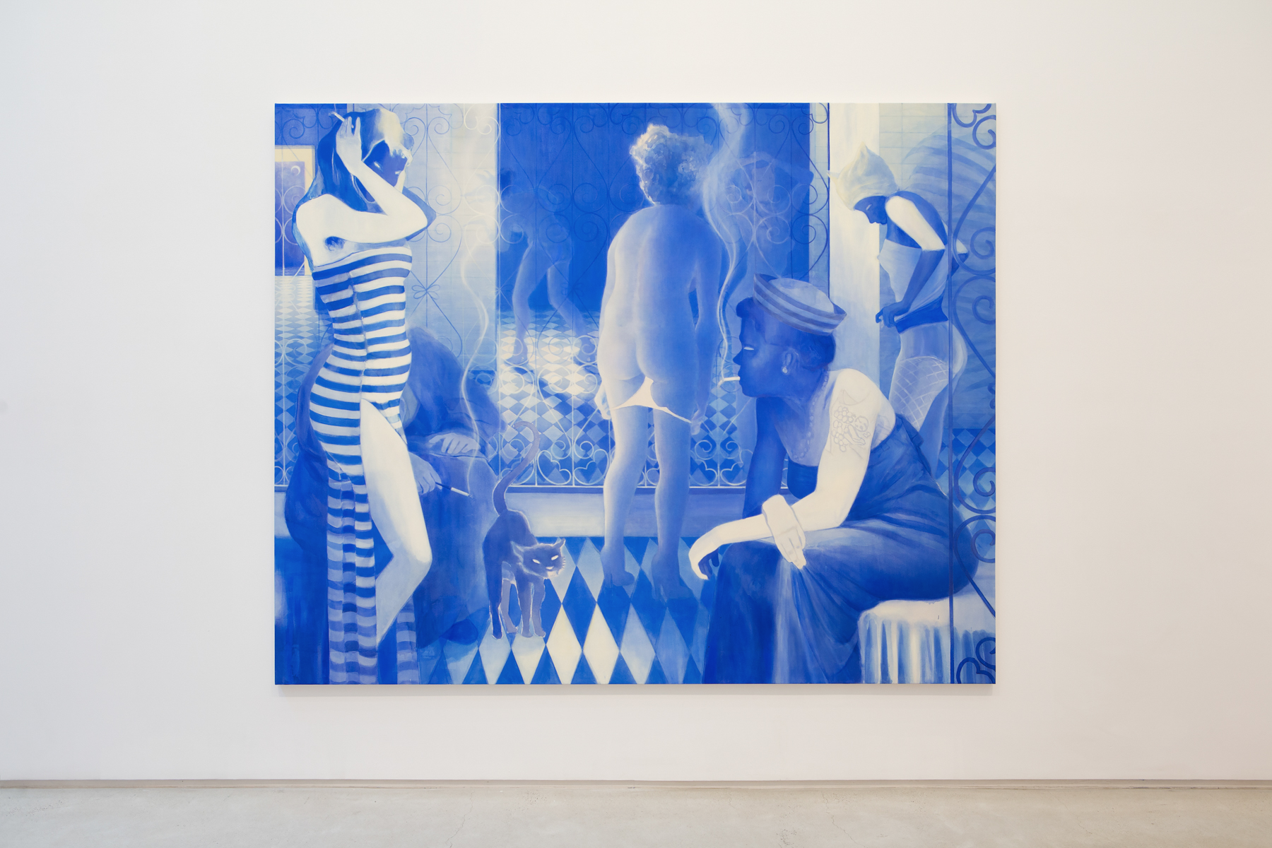Between This And That (2017) is a remarkable work in cobalt blue, a favorite color used to denote the transitional state of twilight. Here Brice’s penchant for art historical—and local—pentimento is at its peak. For Brice the blue signifies the transient moment between day and night, and recalls the color of the Blue Devil, a formidable Trinidadian carnival character traditionally played by men covered in blue body paint. The seated woman in a cap, smoking, is taken directly from Felix Vallotton’s La Blanche et La Noir (1913)—itself yet another homage to Manet’s Olympia. Brice has replaced Vallotton’s head scarf with the more timeless sailor’s cap, and the faint tattoo on her arm is all that remains of an underpainting, the famous Les Demoiselles D’Avignon (1907). Placed in conversation with her on the left, a second homage to Picasso, his Gertrude Stein, peeks through, mostly obscured. Only her hands are visible, one of which Brice has embellished with a cigarette holder. At her feet is the familiar black cat who parades in and out of the pictures. Glimpsed through a filigreed window, a female figure mutates into a fox, a reference to Tsukioka Yoshitoshi’s woodblock print The Fox-Woman Kuzunoha Leaving Her Child (1890). The woman to the right of the window sports a hat with pussycat ears, per the recent political protests. In the center, Brice’s piece de resistance: the not-quite-nude female, completely comfortable in her own skin, not presenting her body so much as inhabiting it.