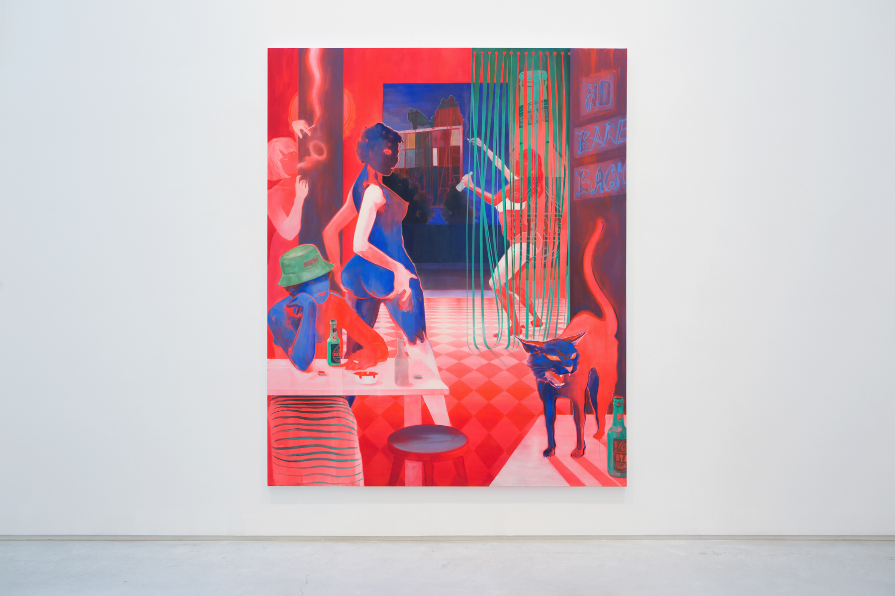 No Bare Back, After Embah (2017) is set in a bar that she and Trinidadian artist, Embah (Emheyo Bahabba 1937- 2015) would frequent. The implied narrative is inspired by the conversations they shared. In a nod to Édouard Manet, Brice juxtaposes a seated figure in a hat, borrowed from the Impressionist’s 1877 painting The Plum, with a provocative standing figure derived from a photograph of the singer Nicki Minaj. Other elements include a bottle of Stag beer, the local “man’s beer,” and a hissing black cat, courtesy of Manet’s iconic Olympia (1863). There is also a reference to wall-painted signage common in Trinidadian bars, instructions intended for the male clientele: ‘No Idling’, ‘No Spitting’, ‘No Cussing’ and as featured, ‘No Bare Back’, forbidding shirtless attire. No Bare Back, After Embah (2017) evolved from two separate stand-alone paintings, Midday Drinking Den, After Embah I and II (2017). When combined into the single larger work, the halves become a powerful whole, its women advertising or celebrating their sexuality, thus both conforming to and defying stereotypes. Their combined gaze to the right suggests a conversation or confrontation of sorts with a ‘presence’ just out of frame.
