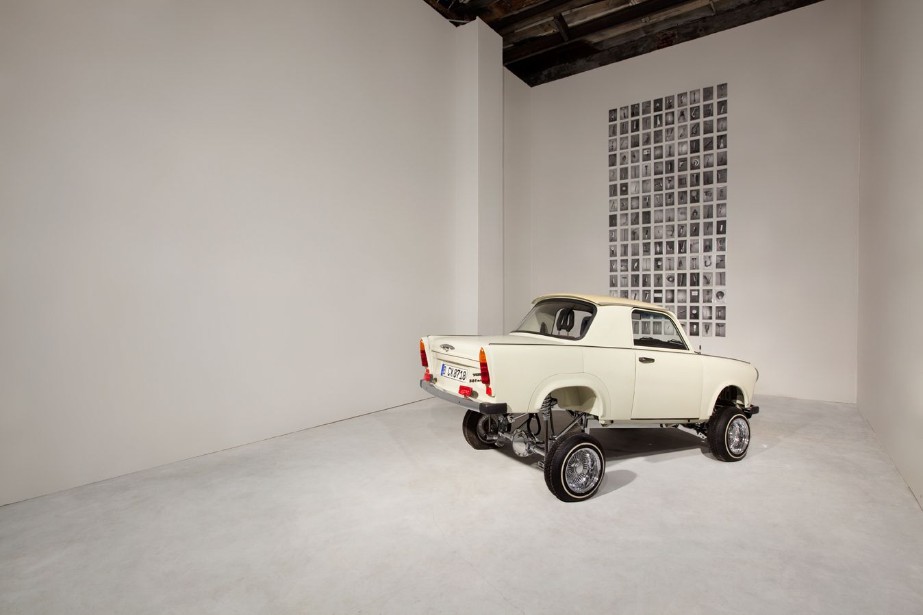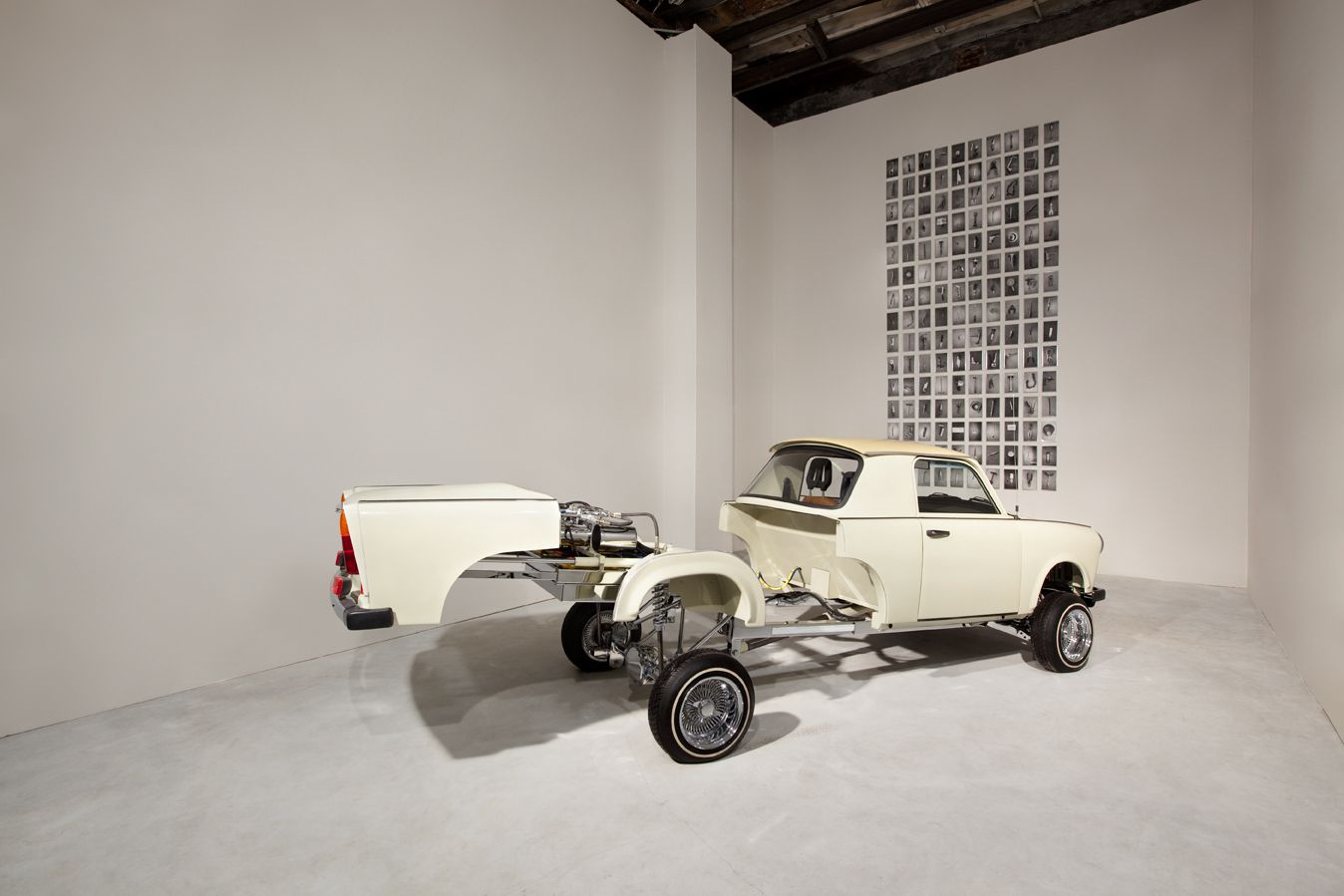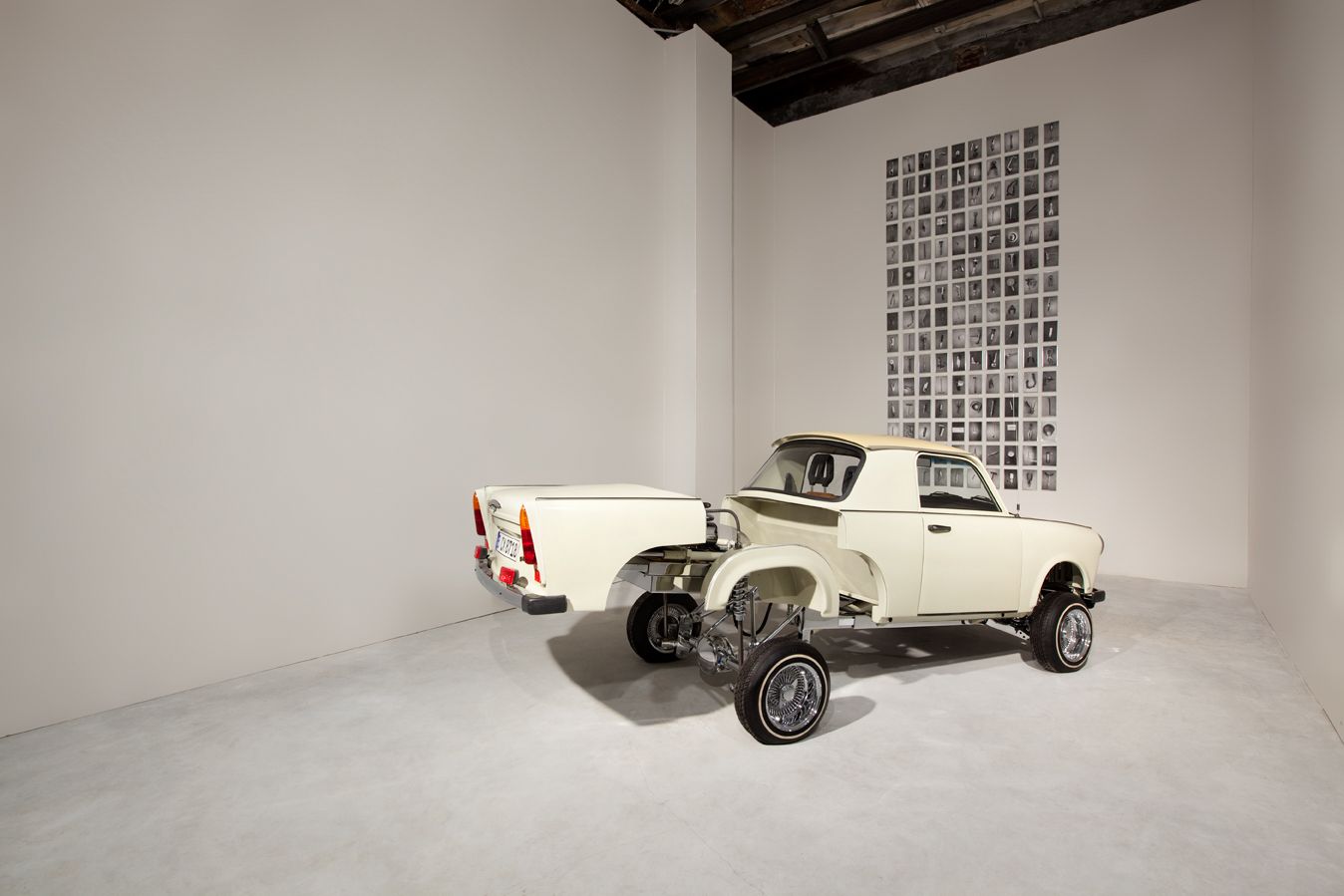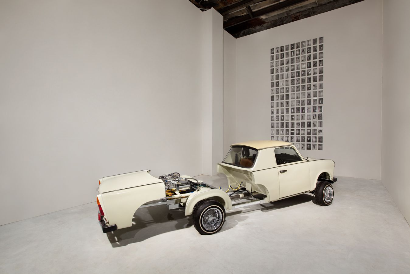 Salon 94 Bowery is pleased to open our renovated doors with an exhibition of Detroit-based artist Liz Cohen. Trabantimino, takes center stage after eight years of body work and an unlikely journey from the former East Germany to Oakland, Scottsdale, and Detroit. Trabantimino is a hybridized car and kinetic sculpture that combines a former East German Trabant with a Chevrolet El Camino.