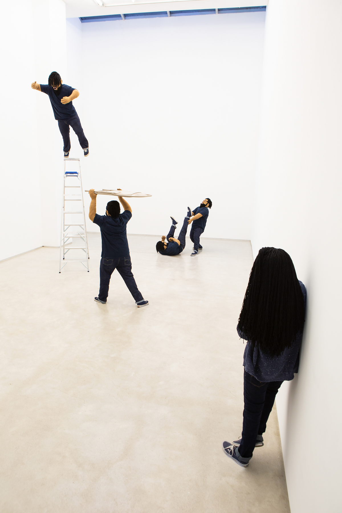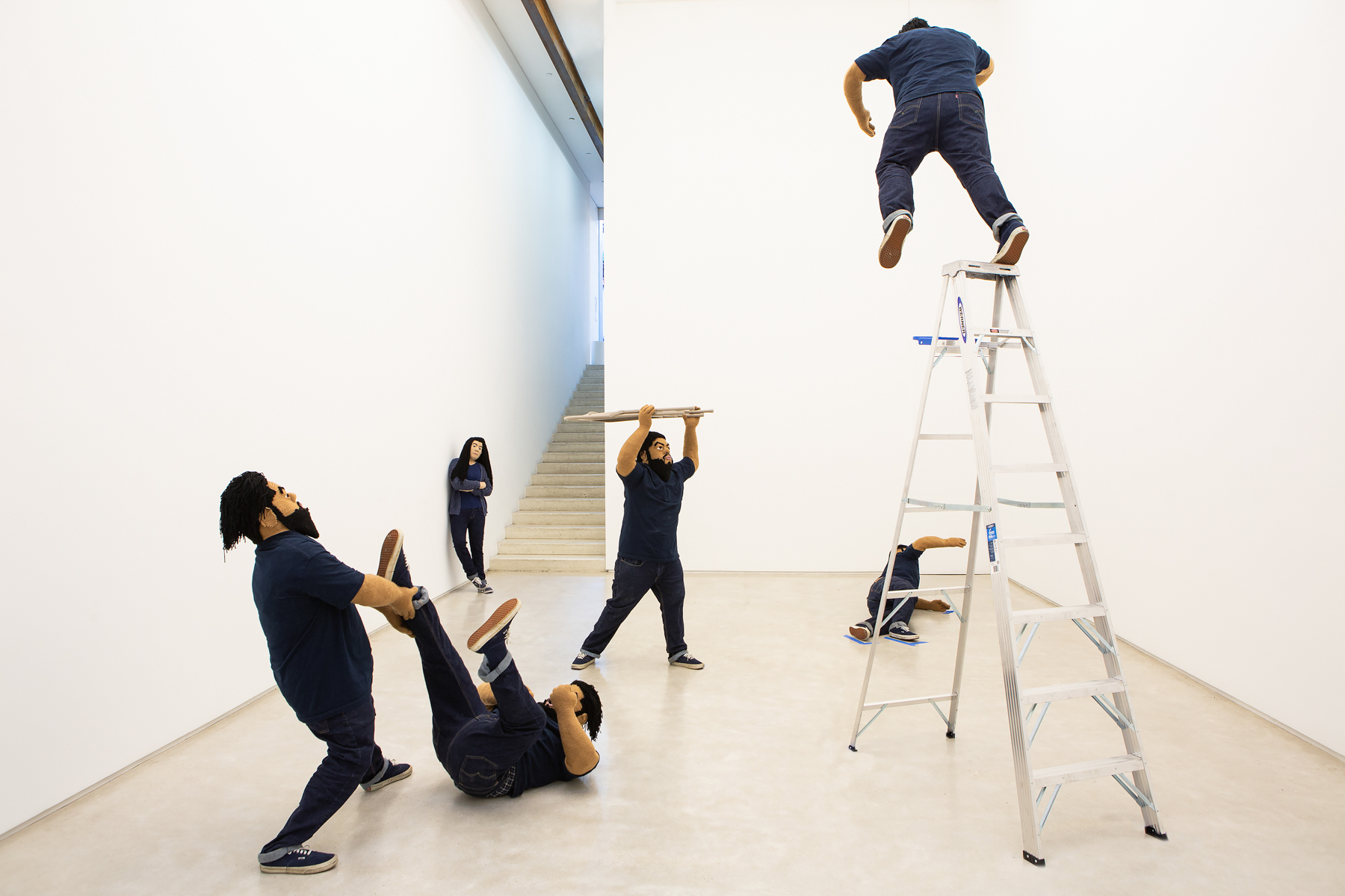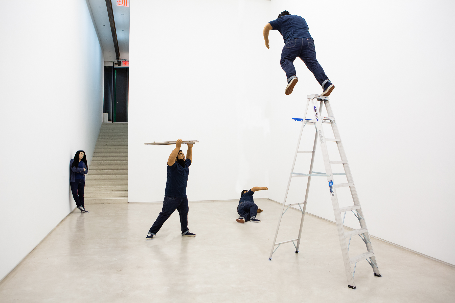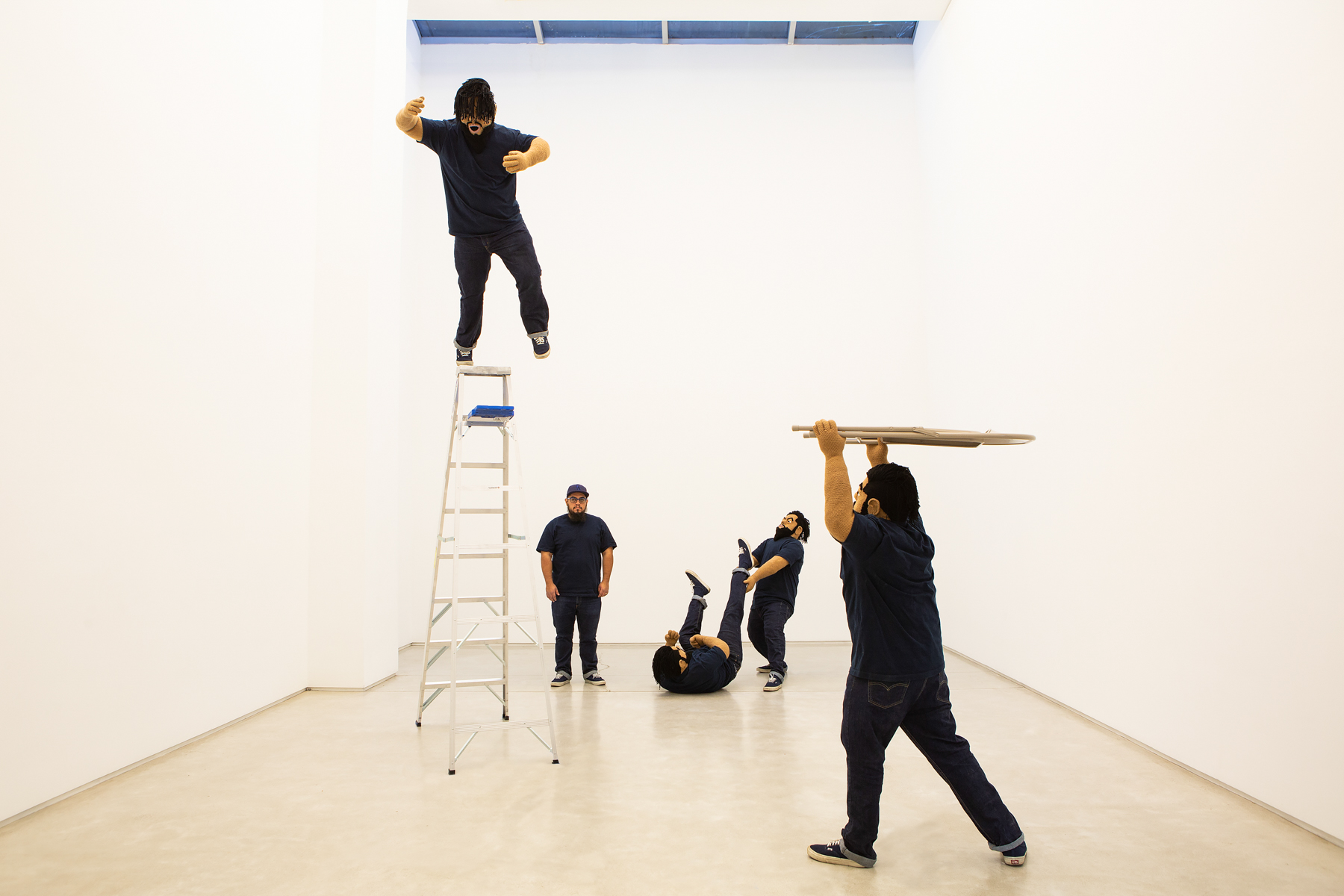 Standing high on a ladder, balanced mid-air, or violently being slammed to the floor, several of Luis Flores's soft self-portrait sculptures fill the gallery.