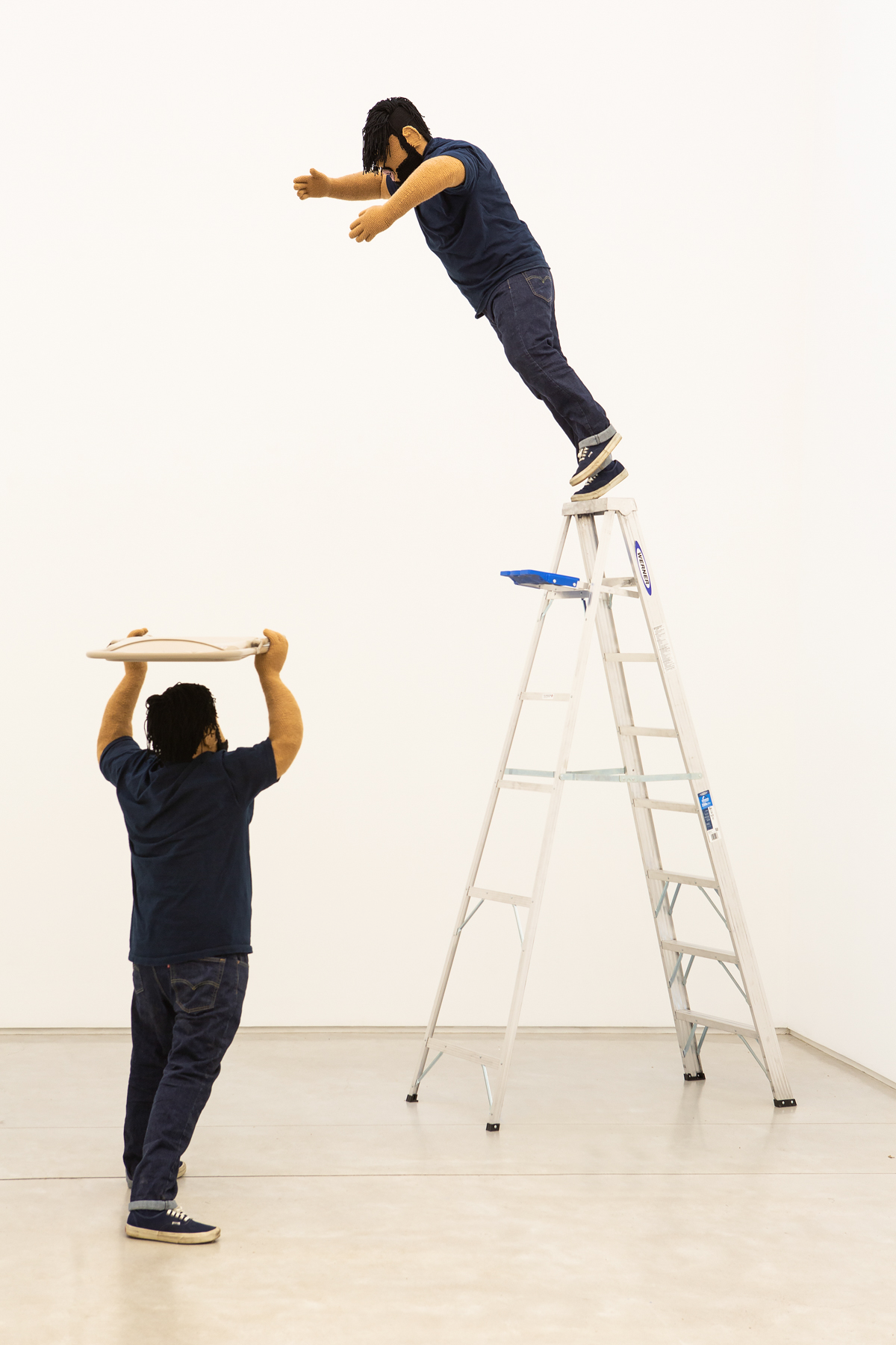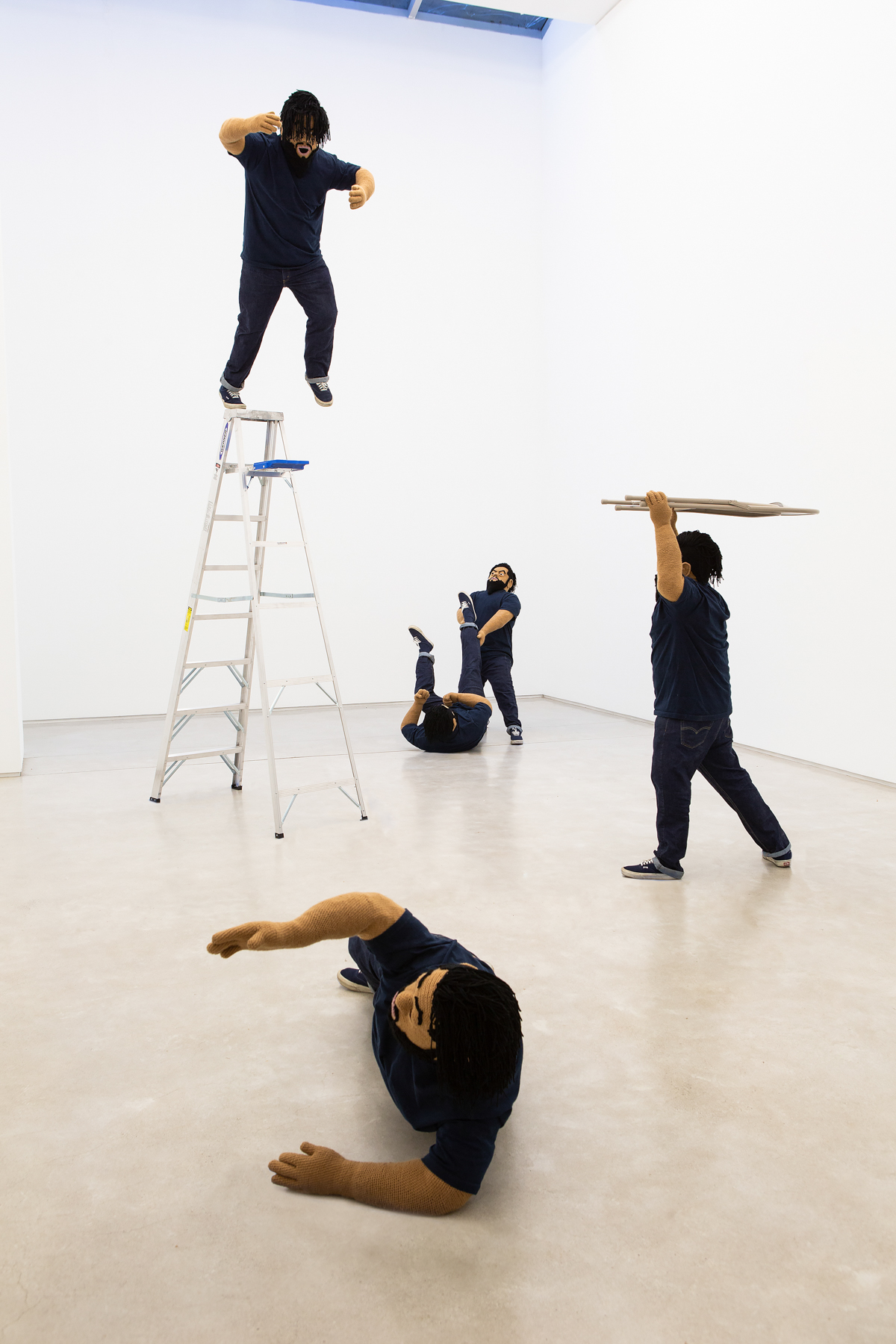 Flores is recognized for his hand-crocheted, life-sized “doppelgangers.” Standing high on a ladder, balanced mid-air, or violently being slammed to the floor, several of his soft self-portrait sculptures will fill the gallery this spring.