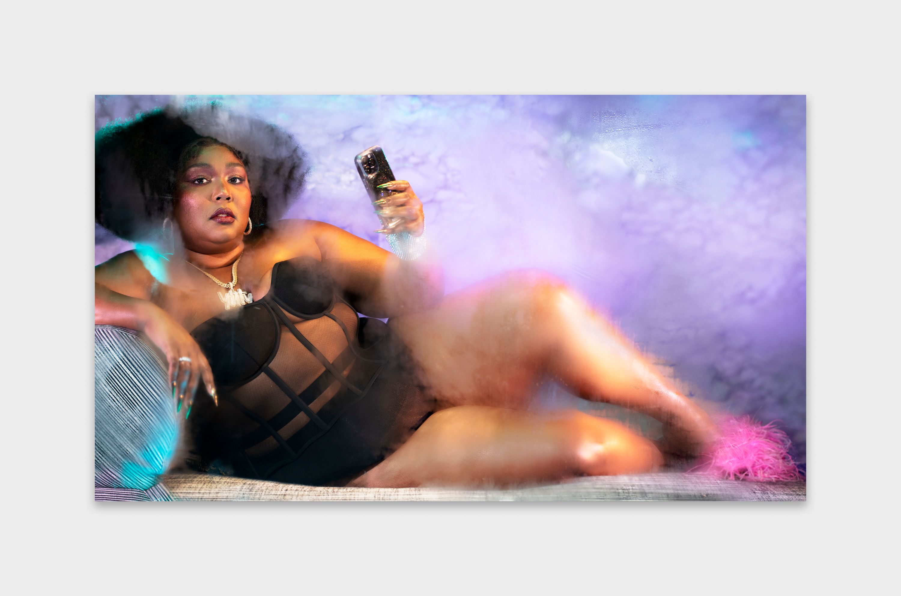 Similarly subversive is Minter’s new series Odalisques. Confronting the tropes of Orientalism and the troves of paintings by established old masters such as Ingres, Renoir, and Matisse, among others—Minter presents a contemporary vision of the reclining nude which undercuts and reorients the age-old tradition. In Lizzo Odalisque (2023), the musician wears a bustier and holds her cellphone, suggesting a moment of personal repose interrupted by the viewer—while in Jasmine Odalisque (2021–23), the curator Jasmine Wahi is pictured nude and in heels, making a call. Minter recasts these supine women as powerful and contemporary, reflecting their influence and authority, as they confront the viewer and the history of the genre.