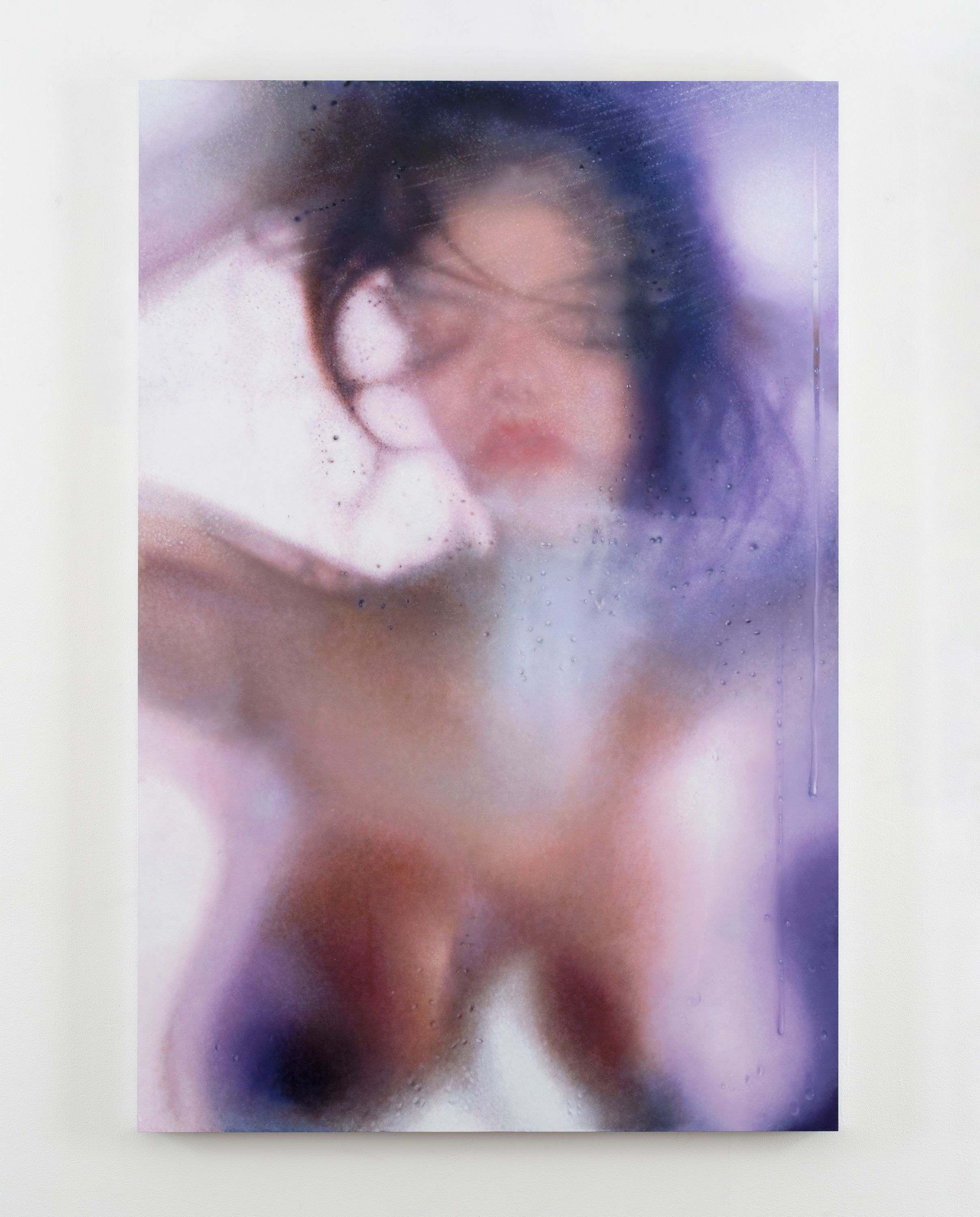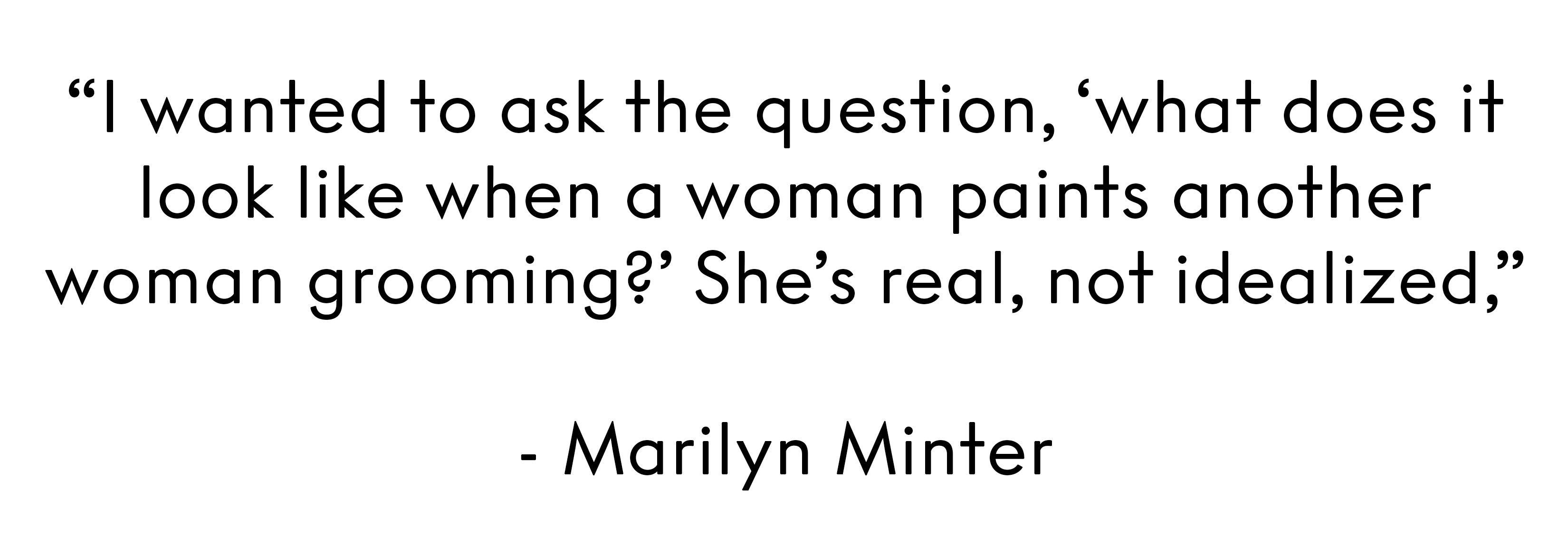 Also featured in the exhibition are her Bather paintings, which Minter considers the catalyst for the Odalisques. Initiated in 2014, the Bathers depict female subjects in the shower from a woman’s perspective. As Minter explains, “Historically, it has been difficult to find images of naked women, painted by women. The Classicists, the Mannerists, and the Expressionists really loved portraying women bathing or grooming, or goddesses caught in the nude. But I wanted to ask the question, ‘what does it look like when a woman paints another woman grooming?’ She’s real, not idealized.” Minter’s Bathers express their own agency, often pictured behind frosty or steamed panes of glass.