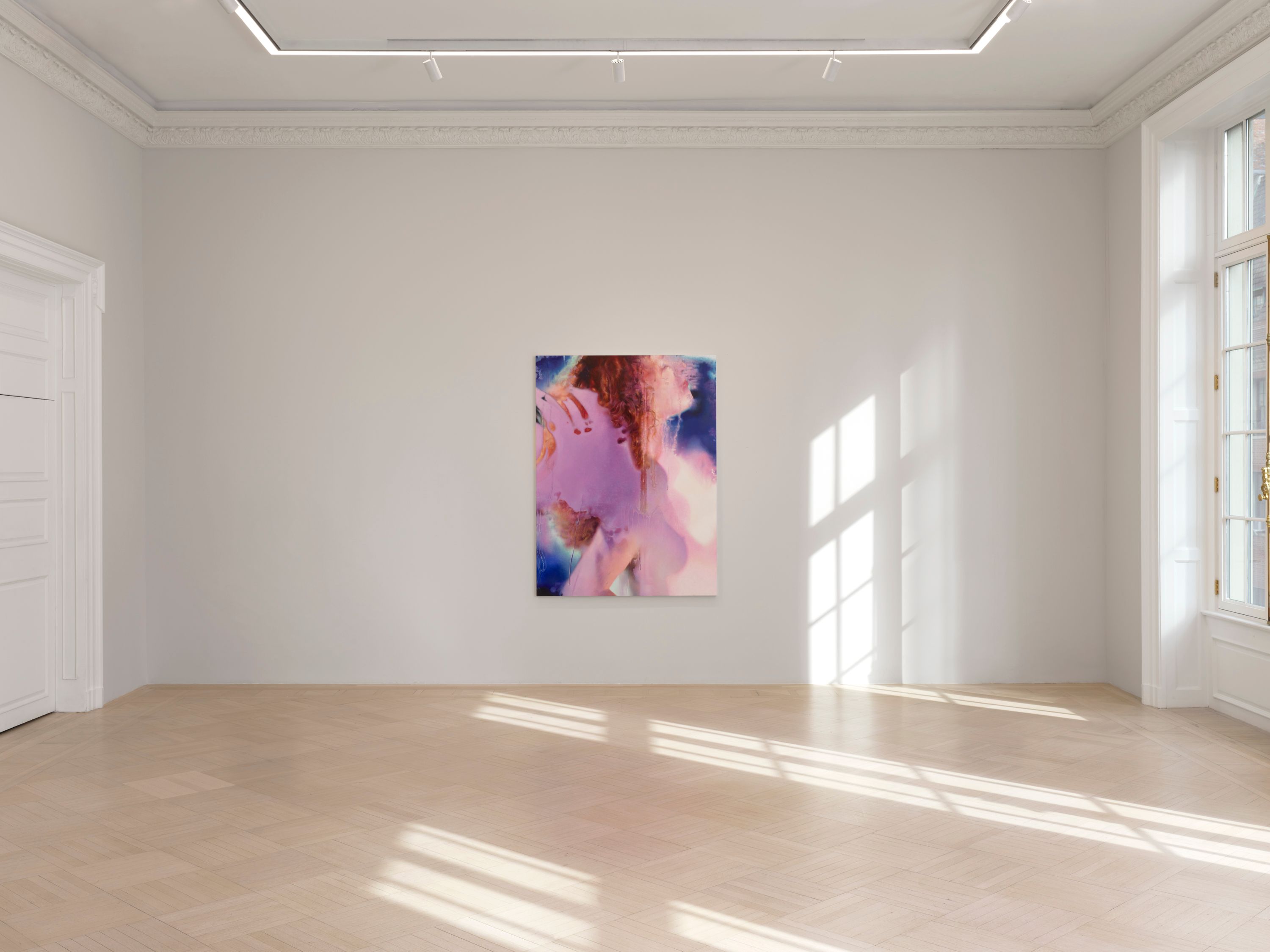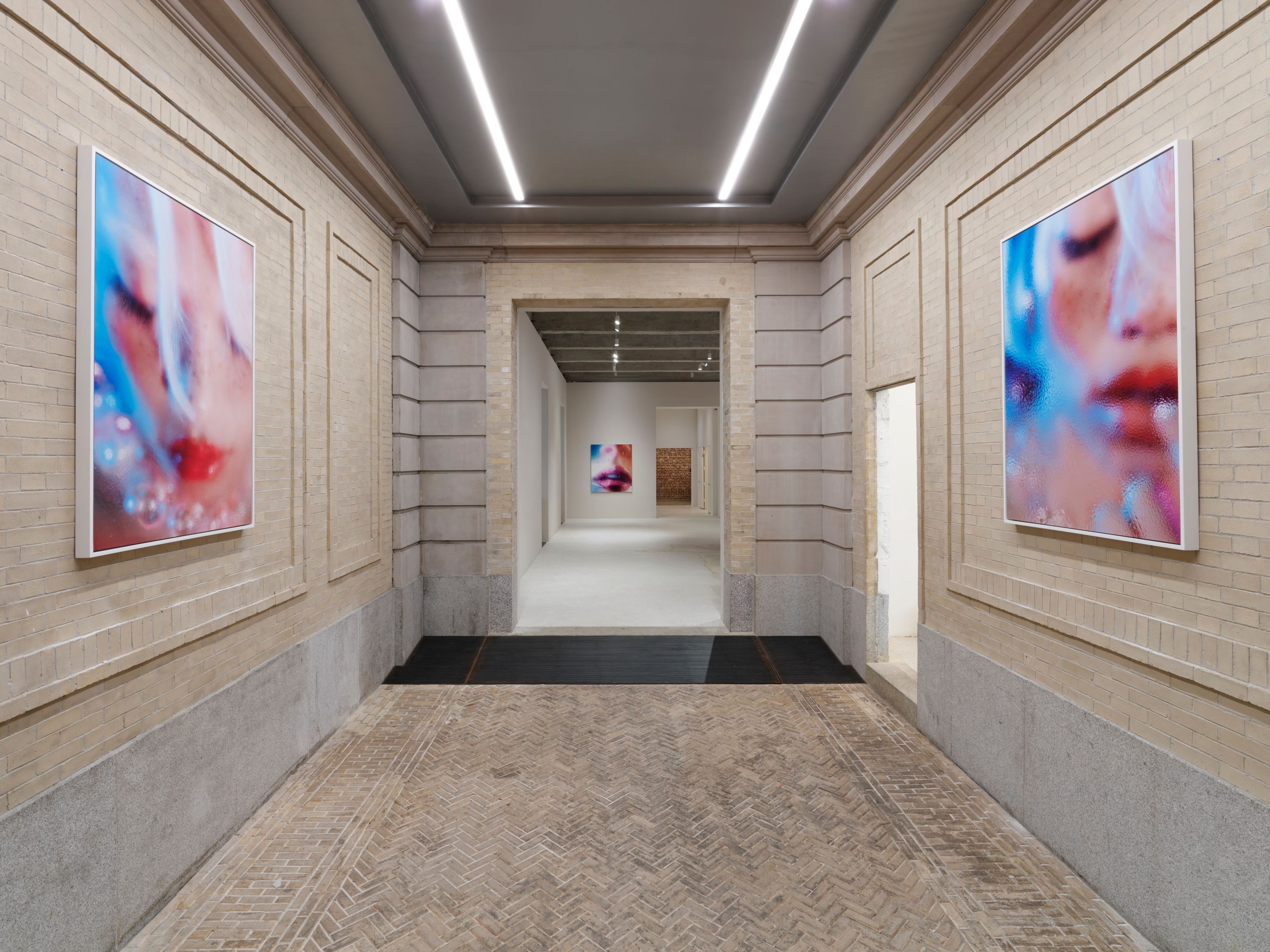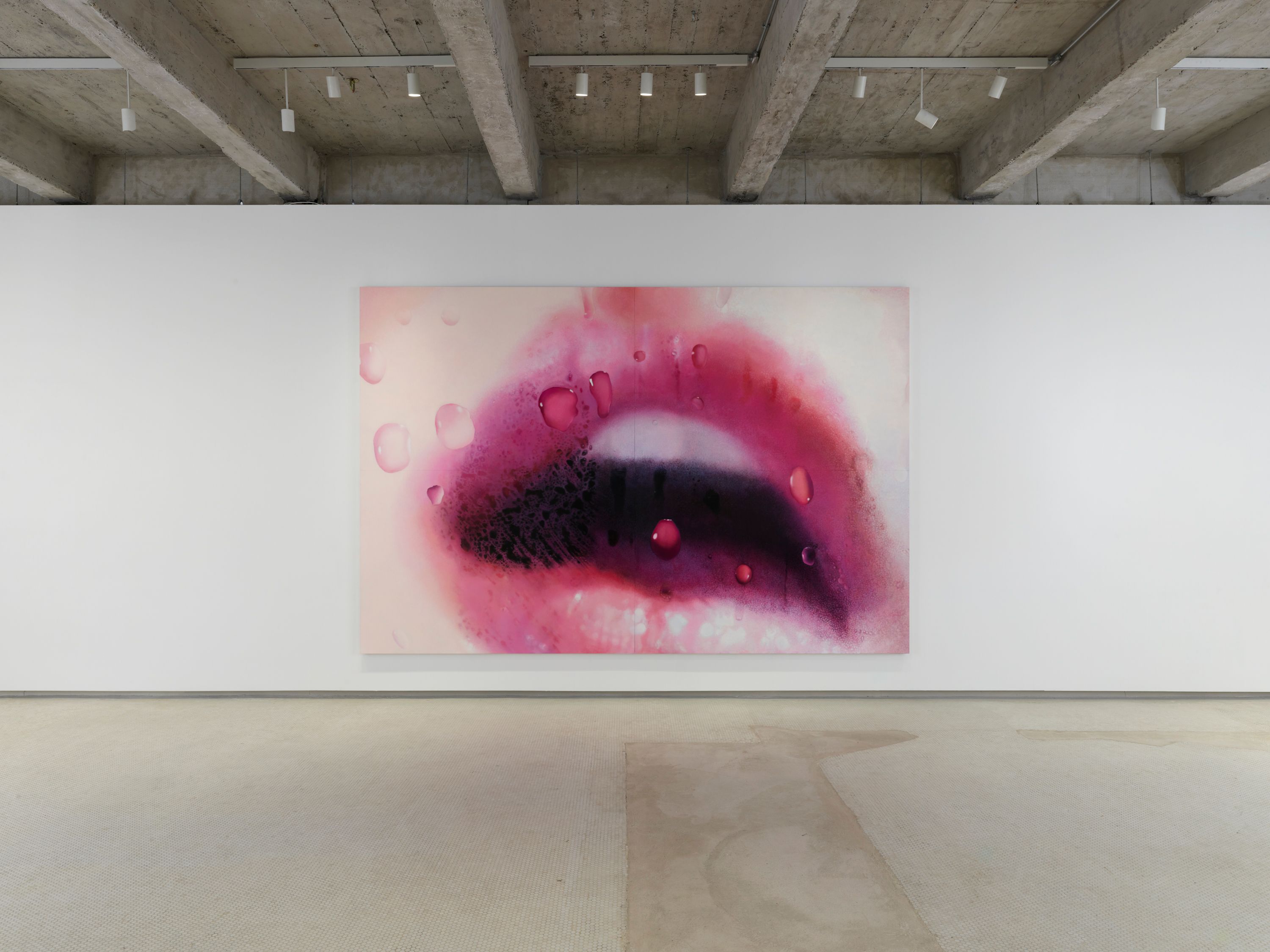 In addition to paintings and photographs, the exhibition features a series of new multimedia sculptures including Thirsty (Drinking Fountain) (2023). Custom-made from stainless steel, these drinking fountains house Minter’s recent video Thirsty (2022) in their cloudlike resin basins where closely cropped lips and tongues manipulate glitter and pearls along with spit, hair, and grime. This is Minter’s second sculpture to date following her 2017 custom-designed sculptural car made by retrofitting an AMC Pacer with surround-sound video of her now iconic Green Pink Caviar (2009). Like its predecessor, Thirsty (Drinking Fountain) marries functionality with design to create a sculpture that is operational, interactive, and otherworldly. Surrounding these sculptures will be works that elaborate on the themes suggested in Thirsty, including the monumental painting Word of Mouth (2020–22) and a new silkscreen print Hush (2023).