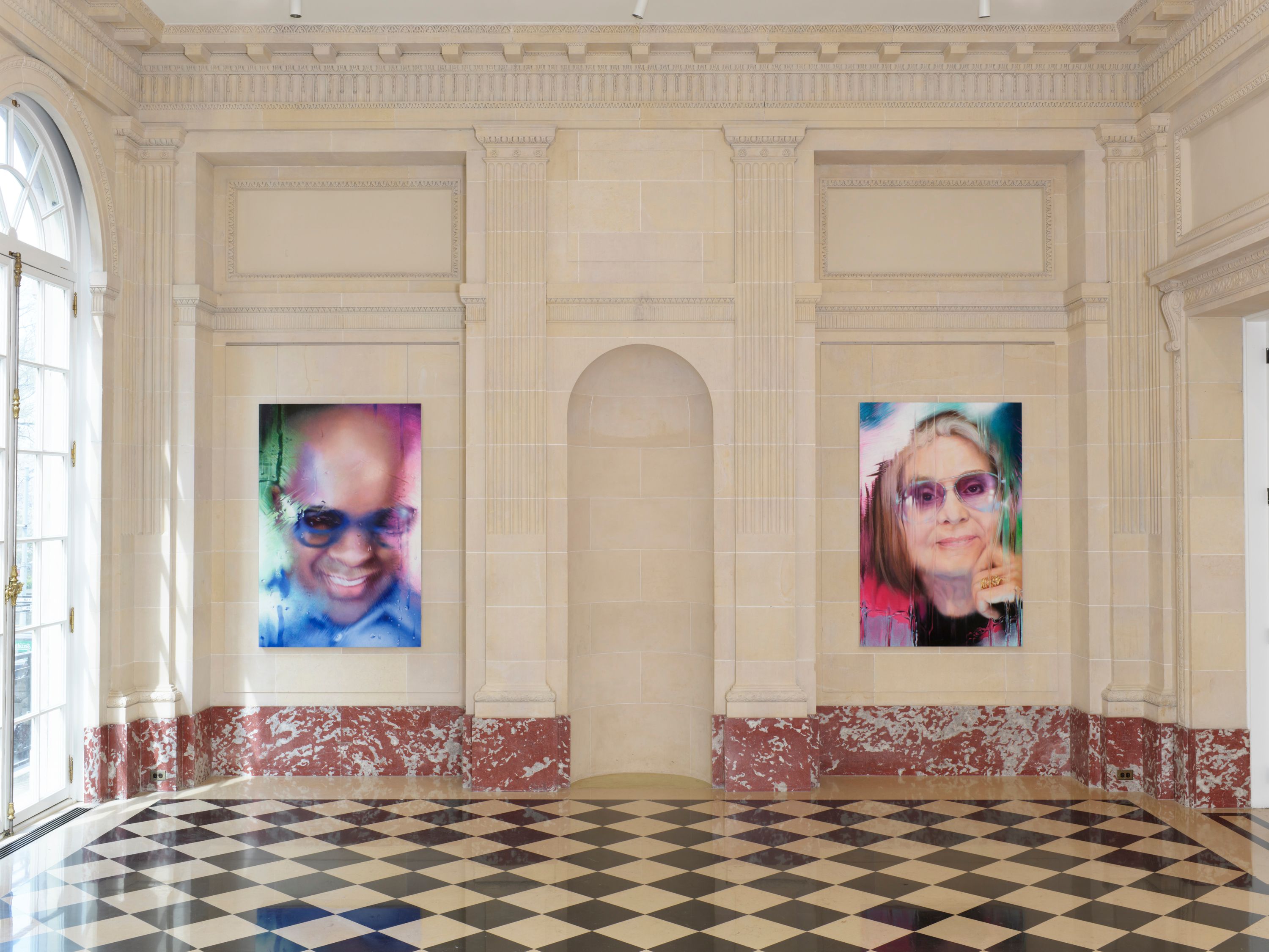 Similarly subversive is Minter’s new series Odalisques. Confronting the tropes of Orientalism and the troves of paintings by established old masters such as Ingres, Renoir, and Matisse, among others—Minter presents a contemporary vision of the reclining nude which undercuts and reorients the age-old tradition. In Lizzo Odalisque (2023), the musician wears a bustier and holds her cellphone, suggesting a moment of personal repose interrupted by the viewer—while in Jasmine Odalisque (2021–23), the curator Jasmine Wahi is pictured nude and in heels, making a call. Minter recasts these supine women as powerful and contemporary, reflecting their influence and authority, as they confront the viewer and the history of the genre.