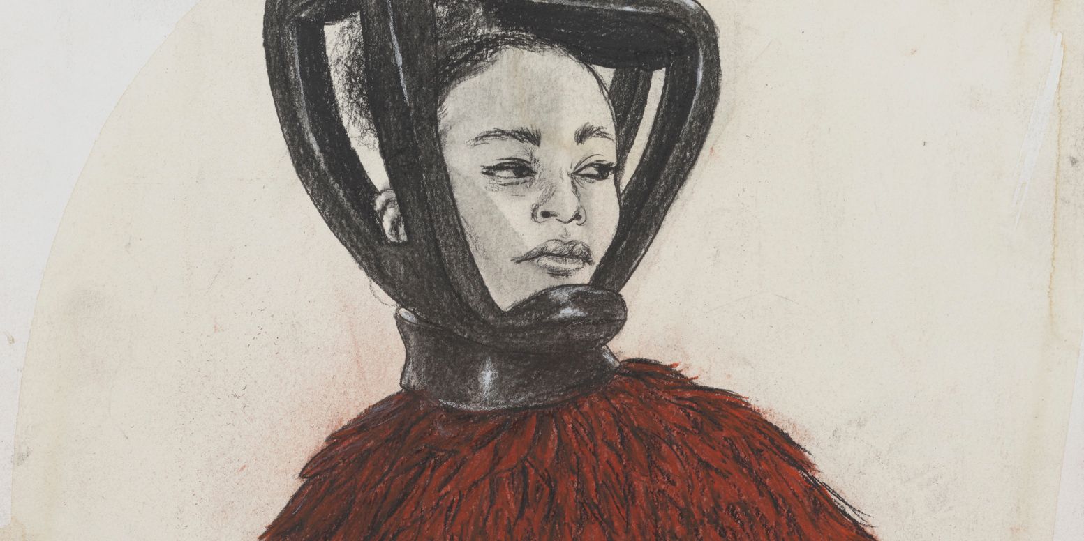 The exhibition’s two studies, Man with 4 eyes and Woman with ceramic headdress from TSU offer a glimpse into the artist's evolving visual language and conceptual explorations. While they incorporate familiar elements from Pruitt's oeuvre, such as masking and headdresses, these works push beyond established tropes. In Man with 4 eyes, Pruitt playfully exaggerates the common "third eye" motif, adding a fourth eye to create a striking and surreal portrait. Woman with ceramic headdress from TSU describes an undergraduate experience: