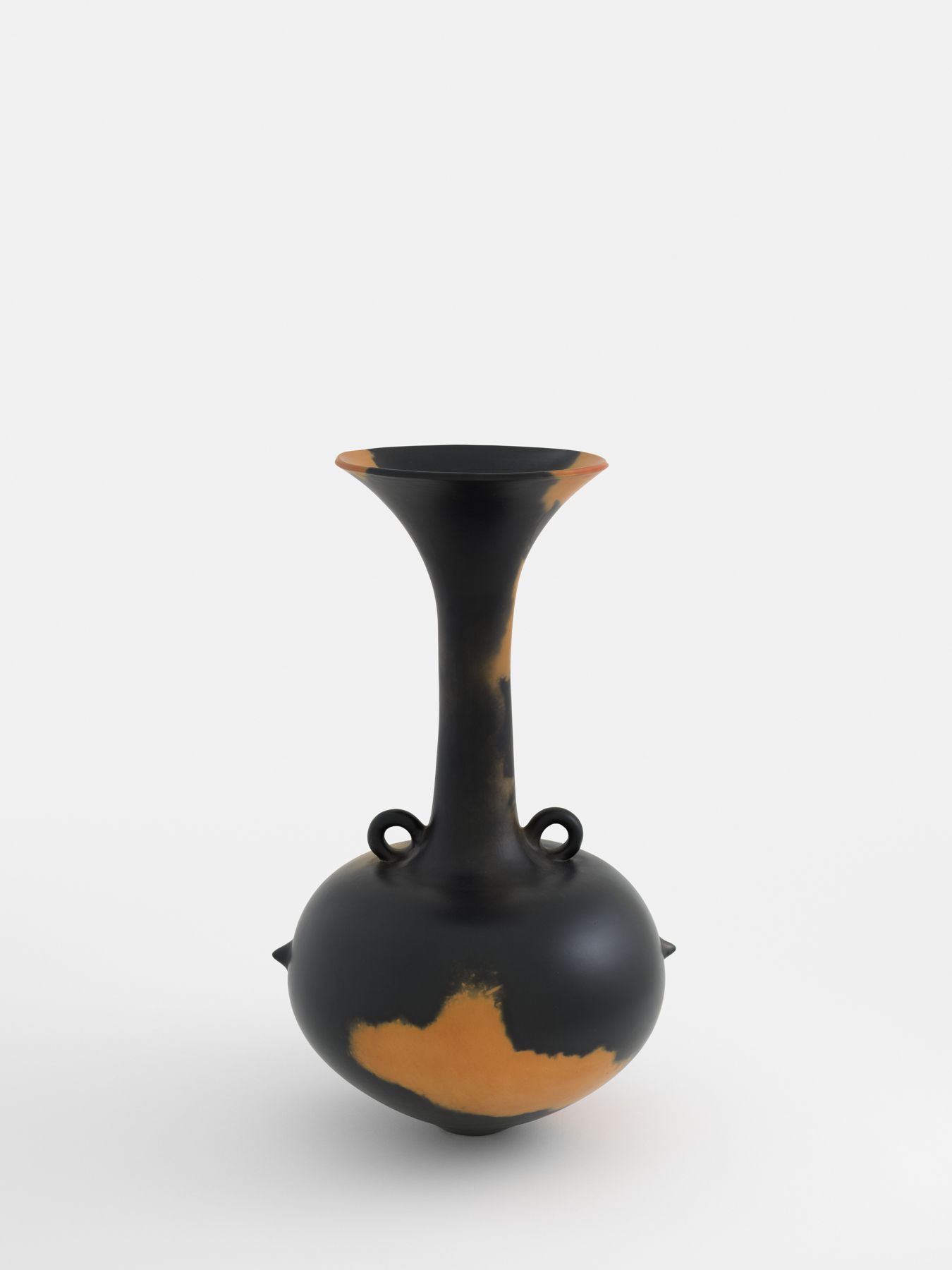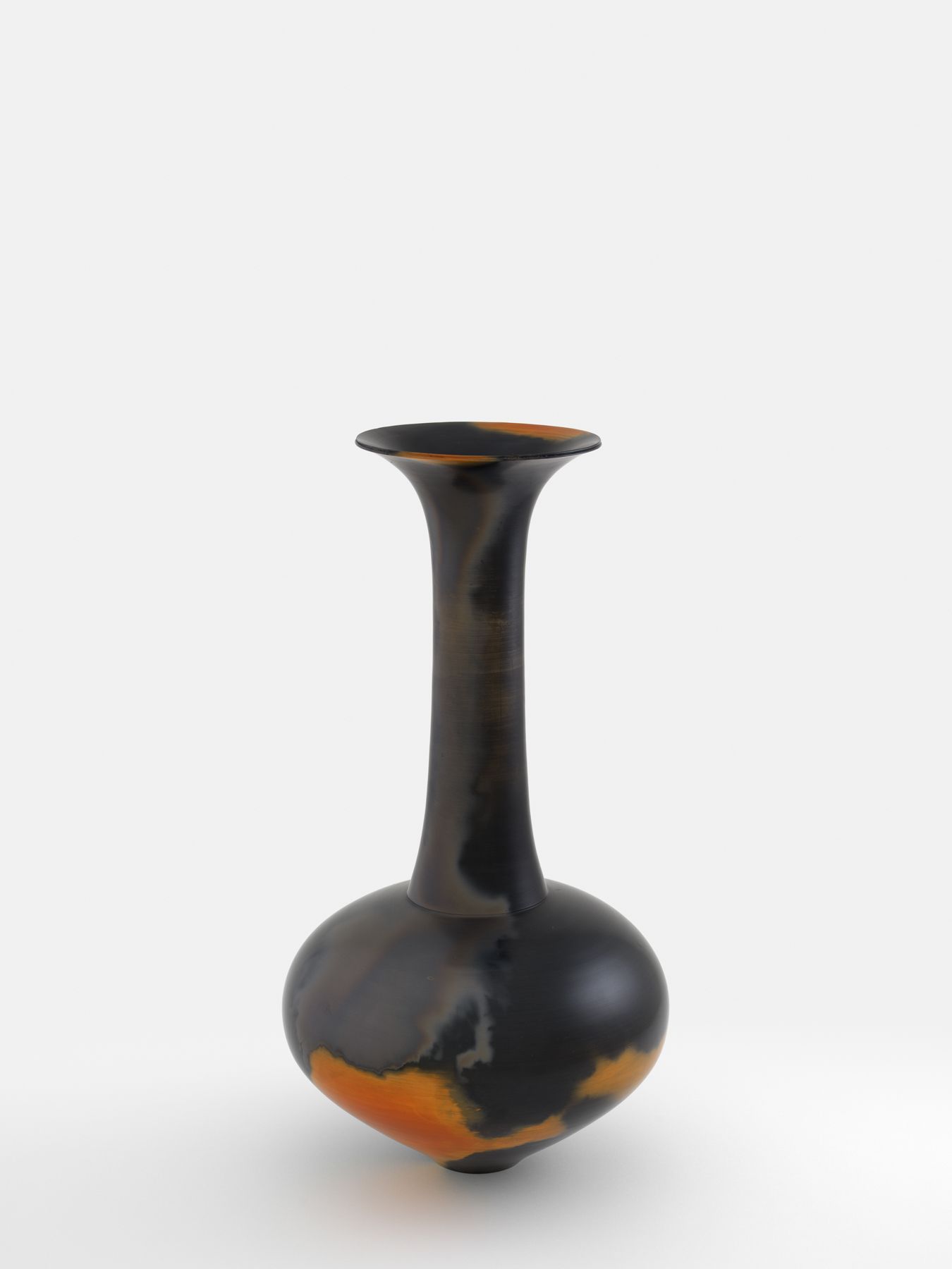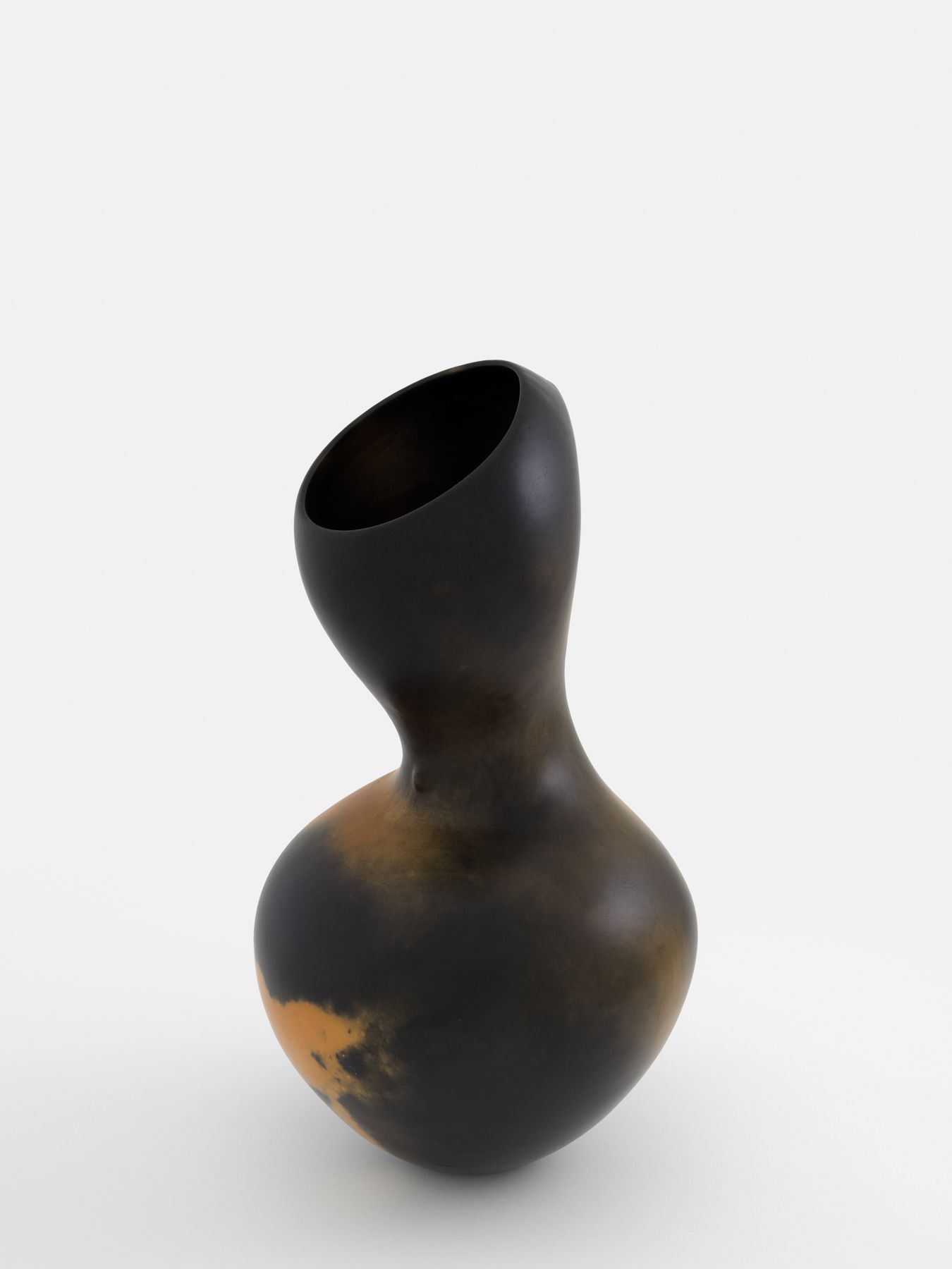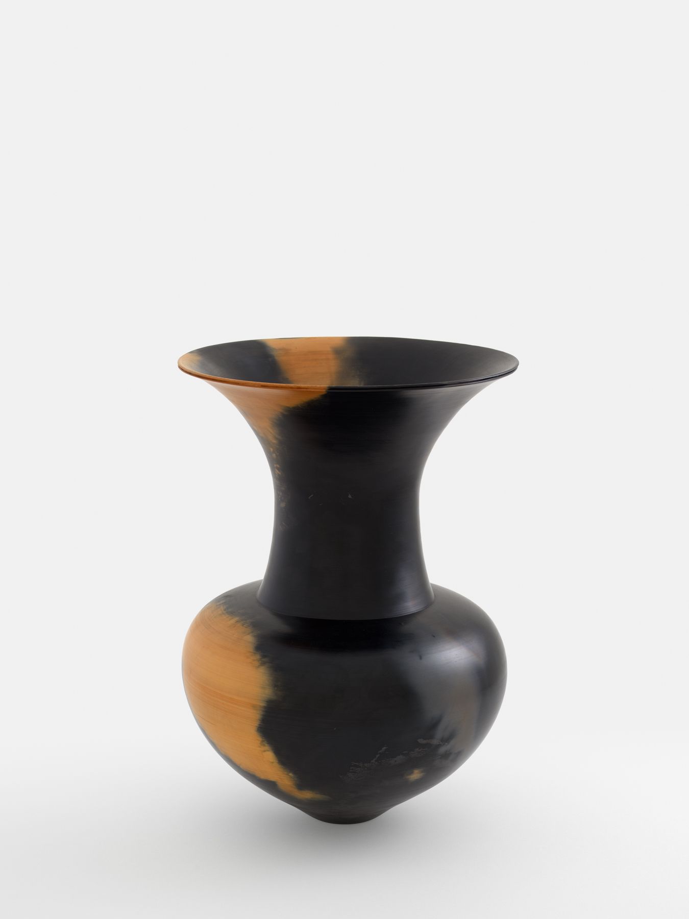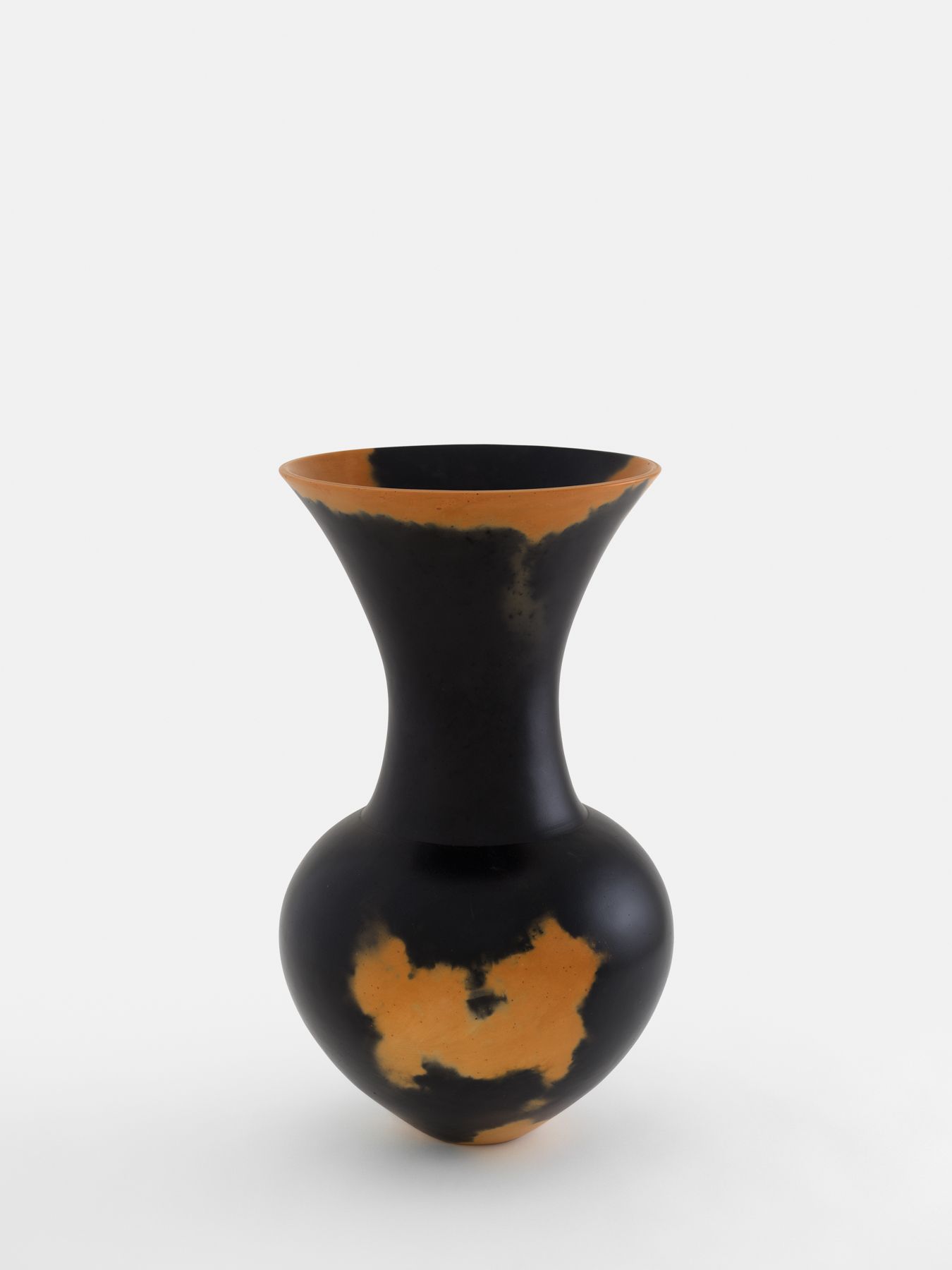 A constant traveler, student, and teacher, Odundo embraces practices from multiple civilizations and time periods: the ancient Greek and Roman technique of terra sigillata (adding a clay slip to the surface), for one; the burnishing of blackware in both Uganda, where she participated in ethnographic fieldwork, and with the work of women potters of Pueblo and San Ildefonso in Santa Fe, New Mexico. Odundo’s references range from Romanian master Constantin Brâncuși and the unglazed and hand-built pottery of the Nupe peoples of Nigeria, to Attic vases, Cycladic marble figures, the ruffs of Elizabethan dresses in sixteenth-century portraits, and the repose of a Degas dancer and beyond. In her words, “You work with clay fluidly and, once fired, it captures that particular gesture and arrests a stance.” In 2019, at The Hepworth Wakefield and Sainsbury Centre in Norwich, Odundo selected such objects spanning over 3,000 years to exhibit alongside some fifty of her vessels.