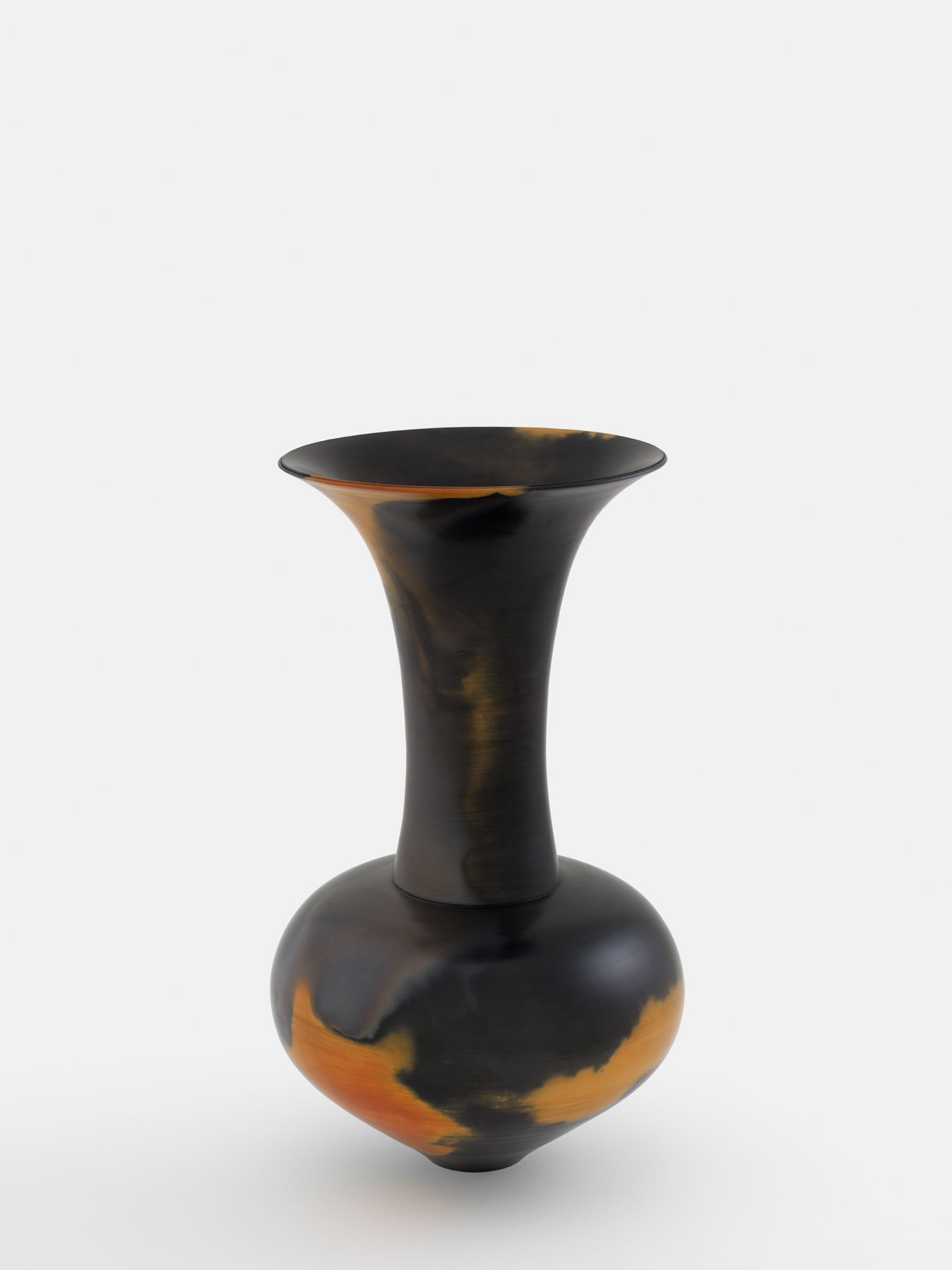 Once the clay is leather-hard, Odundo burnishes its surface with stones, polishing tools, and gourds to obtain a high-gloss finish. These instruments leave their own residue on the surfaces, or a careful cut around the lip. The first pots out of the kiln maintain her trademark orange and display deep, smoky, iridescent blacks that are more painterly in this year’s works than ever before. While the deep red-orange of the clay oxidizes in a single firing, the black effects occur through further reduction firings, wood-burning, and Odundo’s specific, nearly alchemical process, honed through years of ceramic experimentation.