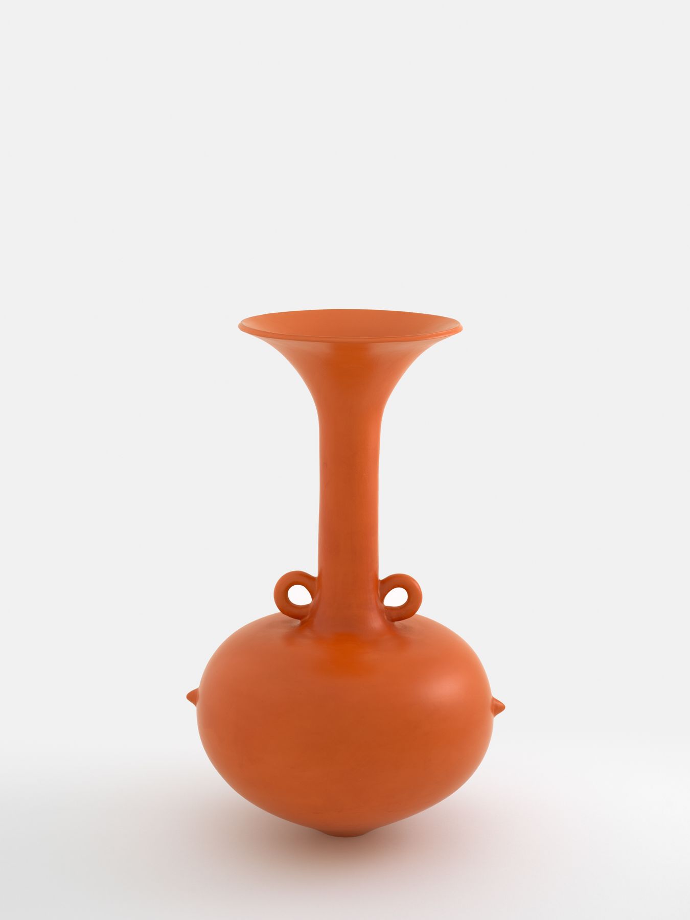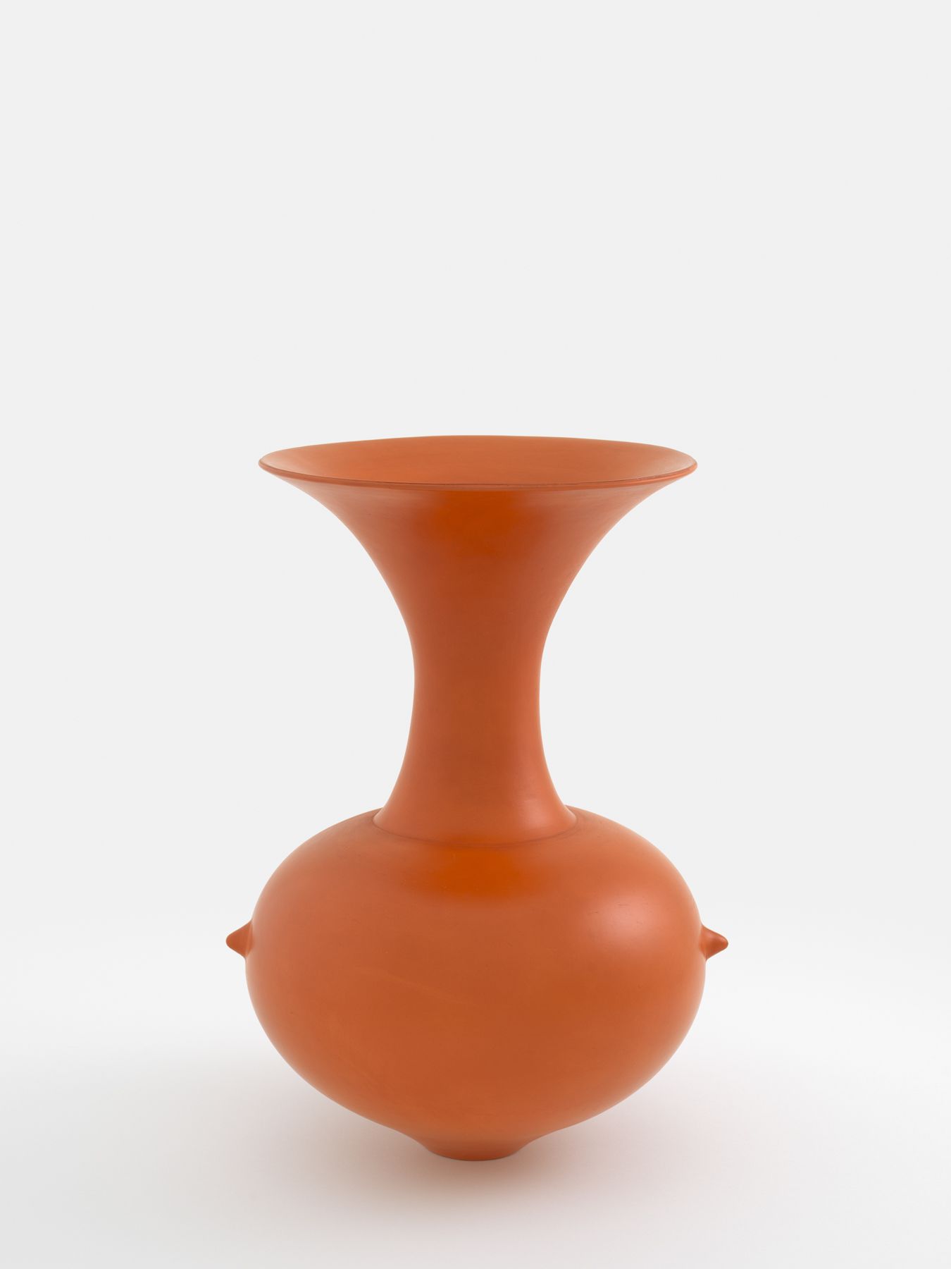 Odundo transcends the worlds of fine art and craft. Both putative vessels and abstract sculptures, her works are ceremonial and hint at the origins of function. Composed in elemental materials of English red clay and water, her seemingly effortless sculptures are months in the making. Odundo does not use a pottery wheel, but rather hand-builds her vessels with coils, an age-old technique she learned in the early 1970s from Nigerian women potters. Through a careful process of smoothing the surface and adding slip of the same clay, the British artist manipulates her medium when the clay is both soft and hard, alternating between symmetrical and asymmetrical forms.