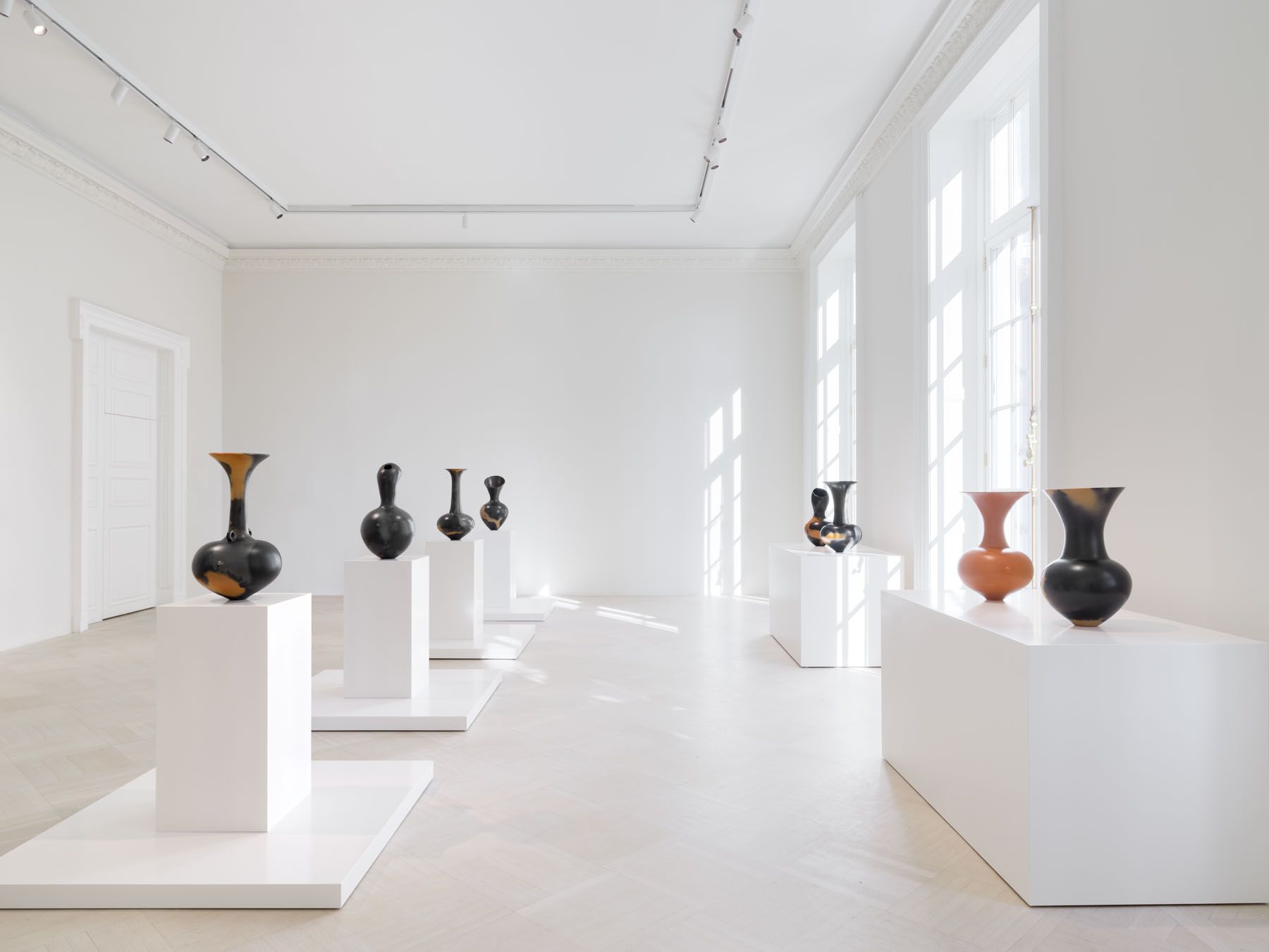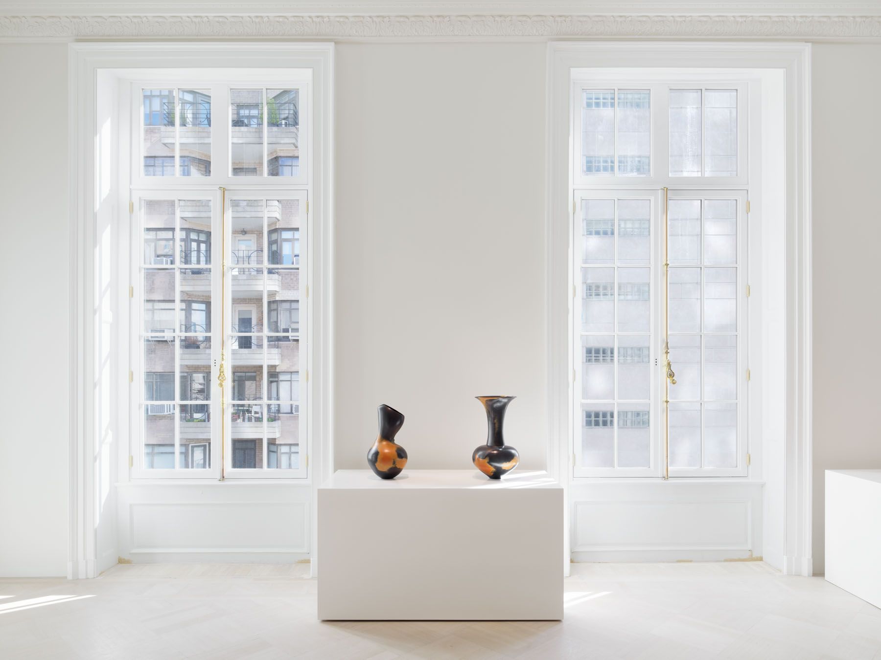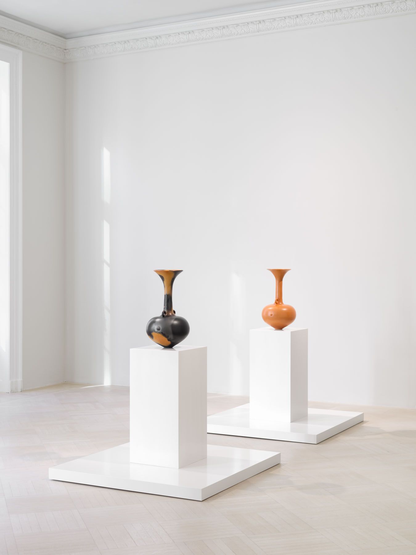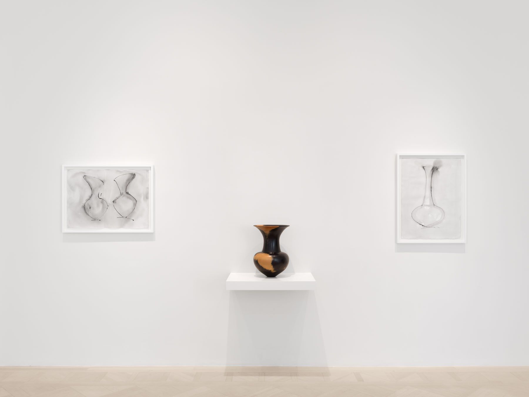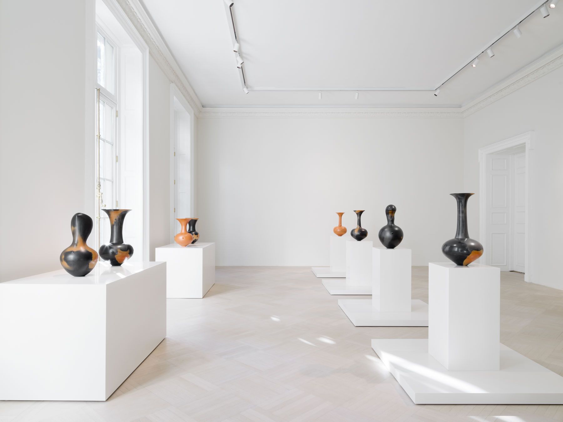 A constant traveler, student, and teacher, Odundo embraces practices from multiple civilizations and time periods: the ancient Greek and Roman technique of terra sigillata (adding a clay slip to the surface), for one; the burnishing of blackware in both Uganda, where she participated in ethnographic fieldwork, and with the work of women potters of Pueblo and San Ildefonso in Santa Fe, New Mexico. Odundo’s references range from Romanian master Constantin Brâncuși and the unglazed and hand-built pottery of the Nupe peoples of Nigeria, to Attic vases, Cycladic marble figures, the ruffs of Elizabethan dresses in sixteenth-century portraits, and the repose of a Degas dancer and beyond. In her words, “You work with clay fluidly and, once fired, it captures that particular gesture and arrests a stance.” In 2019, at The Hepworth Wakefield and Sainsbury Centre in Norwich, Odundo selected such objects spanning over 3,000 years to exhibit alongside some fifty of her vessels.