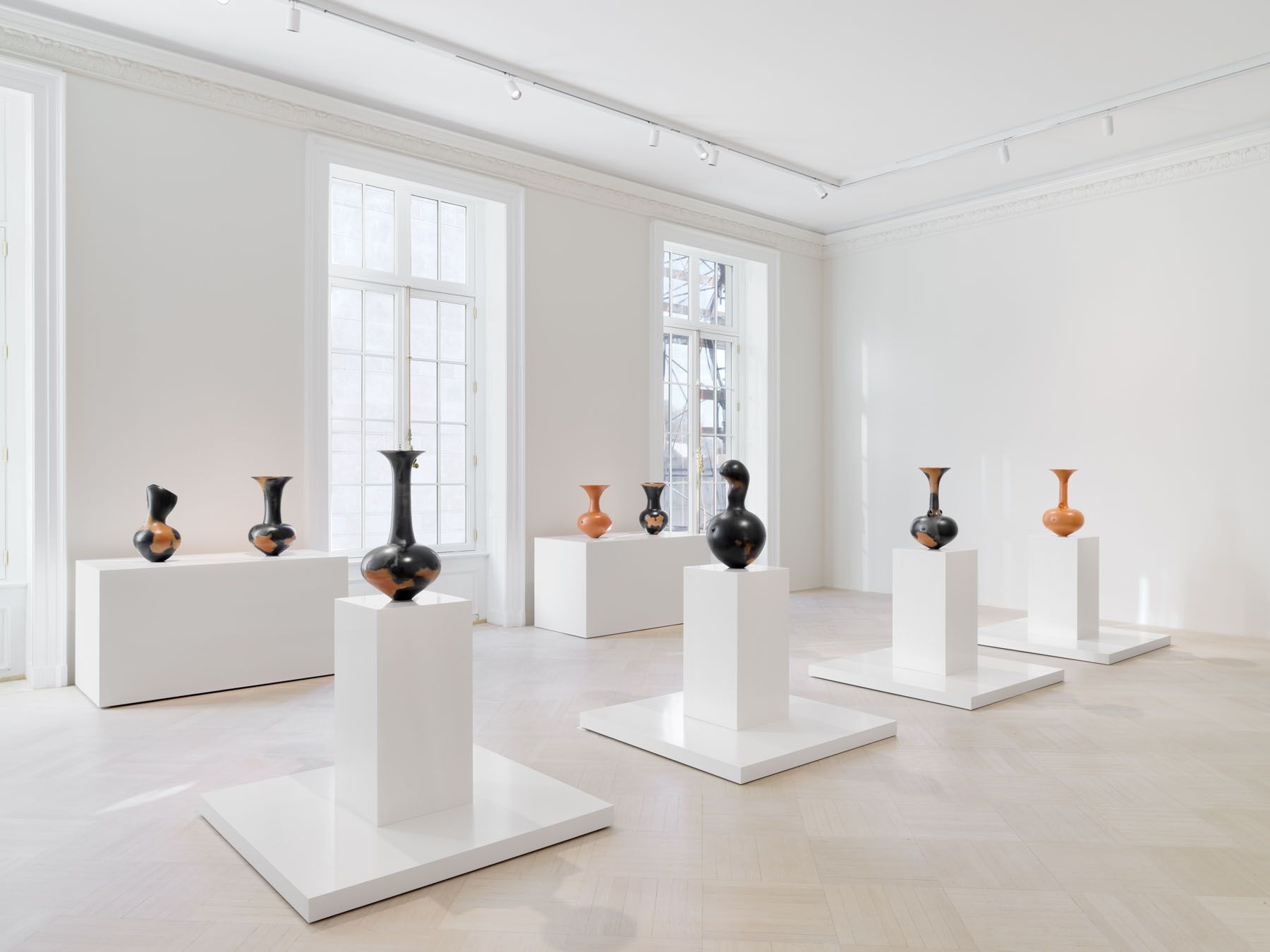 Odundo transcends the worlds of fine art and craft. Both putative vessels and abstract sculptures, her works are ceremonial and hint at the origins of function. Composed in elemental materials of English red clay and water, her seemingly effortless sculptures are months in the making. Odundo does not use a pottery wheel, but rather hand-builds her vessels with coils, an age-old technique she learned in the early 1970s from Nigerian women potters. Through a careful process of smoothing the surface and adding slip of the same clay, the British artist manipulates her medium when the clay is both soft and hard, alternating between symmetrical and asymmetrical forms.