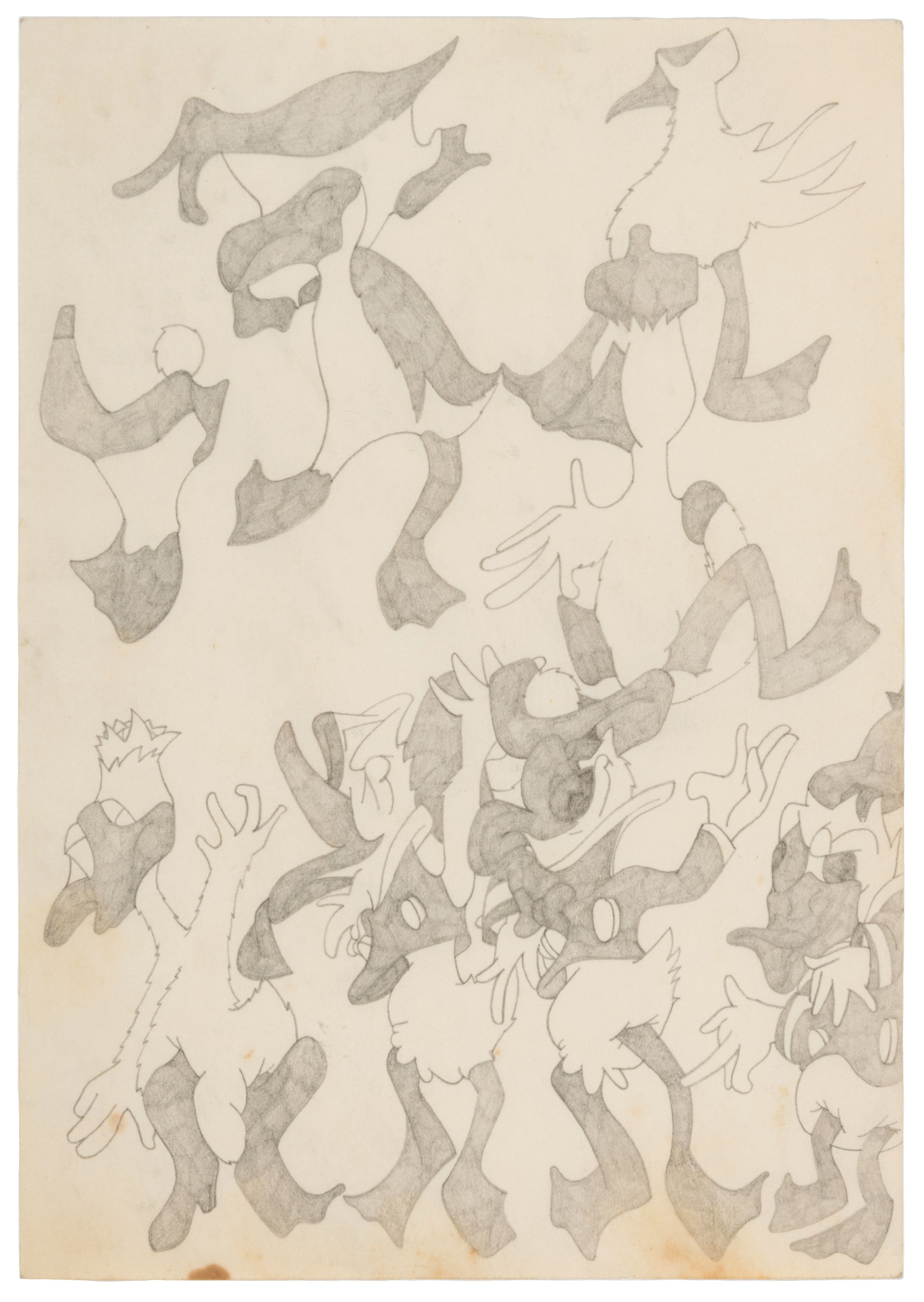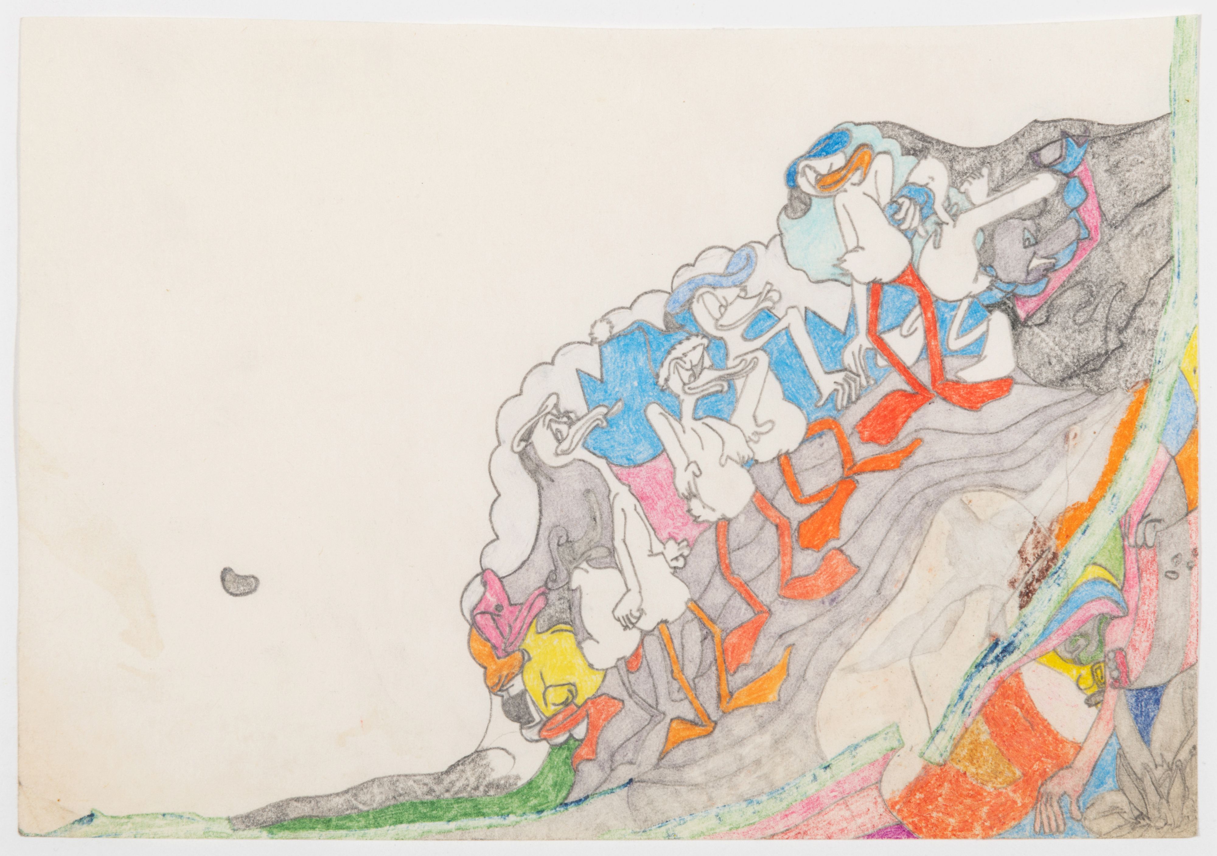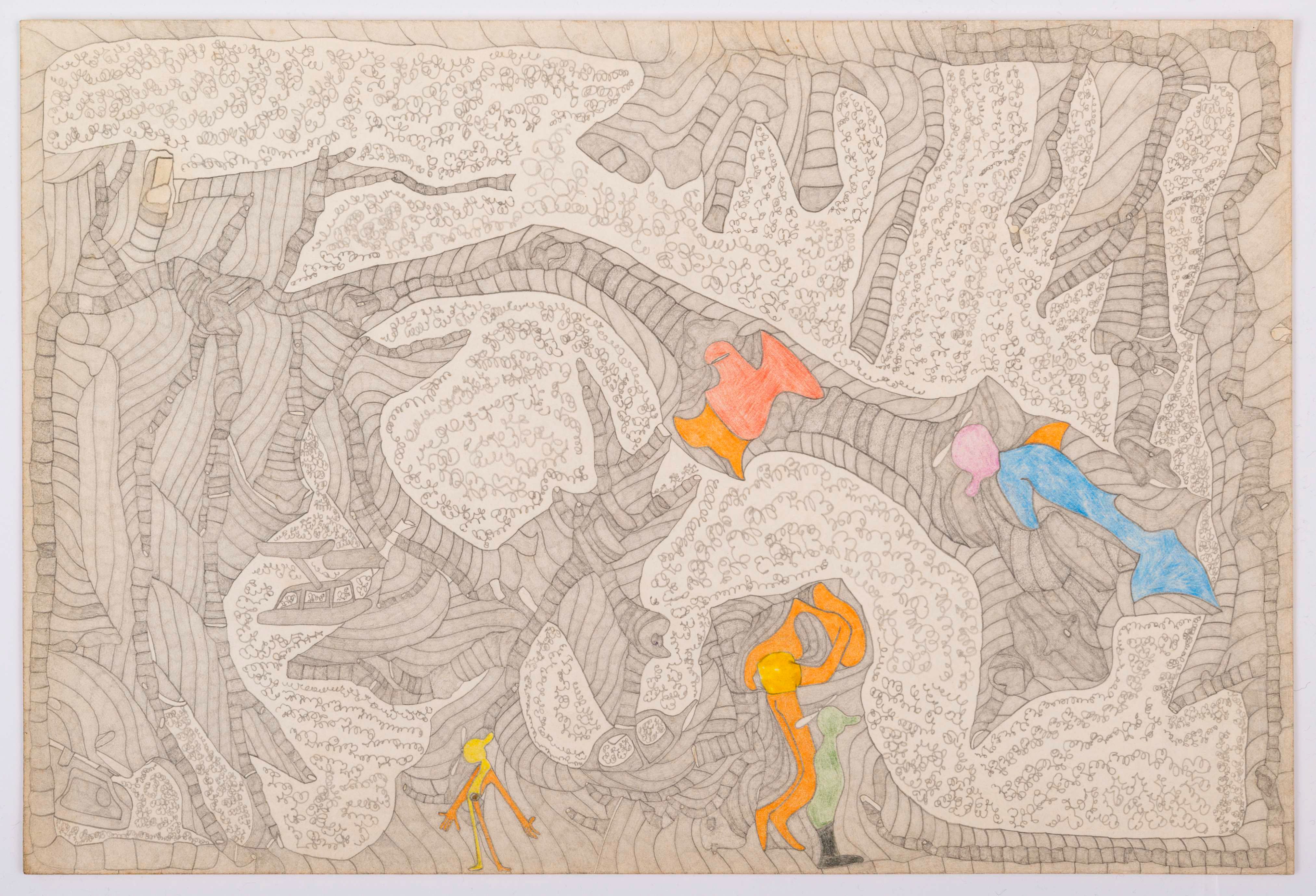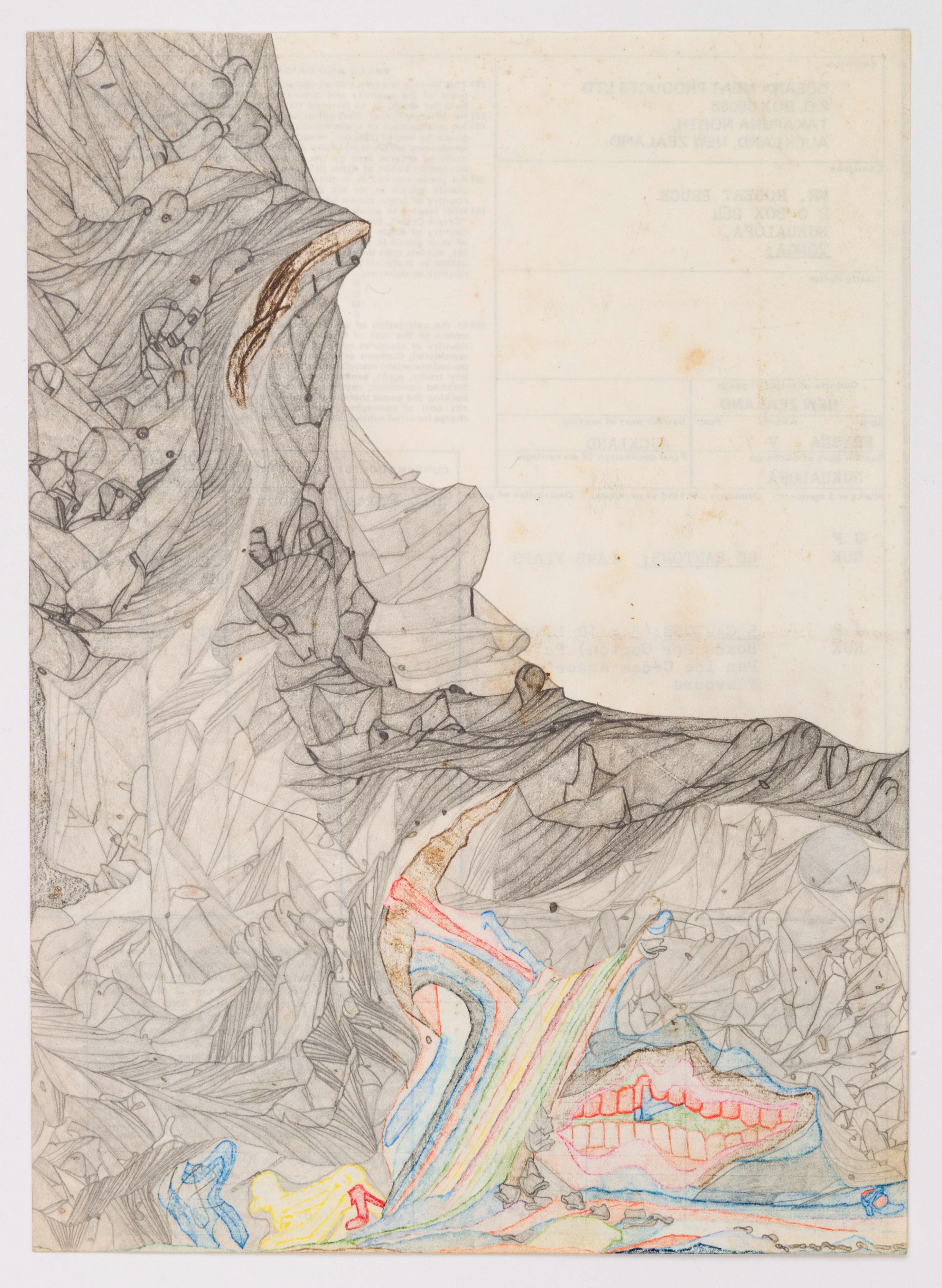 Although Susan Te Kahurangi King stopped speaking at the age of four, her prolific drawing practice distills observations of natural forms and popular culture in haunting images which defy interpretation. Whether through whimsical topographies of biomorphic shapes or mounds of compressed cartoon bodies, King’s drawings in graphite, pencil, crayon and ink express a singular vision of the world around her.