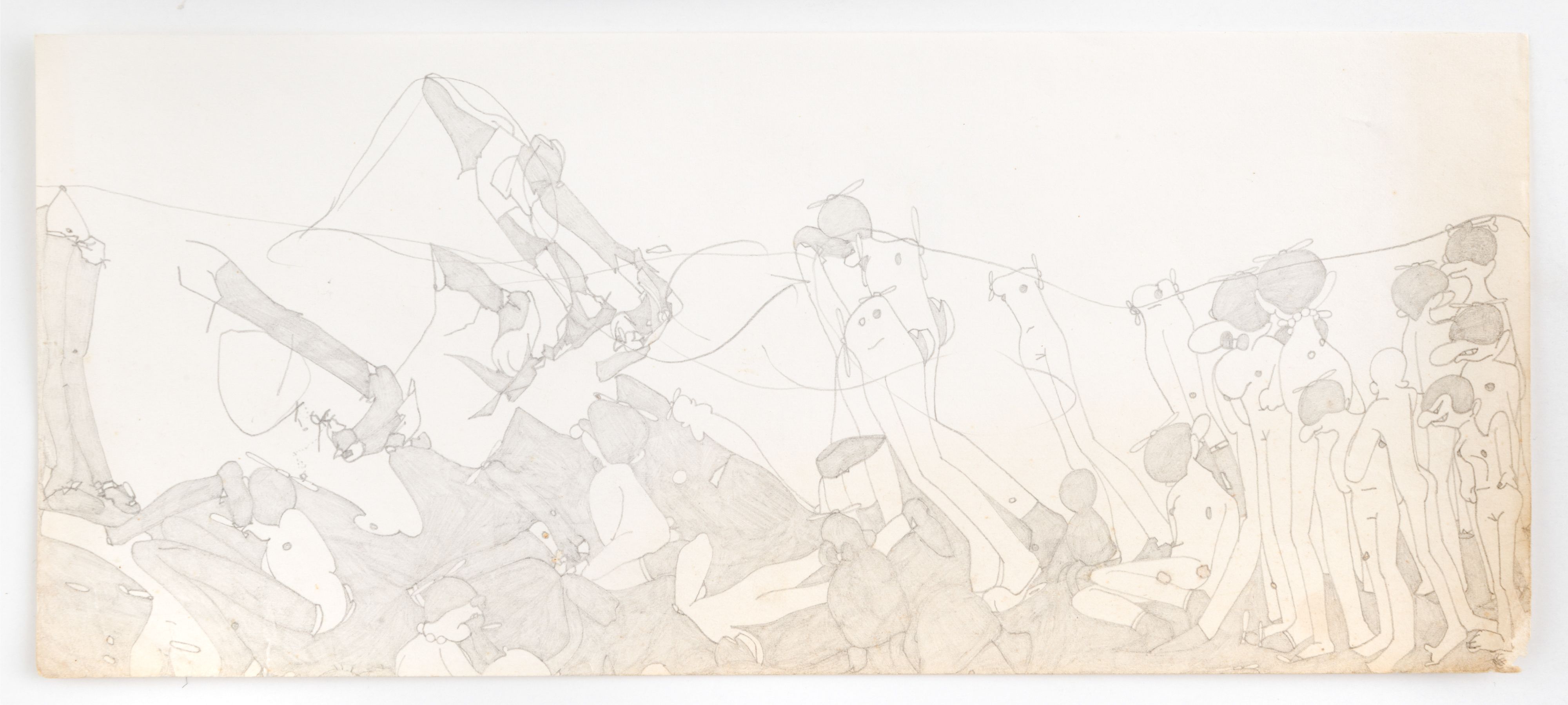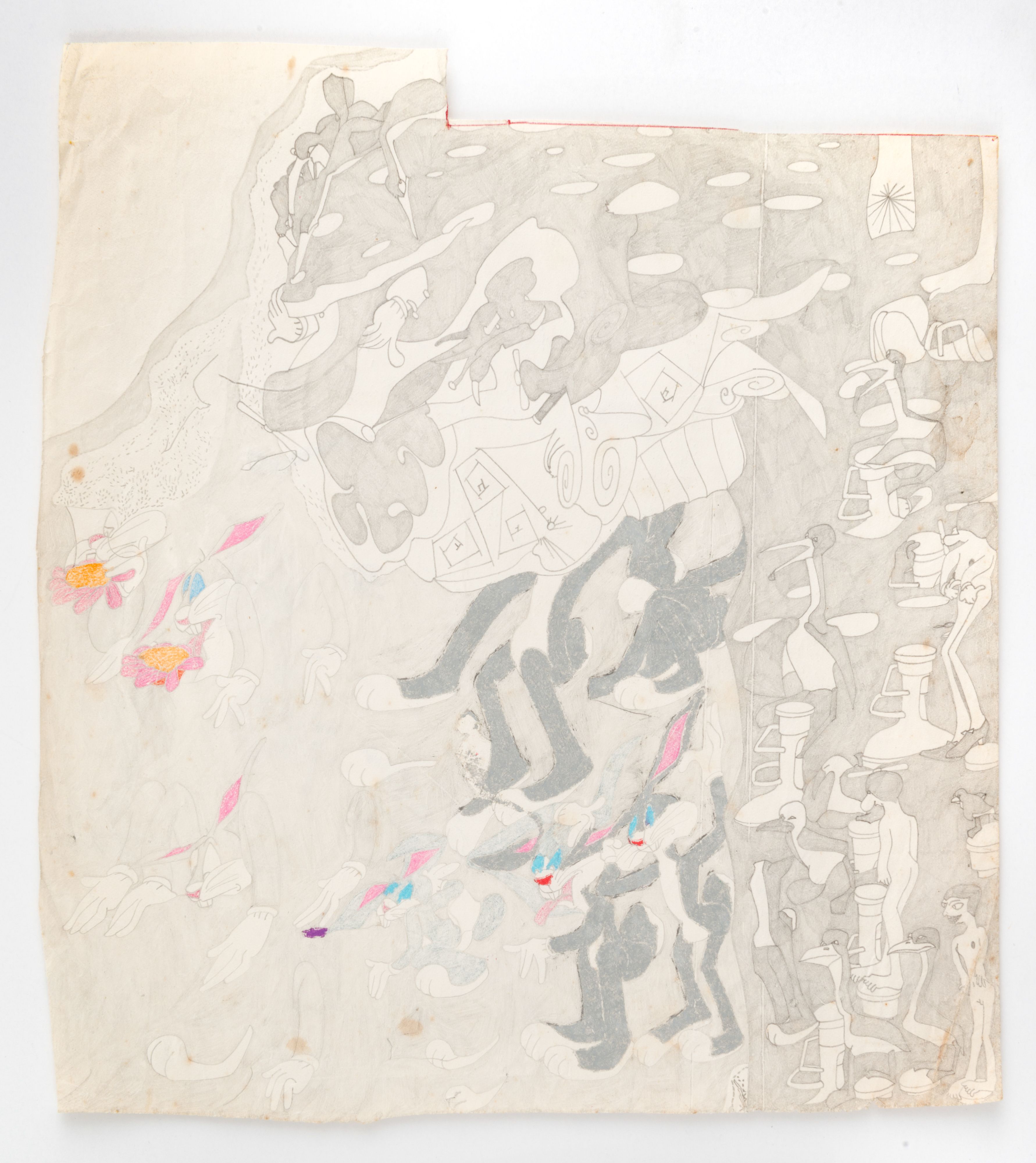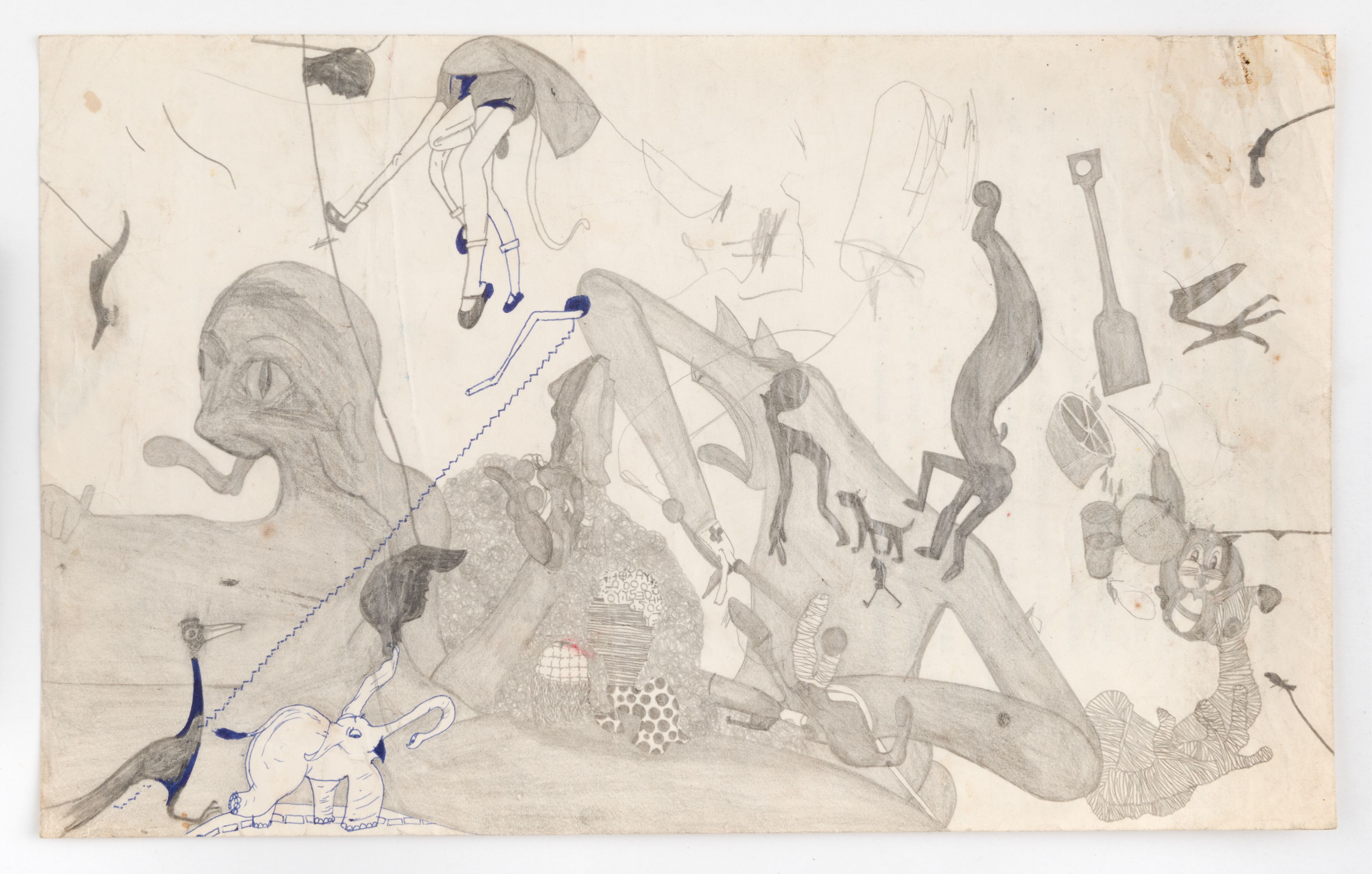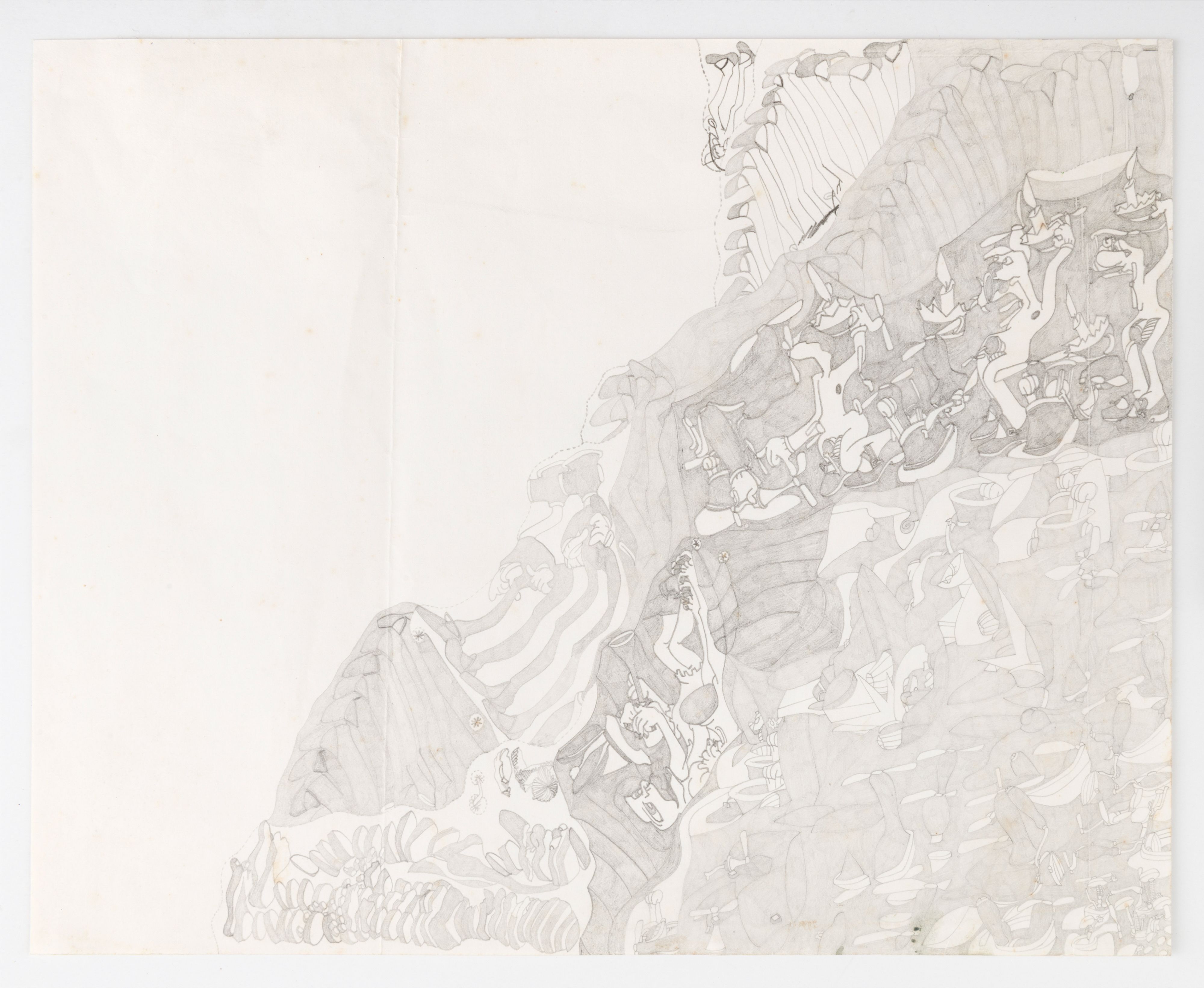 Although Susan Te Kahurangi King stopped speaking at the age of four, her prolific drawing practice distills observations of natural forms and popular culture in haunting images which defy interpretation. Whether through whimsical topographies of biomorphic shapes or mounds of compressed cartoon bodies, King’s drawings in graphite, pencil, crayon and ink express a singular vision of the world around her.