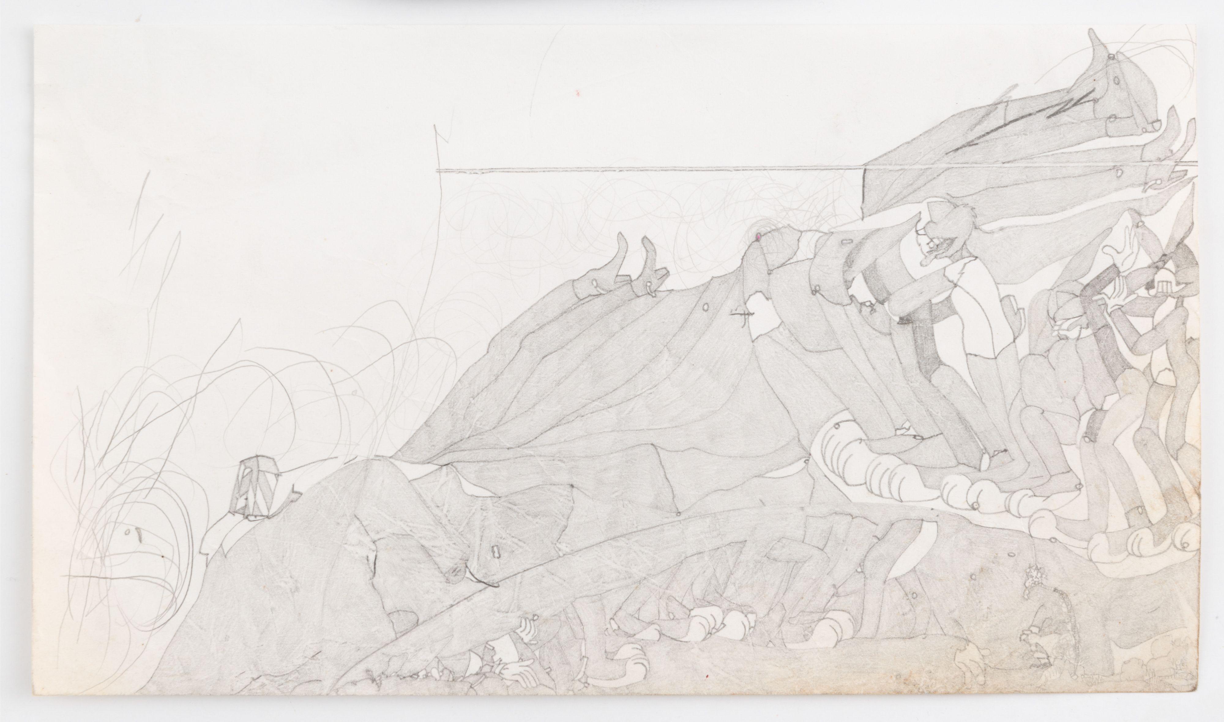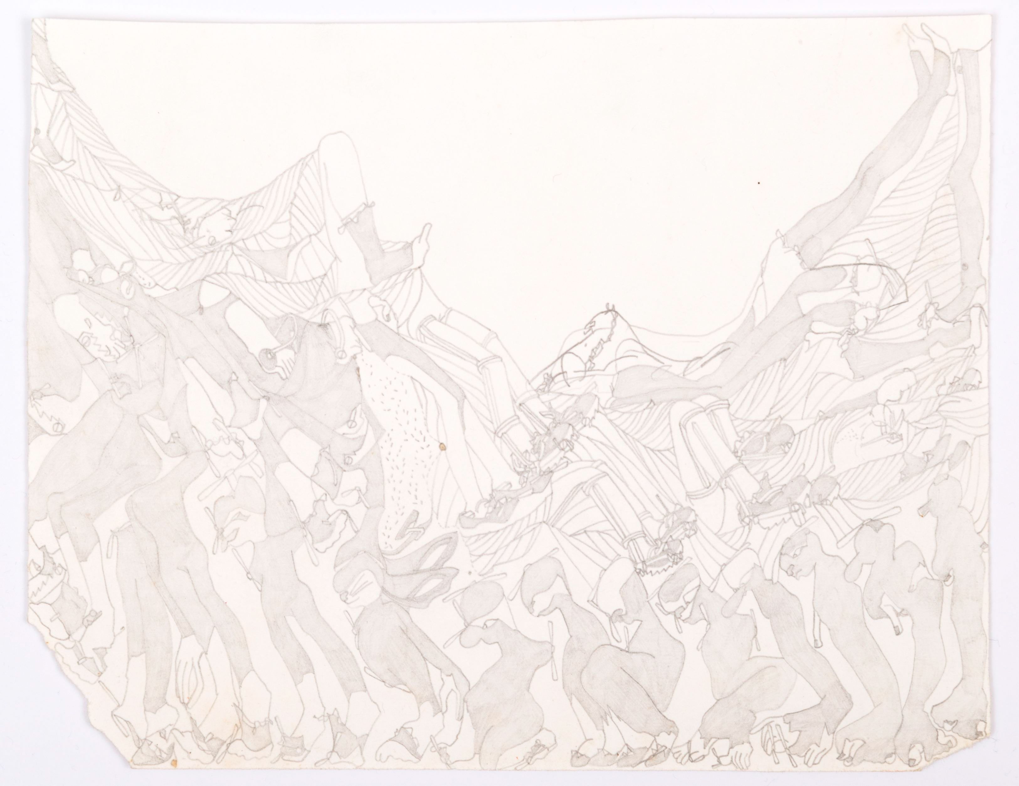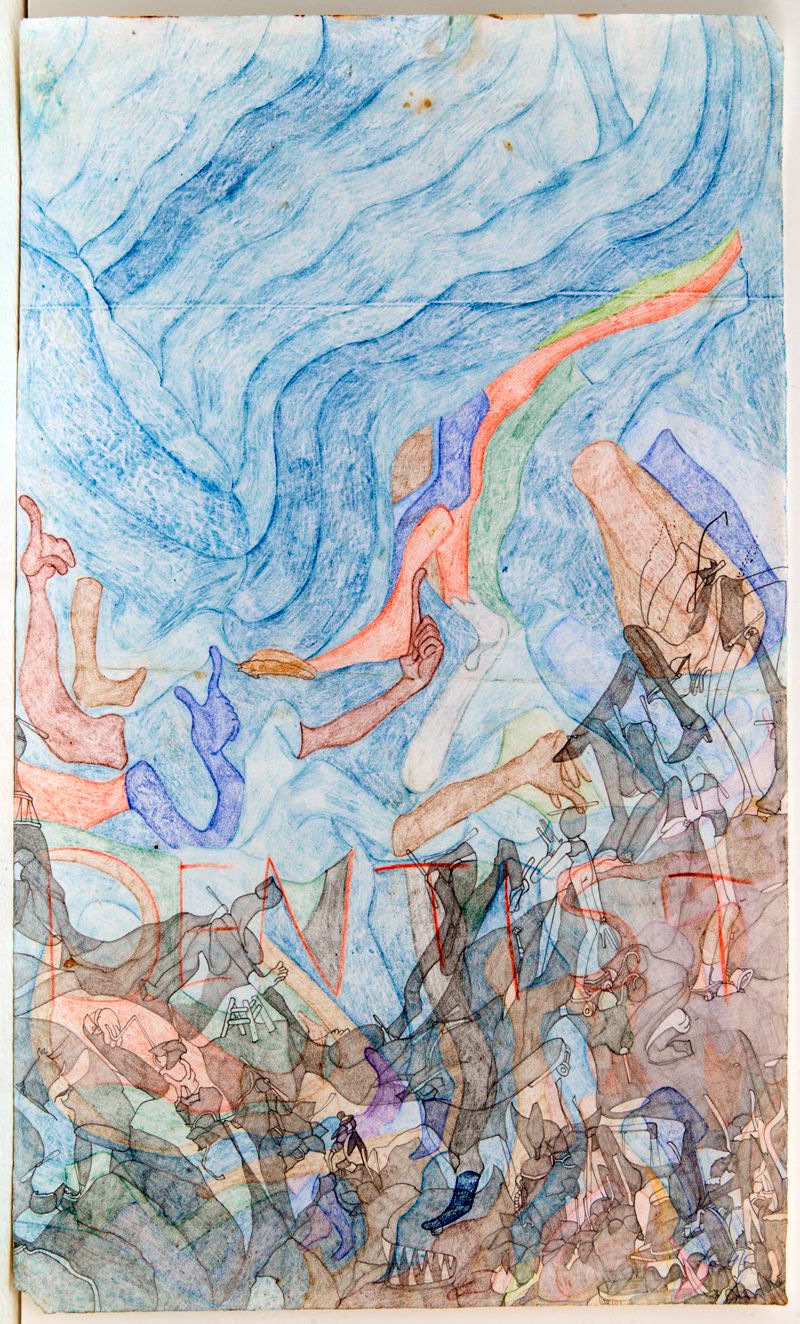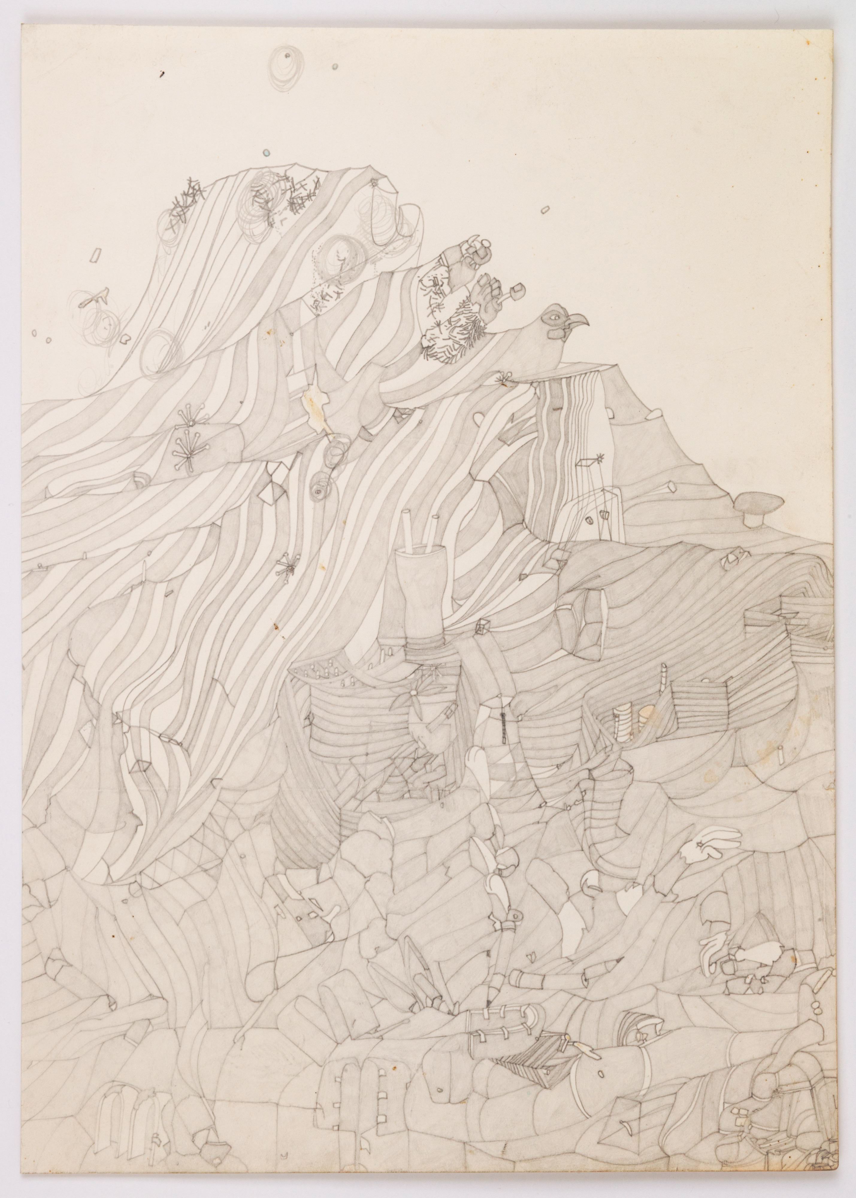 Although Susan Te Kahurangi King stopped speaking at the age of four, her prolific drawing practice distills observations of natural forms and popular culture in haunting images which defy interpretation. Whether through whimsical topographies of biomorphic shapes or mounds of compressed cartoon bodies, King’s drawings in graphite, pencil, crayon and ink express a singular vision of the world around her.