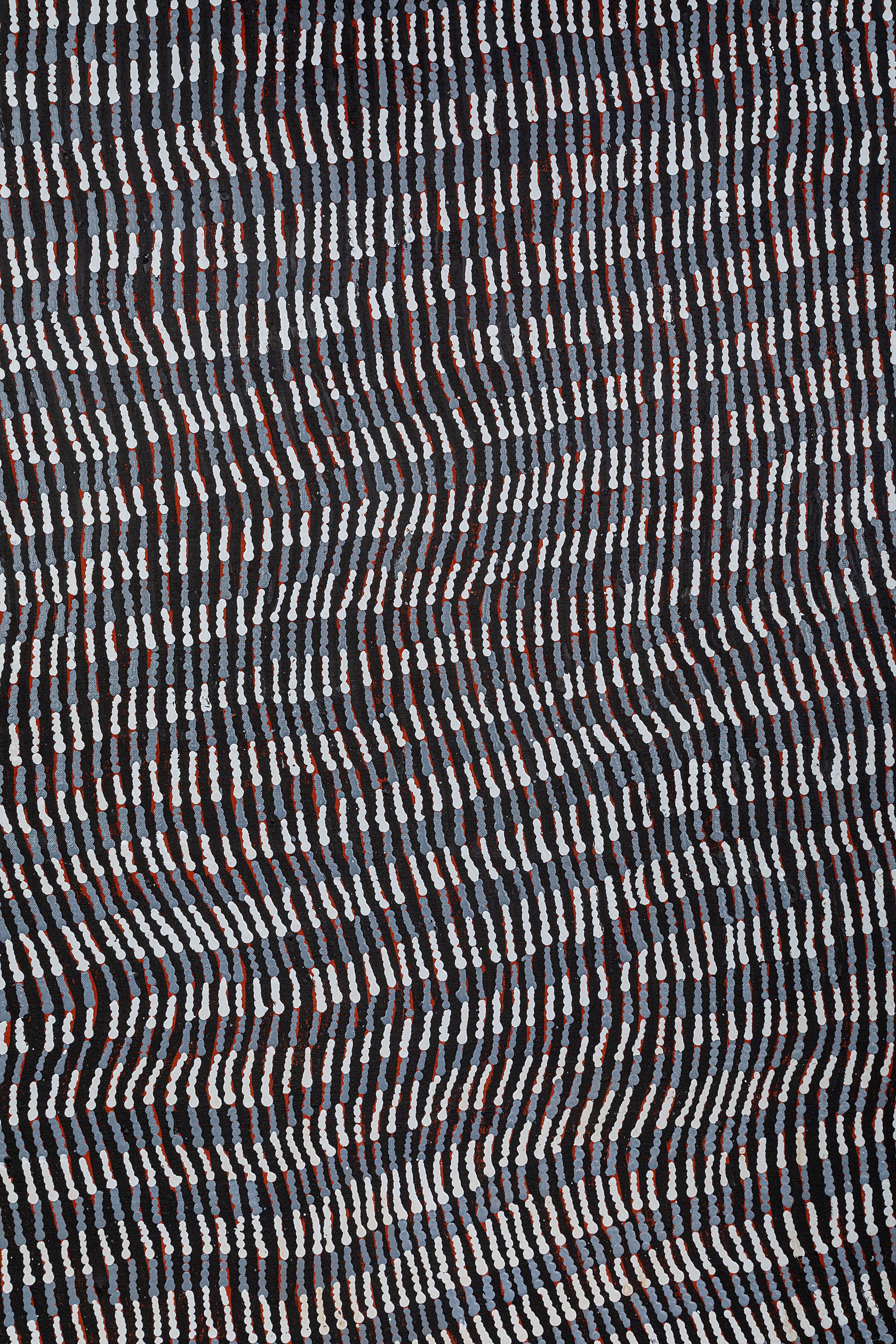 Mantua Nangala’s Dreamings are associated with the secret Tingari ceremonies at the site of Tjulna, located South-East of Kiwirrkura, and other sites. While this Tingari Dreaming is traditionally painted in black and white, Nangala uses color that typifies the topography during the changing seasons, including the drought and flood cycles.