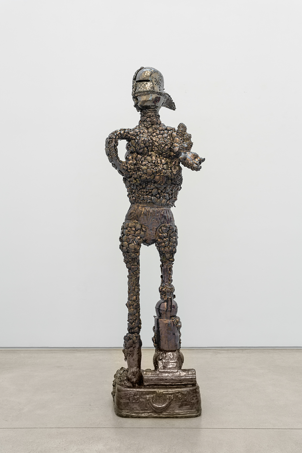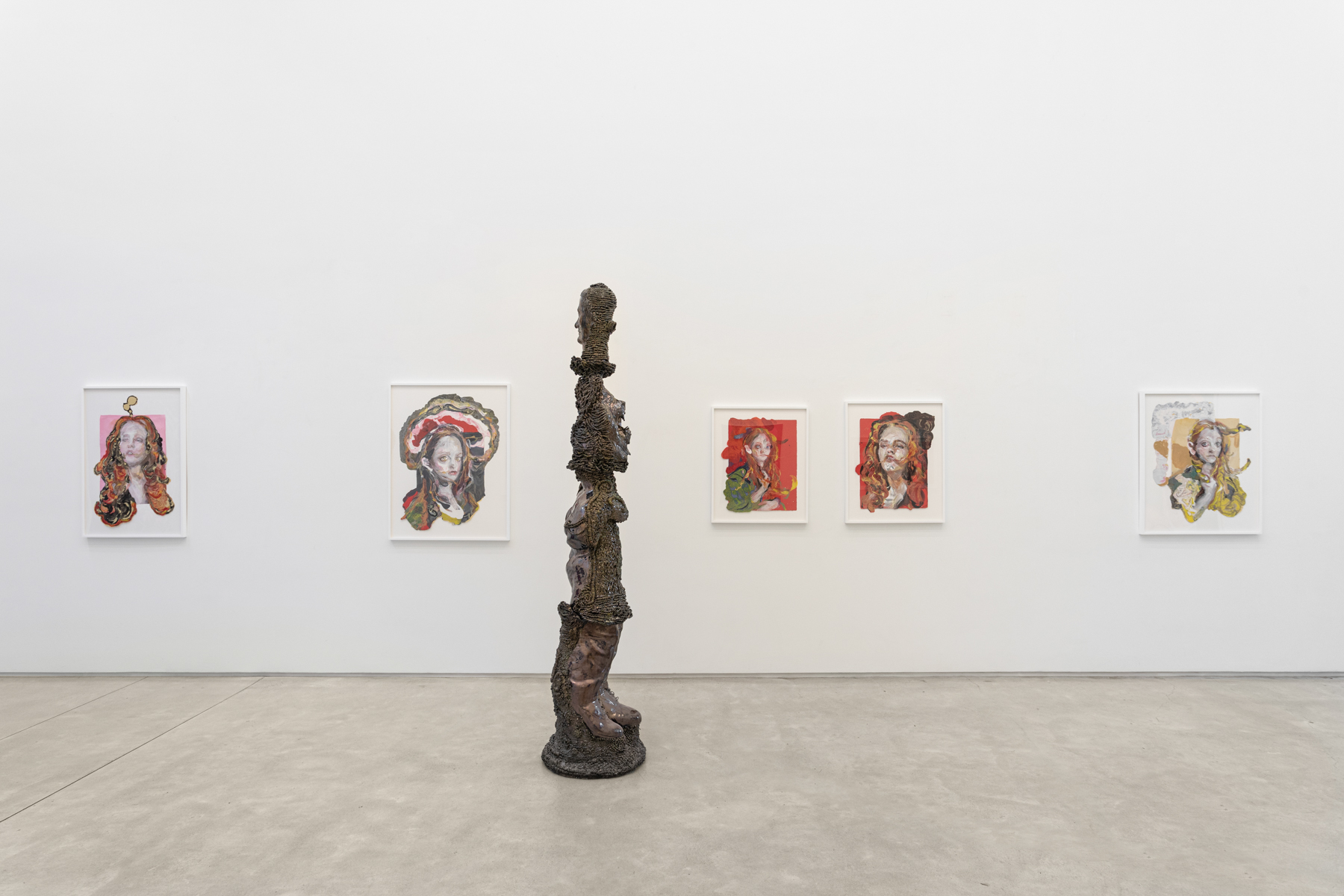 Similarly, Francesca DiMattio’s new porcelain sculptures combine elements of animal and human, masculine and feminine, classical and contemporary, high and low art. Mimicking the Caryatids of ancient Greece, these architectural totems defy easy categorization. While the history of ceramics remains her starting point, DiMattio’s sources range from second century BC bronze memorials to everyday utilitarian forms such as a pillow or suitcase. As with her paintings, DiMattio transposes traditional techniques from the history of craft such as basket weaving, wedding dress appliqué, and even shell art into intricate porcelain ropes and pebble-like jewels or other encrusted surfaces. In using traditionally “female” references and techniques, DiMattio rebrands how we see the feminine. Elements typically taken for adornment or decoration are translated into large imposing forms that embody strength. Contemporary kitsch similarly infiltrates her work and DiMattio enthusiastically embraces excess in order to push discordant visual connections and disrupt preconceived histories.