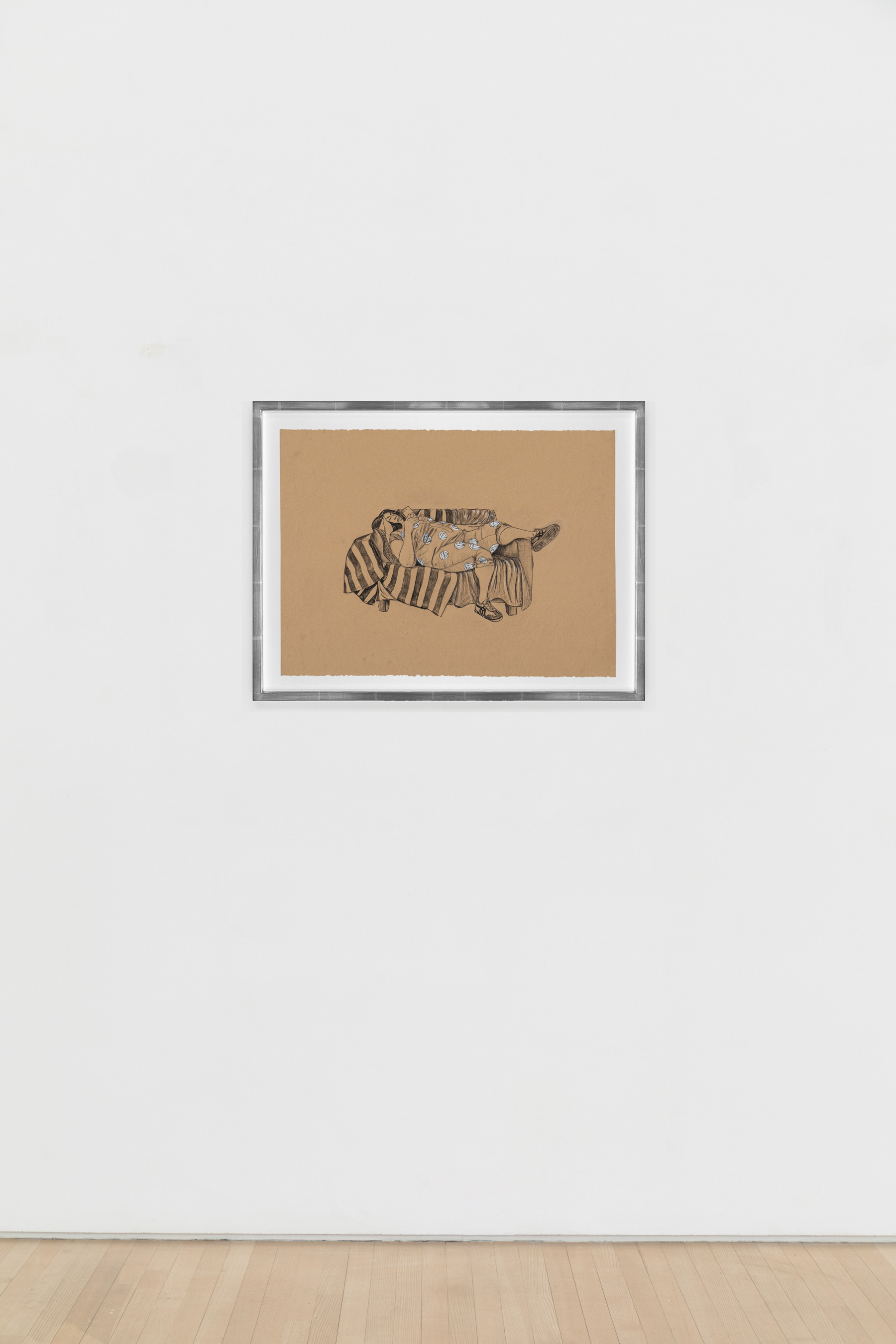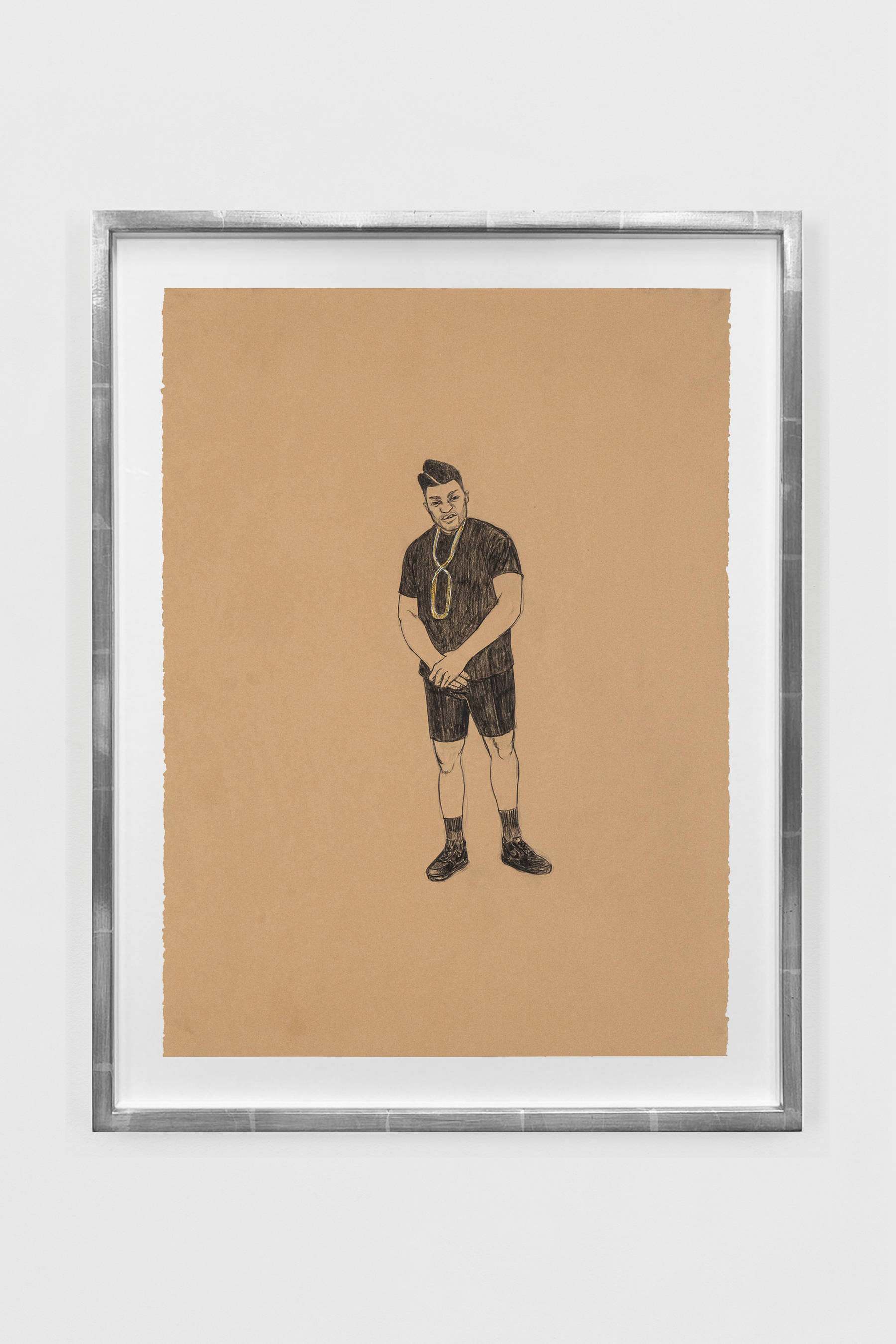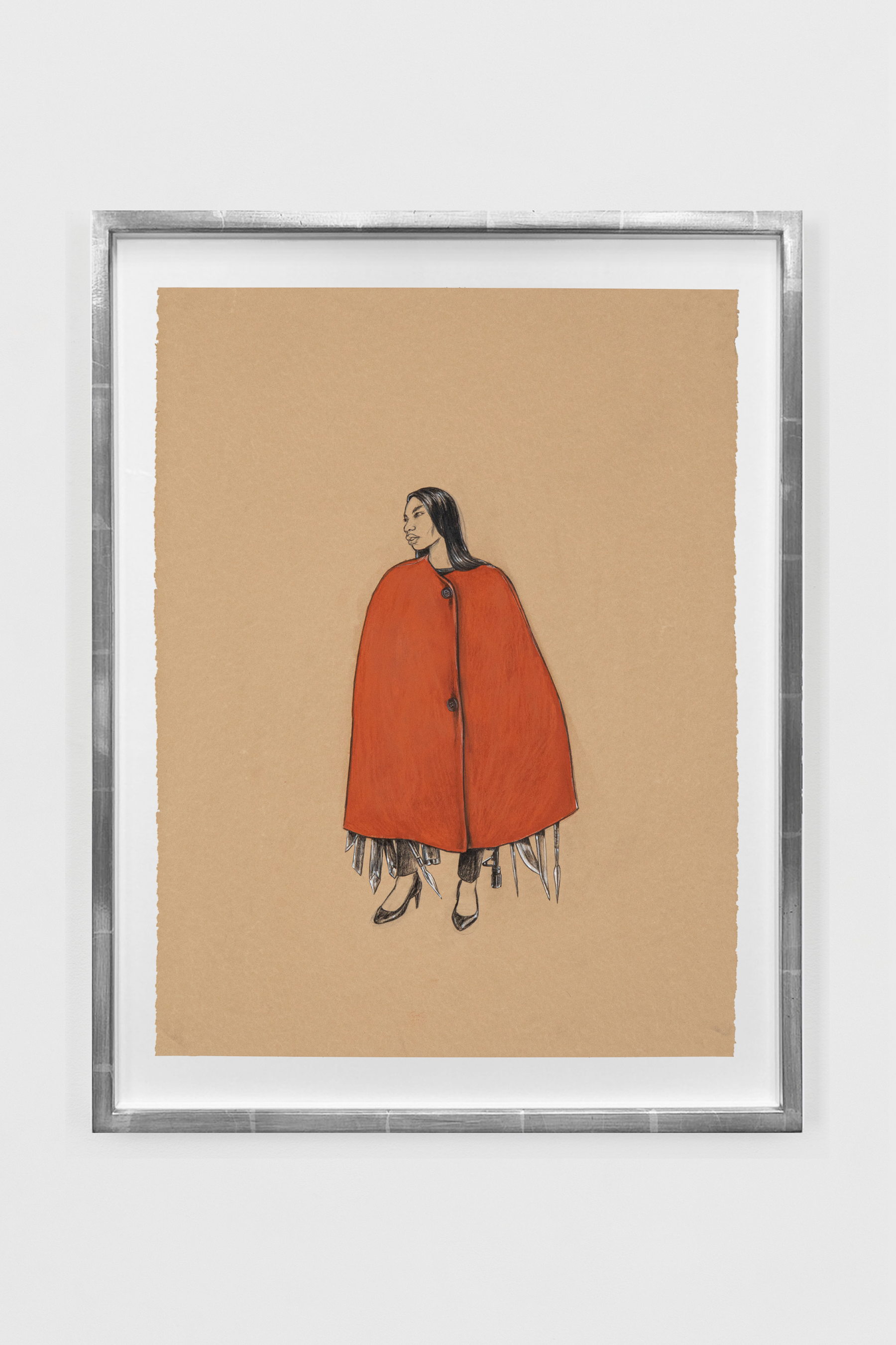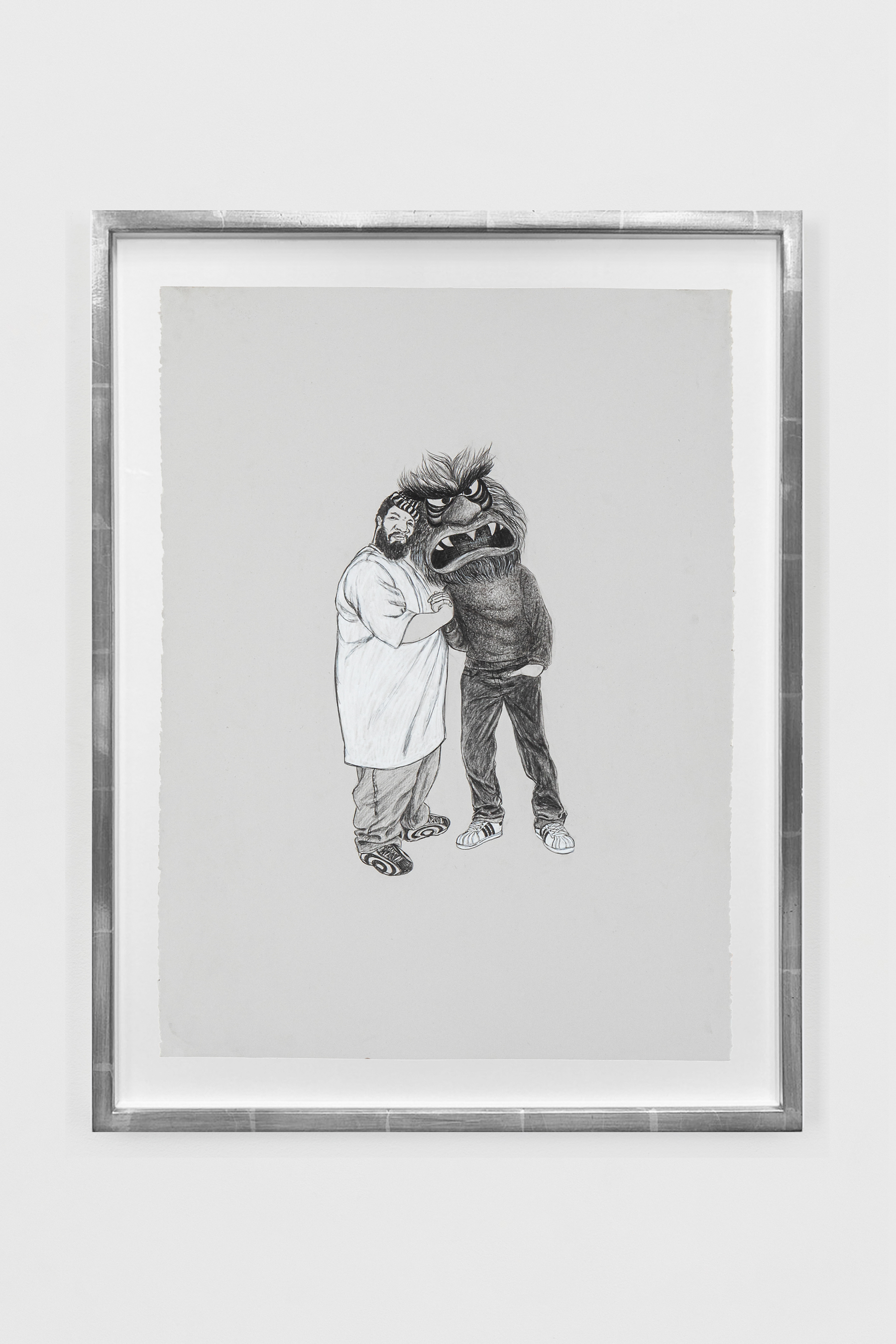 Robert’s drawings can be humorous, too, but that doesn’t mean they’re not serious. One figure’s red poncho hides a cache of weapons—sharp ends and gun muzzles peeking out the bottom. In another, an absurdist unicycle/stool hybrid holds a man’s head captive—its slender steel bars reminiscent of a jail. Robert constantly plays with and subverts expectations, making multiple viewings a must.