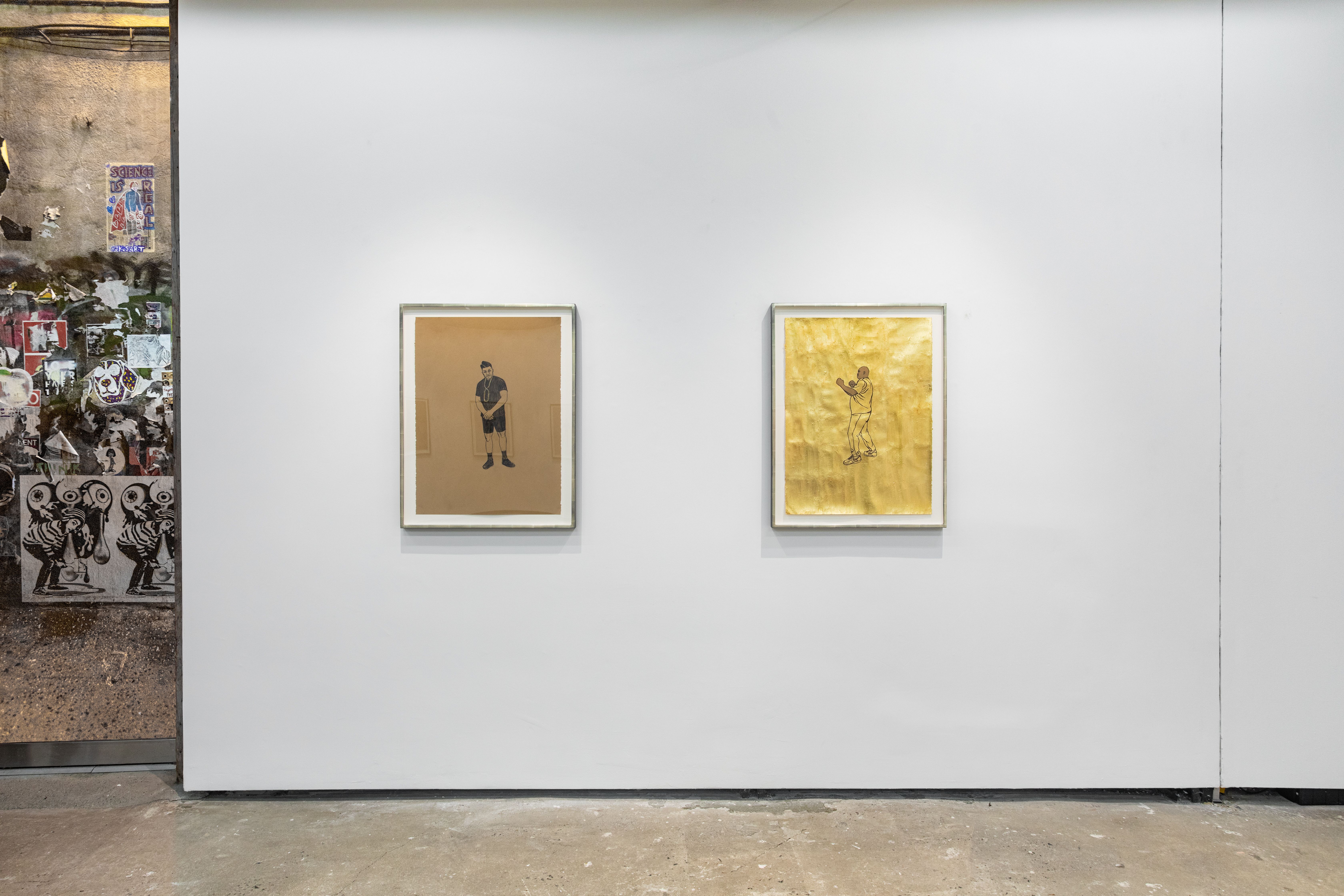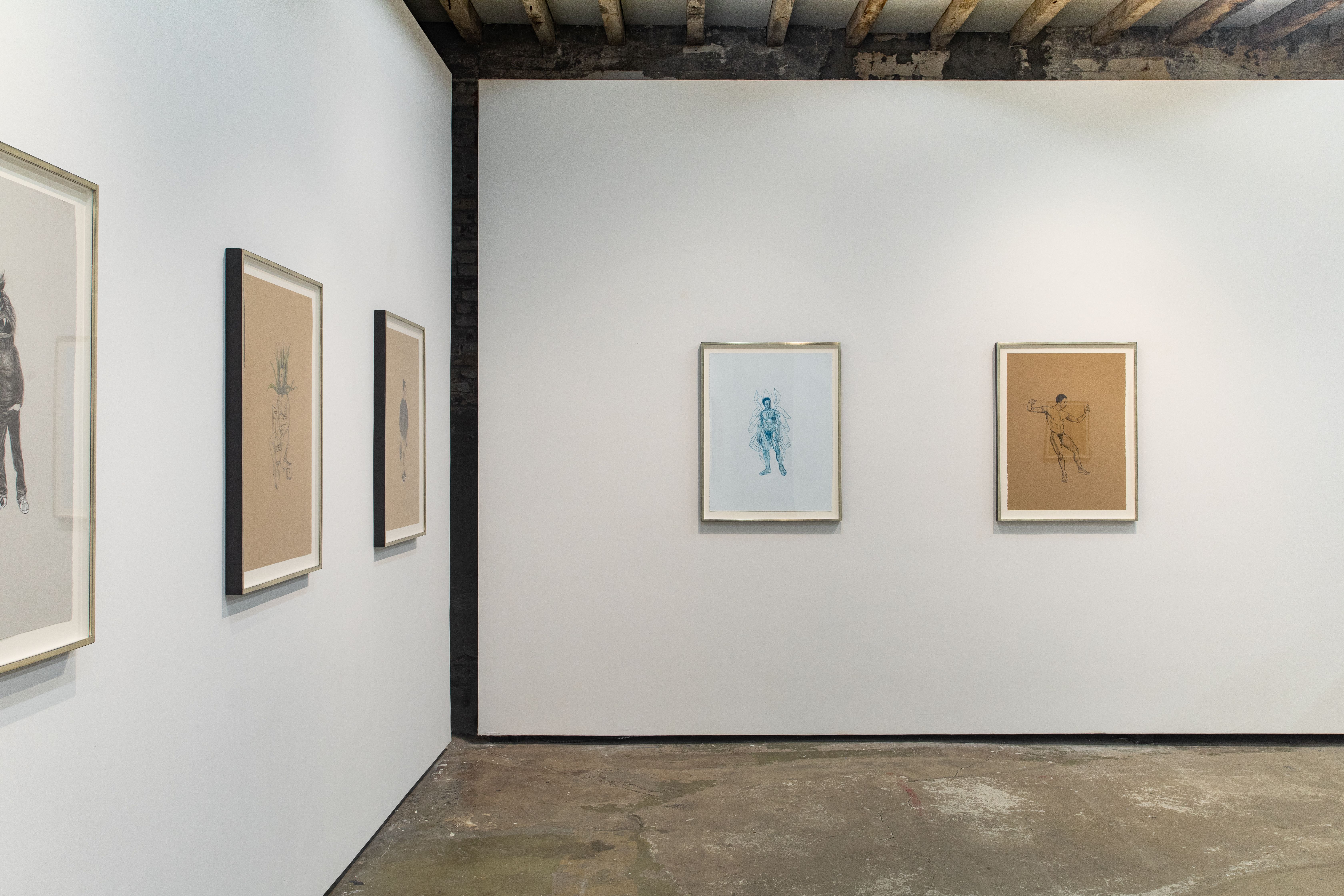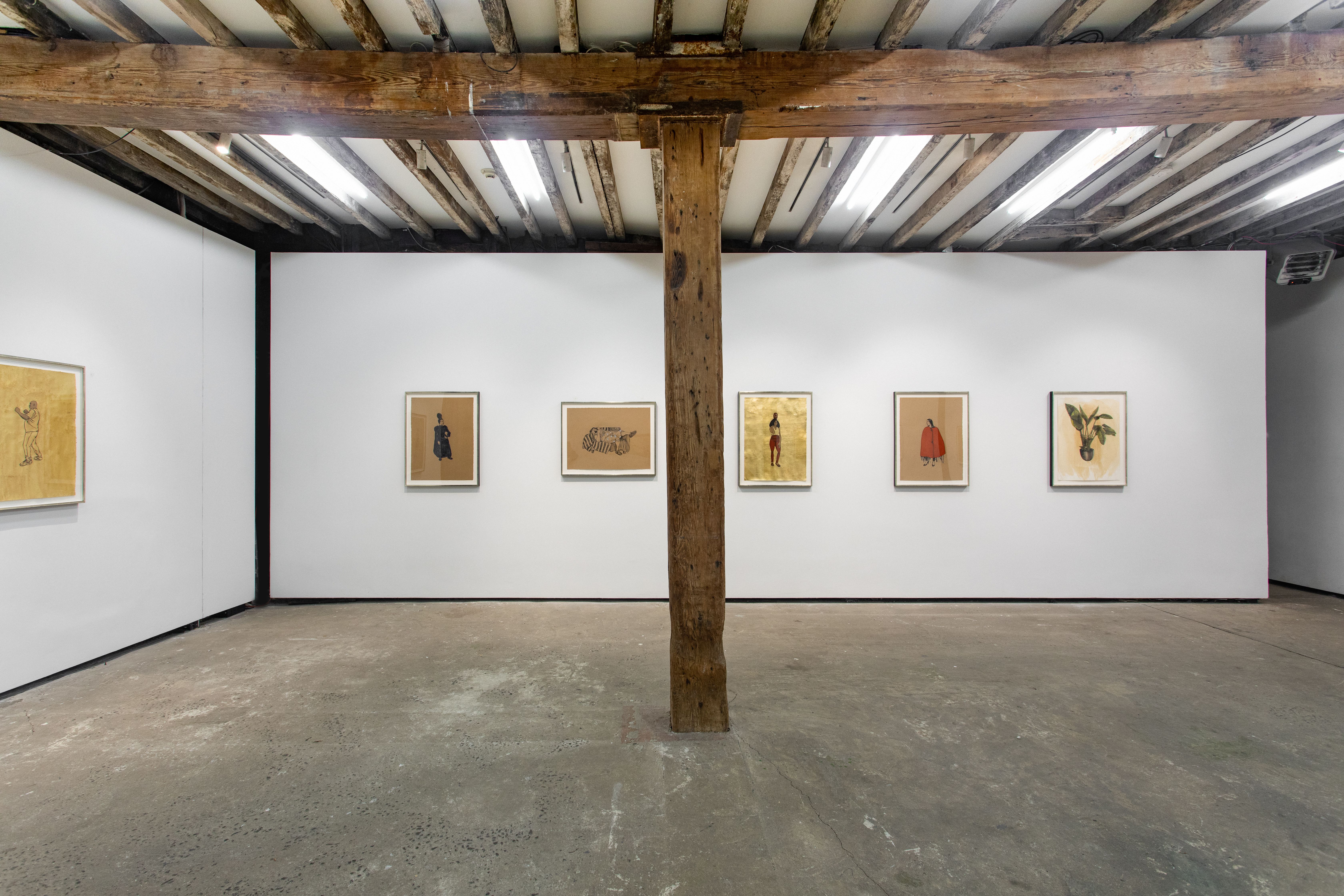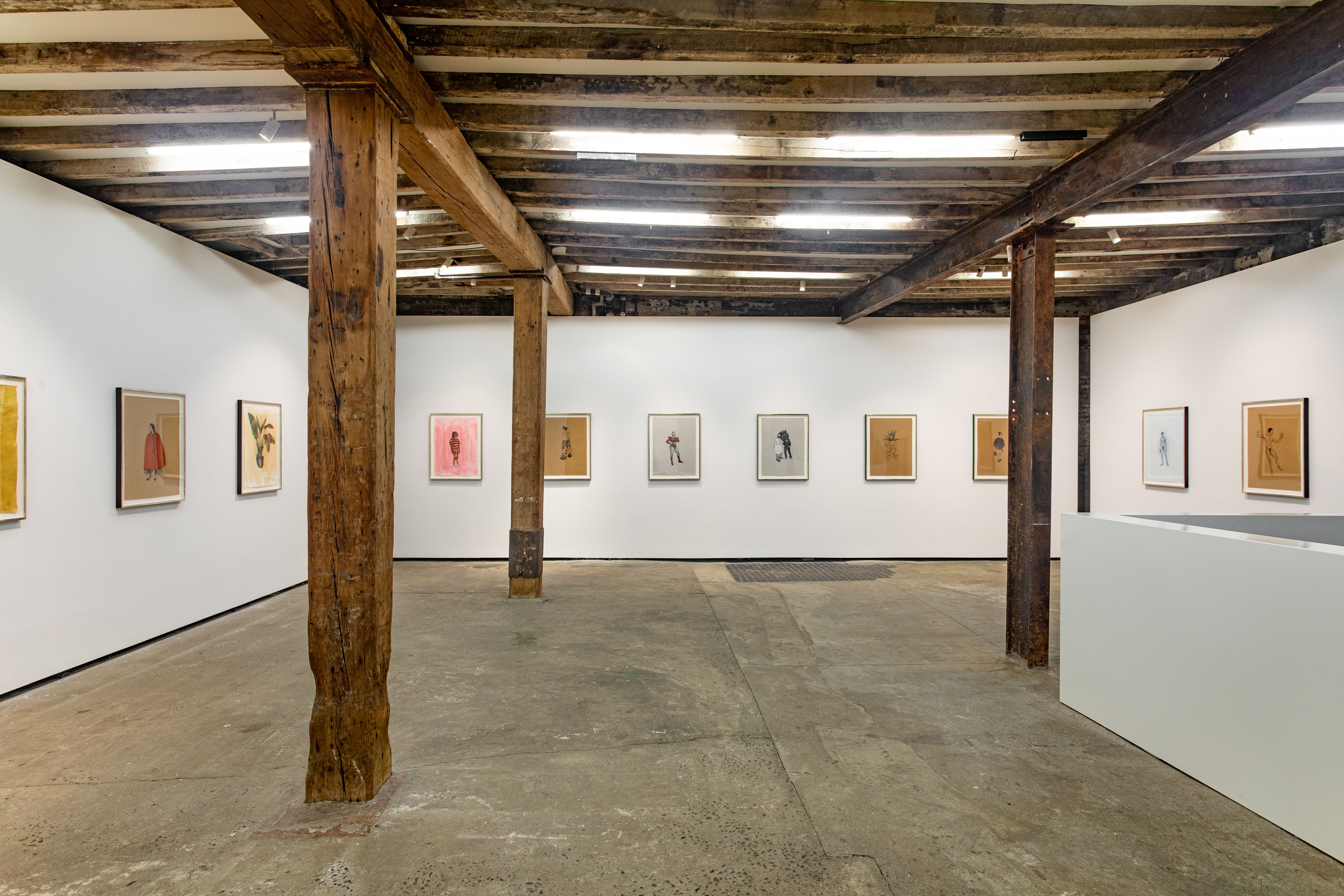 Robert’s drawings can be humorous, too, but that doesn’t mean they’re not serious. One figure’s red poncho hides a cache of weapons—sharp ends and gun muzzles peeking out the bottom. In another, an absurdist unicycle/stool hybrid holds a man’s head captive—its slender steel bars reminiscent of a jail. Robert constantly plays with and subverts expectations, making multiple viewings a must.